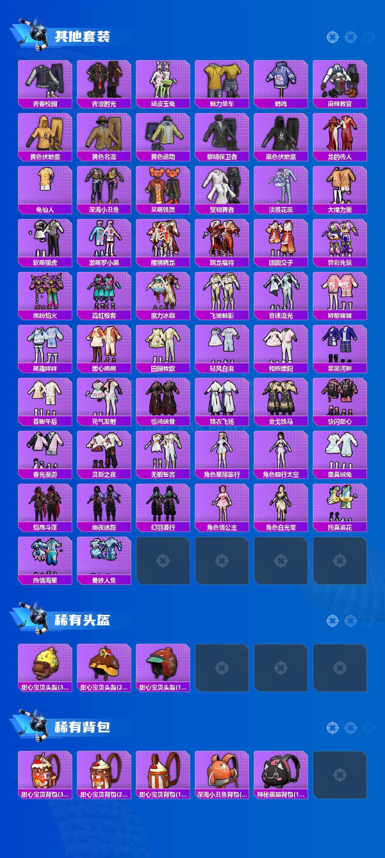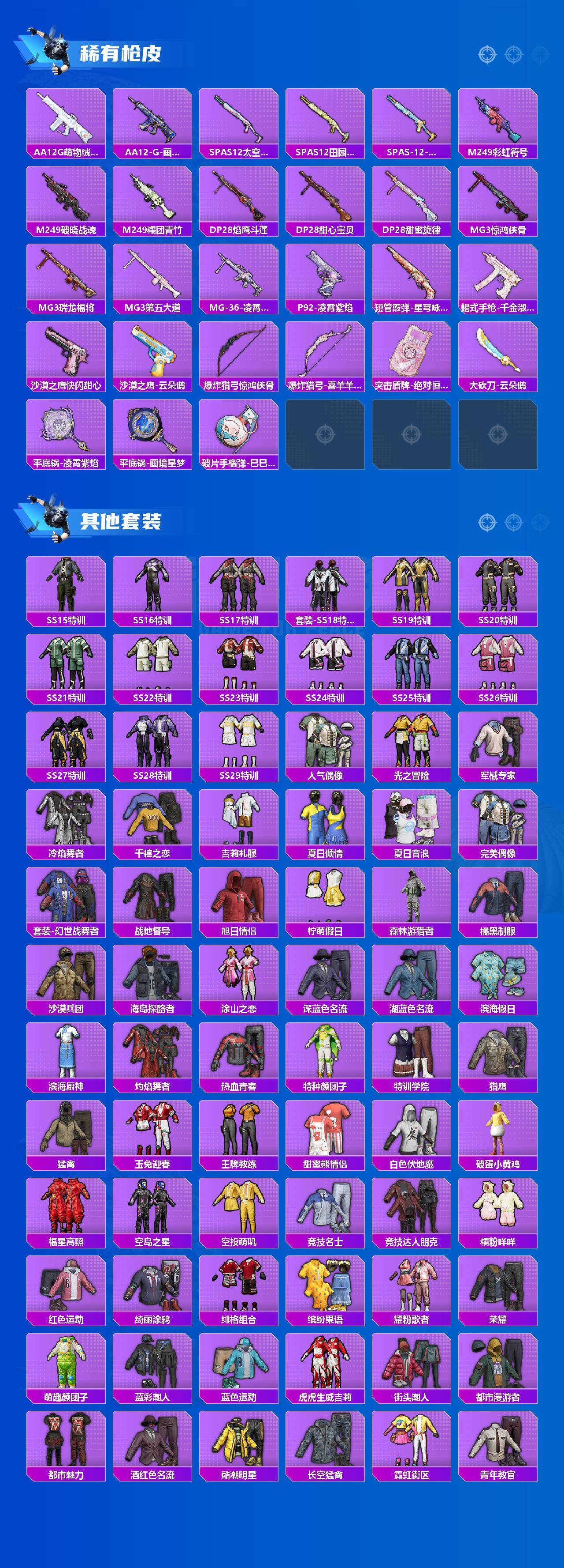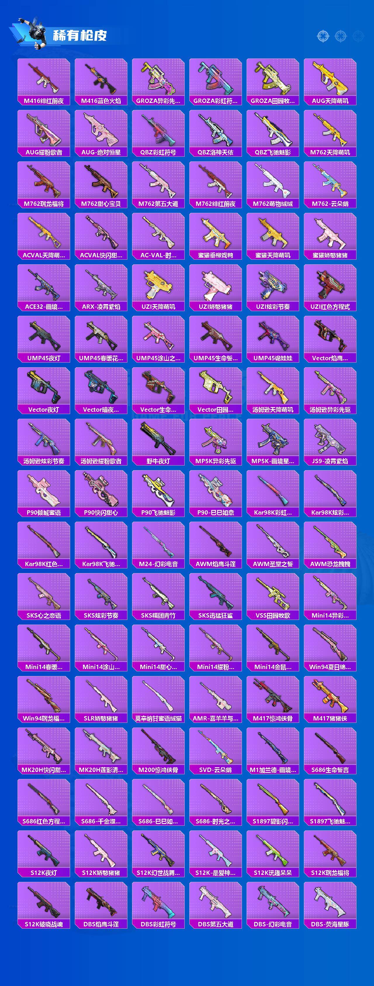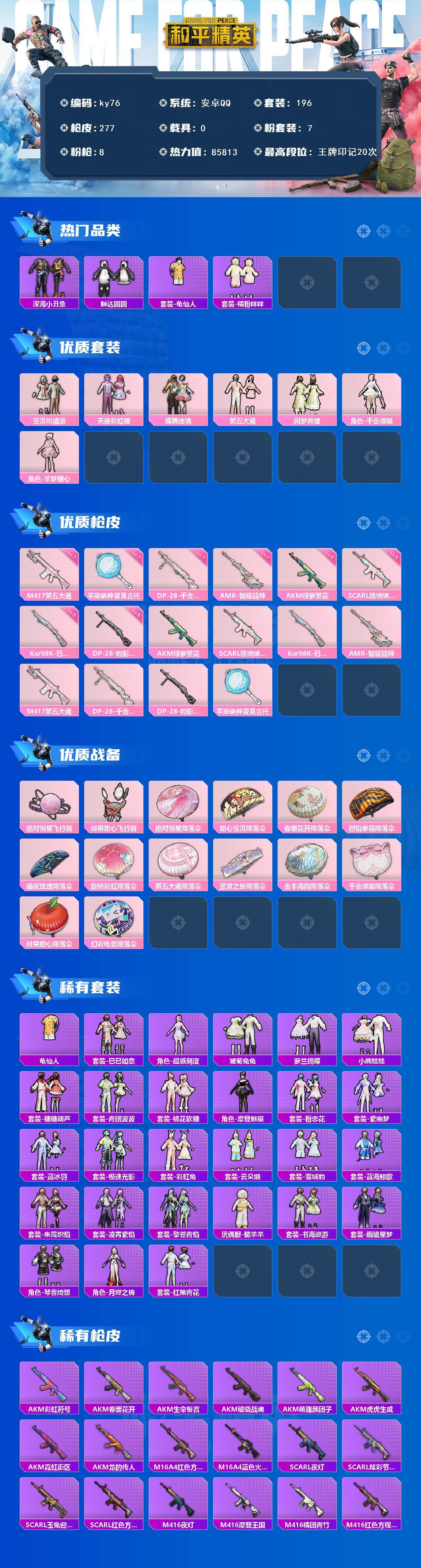 [16704013]安卓 手q-7粉装-8特效呛-0载具-3粉色飞行器-85813热力值-20王牌印记-196套装-277呛皮 【热门品类】:套装-深海小丑鱼,套装-胖达圆圆,套装-龟仙人,套装-糯粉咩咩 【粉色套装】:粉装-宝贝奶油派,粉装-天使彩虹糖,粉装-蝶舞迷情,粉装-第五大道,粉装-闲梦青缨,角色-千金淑猫,角色-羊梦糖心 【粉色呛皮等级】:akm-绿萝繁花五级,scar-l-锦绣绵绵五级,kar98k-巳巳如意五级,amr-智耀战神七级,m417-第五大道七级,dp-28-千金淑猫七级,dp-28-豹影疾电五级,平底锅-仲夏莫吉托七级 【粉色呛皮】:akm-绿萝繁花,scar-l-锦绣绵绵,kar98k-巳巳如意,amr-智耀战神,m417-第五大道,dp-28-千金淑猫,dp-28-豹影疾电,平底锅-仲夏莫吉托 【粉色飞行器】:绝对恒星飞行器,绯果甜心飞行器 【粉色降落伞】:绝对恒星降落伞,甜心宝贝降落伞,春暖花开降落伞,烈焰拳霸降落伞,暗夜玫瑰降落伞,旋转彩虹降落伞,第五大道降落伞,圣堂之誓降落伞,金丰海韵降落伞,千金淑猫降落伞,绯果甜心降落伞,幻彩电音降落伞,炫彩糖果降落伞 【稀有套装】:套装-龟仙人,套装-巳巳如意,角色-超感刻度,套装-雪国风尚,套装-炫彩糖果,套装-雏菊兔兔,套装-萝兰蝴蝶,套装-小熊娃娃,套装-糖糖葫芦,套装-青团波波,套装-棉花软糖,角色-摩登魅猫,套装-粉恋花,套装-紫幽梦,套装-蓝冰羽,套装-极速光影,套装-彩虹兔,套装-云朵鹅,套装-雪绒豹,套装-蓝海鲸歌,套装-朱霞炽焰,套装-凌霄紫焰,套装-擎苍青焰,玩偶服-懒羊羊,套装-书海巡游,套装-画境星梦,套装-琴音绮想,角色-月烬之祷,套装-红釉青花 【稀有呛皮】:aug-冰晶雪宝,akm-彩虹符号,akm-春暖花开,akm-生命誓言,akm-破晓战魂,akm-萌趣颜团子,akm-虎虎生威,akm-霓虹街区,akm-龙的传人,m16a4-红色方程式,m16a4-蓝色火焰,scar-l-夜灯,scar-l-炫彩节奏,scar-l-玉兔迎春,scar-l-红色方程式,m416-夜灯,m416-摩登王国,m416-糯团青竹,m416-红色方程式,m416-绯红前夜,m416-蓝色火焰,groza-异彩先驱,groza-彩虹符号,groza-田园牧歌,aug-天降