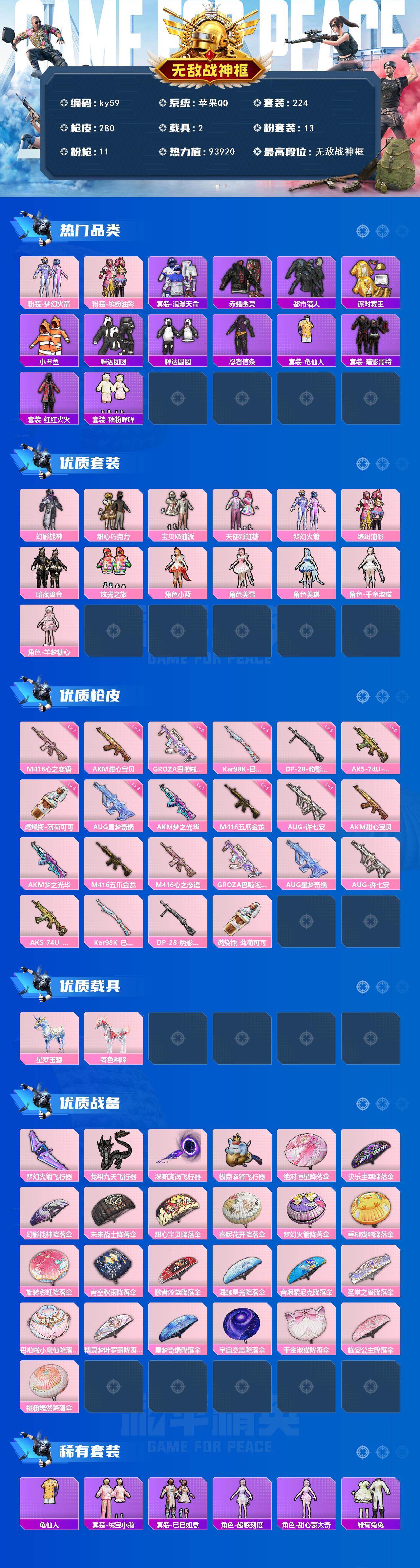 苹果 手q-无敌战神框-13粉装-11特效呛-2载具-5粉色飞行器-93920热力值-15王牌印记-224套装-280呛皮 【热门品类】:粉装-梦幻火箭,粉装-缤纷油彩,套装-浪漫天命,套装-赤蝎幽灵,套装-都市猎人,套装-派对舞王,套装-小丑鱼,套装-胖达团团,套装-胖达圆圆,套装-忍者信条,套装