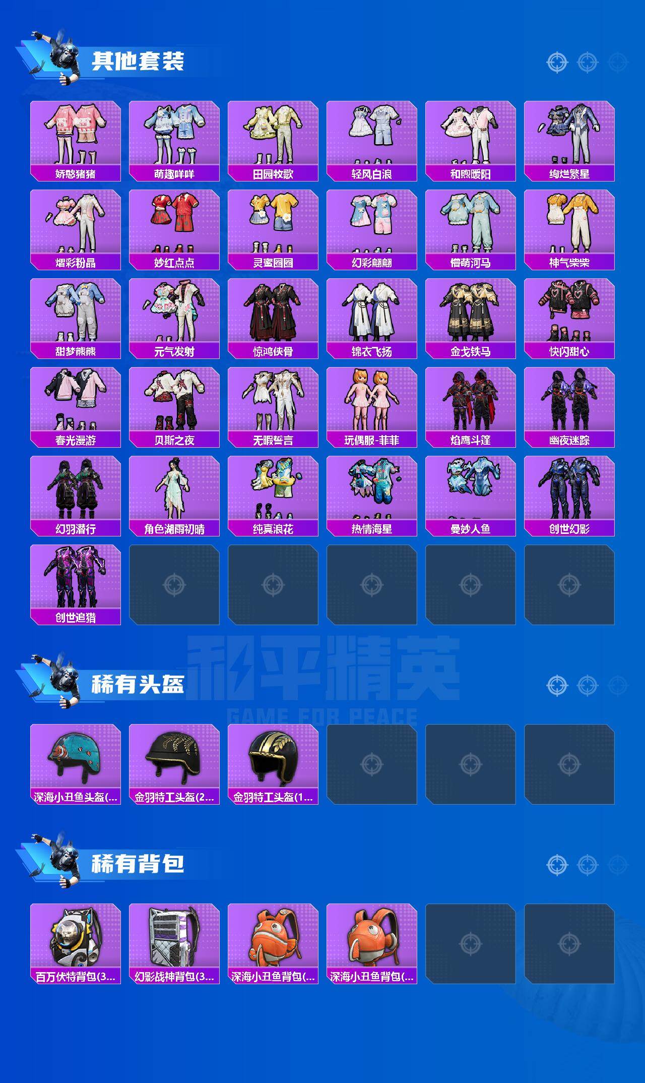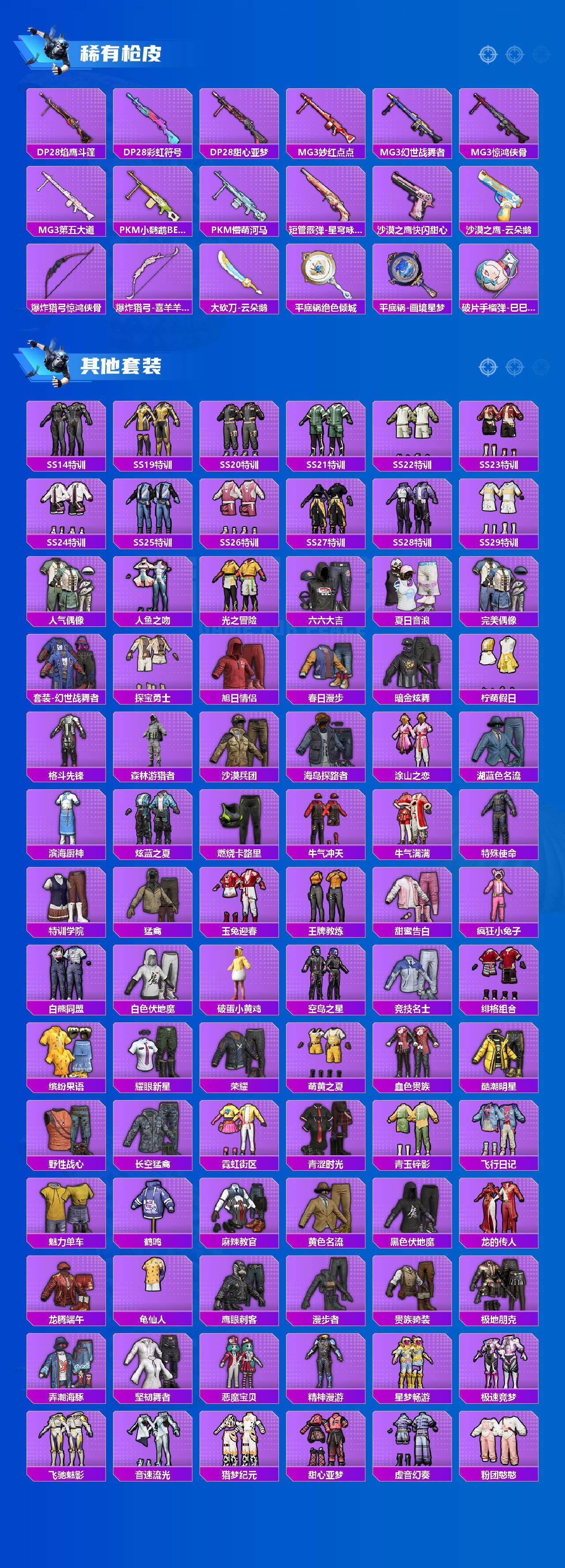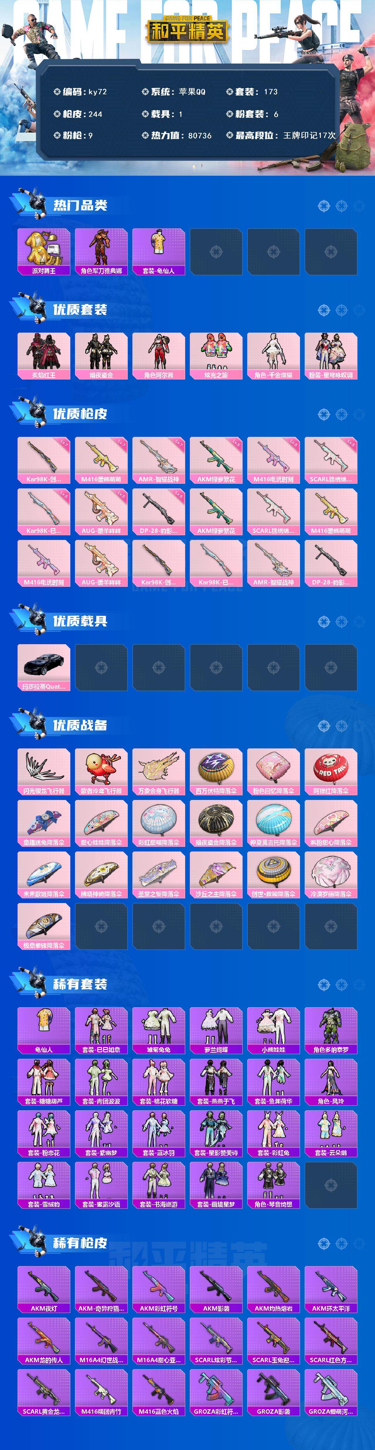 苹果 手q-6粉装-9特效呛-1载具-3粉色飞行器-80736热力值-17王牌印记-173套装-244呛皮 【热门品类】:套装-派对舞王,角色-军刀雅典娜,套装-龟仙人 【粉色套装】:粉装-炙焰红王,粉装-暗夜鎏金,角色-阿尔茜,粉装-炫光之旅,角色-千金淑猫,粉装-星穹咏叹调 【粉色呛皮等级】:akm-绿萝繁花五级,scar-l-锦绣绵绵五级,m416-暖熊萌萌七级,m416-电玩时刻五级,aug-暖羊咩咩五级,kar98k-创世·救赎七级,kar98k-巳巳如意五级,amr-智耀战神七级,dp-28-豹影疾电五级 【粉色载具】:玛莎拉蒂quattropte(夜幕蓝) 【粉色呛皮】:akm-绿萝繁花,scar-l-锦绣绵绵,m416-暖熊萌萌,m416-电玩时刻,aug-暖羊咩咩,kar98k-创世·救赎,kar98k-巳巳如意,amr-智耀战神,dp-28-豹影疾电 【粉色飞行器】:闪光银龙飞行器,歌者泠鸢飞行器,万象金身飞行器 【粉色降落伞】:百万伏特降落伞,粉色回忆降落伞,阿狸红降落伞,童趣迷兔降落伞,甜心娃娃降落伞,彩虹甜喵降落伞,暗夜鎏金降落伞,仲夏莫吉托降落伞,飒粉甜心降落伞,未来歌姬降落伞,拂晓神骑降落伞,圣堂之誓降落伞,沙丘之主降落伞,创世·救赎降落伞,冷漠罗丽降落伞,极意拳锋降落伞 【稀有套装】:套装-龟仙人,套装-巳巳如意,套装-雪国风尚,套装-雏菊兔兔,套装-萝兰蝴蝶,套装-小熊娃娃,角色-多纳泰罗,套装-糖糖葫芦,套装-青团波波,套装-棉花软糖,套装-燕燕于飞,套装-鱼渊荷华,角色-风玲,套装-粉恋花,套装-紫幽梦,套装-蓝冰羽,套装-星影赞美诗,套装-彩虹兔,套装-云朵鹅,套装-雪绒豹,套装-蜜露汐语,套装-书海巡游,套装-画境星梦,套装-琴音绮想 【稀有呛皮】:akm-夜灯,akm-奇异狩猎者,akm-彩虹符号,akm-影袭,akm-灼热熔岩,akm-环太平洋,akm-龙的传人,m16a4-幻世战舞者,m16a4-甜心亚梦,scar-l-炫彩节奏,scar-l-玉兔迎春,scar-l-红色方程式,scar-l-黄金龙骨,m416-糯团青竹,m416-蓝色火焰,groza-彩虹符号,groza-影袭,groza-懵萌河马,groza-田园牧歌,aug-天降萌叽,aug-甜蜜菠萝,aug-耀粉歌者,aug-金蛇镇世,q-彩虹符号,q-飞驰魅影,m762-天降萌叽,m762-彩虹符号,m762-快乐主宰,m762-暖熊萌萌,m762-暗夜鎏金,m762-萌物绒绒,m762-镭射皇者,m762-云朵鹅,mk47-妙红点点,mk47-洛神天依,mk47-百万伏特,g36c-镜域双华,g36c-懵萌河马,ac-val-天降萌叽,ac-val-快闪甜心,ac-val-甜心亚梦,蜜獾-垂柳戏鸭,蜜獾-天降萌叽,蜜獾-娇憨猪猪,蜜獾-绯穹魔姬,ace32-画境星梦,uzi-啾咪啾咪,uzi-天降萌叽,uzi-娇憨猪猪,uzi-影袭,uzi-红色方程式,ump45-夜灯,ump45-涂山之恋,ump45-炫光之旅,ump45-生命誓言,ump45-蓝色火焰,ump45-金玉无双,vect-焰鹰斗篷,vect-彩虹符号,vect-生命誓言,vect-田园牧歌,vect-创世·救赎,vect-动力核心,汤姆逊-天降萌叽,汤姆逊-奇异狩猎者,汤姆逊-暗夜鎏金,汤姆逊-炫彩节奏,汤姆逊-耀粉歌者,mp5k-画境星梦,p90-快闪甜心,p90-飞驰魅影,p90-巳巳如意,kar98k-彩虹符号,kar98k-炫彩节奏,kar98k-飞驰魅影,m24-影袭,m24-炫彩节奏,m24-奇异狩猎者,awm-焰鹰斗篷,sks-炫彩节奏,sks-糯团青竹,vss-彩虹符号,vss-田园牧歌,mini14-彩虹嘻嘻猴,mini14-梦幻火箭,mini14-涂山之恋,slr-娇憨猪猪,slr-彩虹符号,莫辛纳甘-懵萌河马,amr-妙红点点,amr-墨龙九天,m417-惊鸿侠骨,mk20-h-快闪甜心,m200-惊鸿侠骨,svd-云朵鹅,m1加兰德-画境星梦,s686-奇异狩猎者,s686-彩虹符号,s686-生命誓言,s686-雪月幻音,s686-巳巳如意,s1897-暗夜鎏金,s1897-炫彩节奏,s1897-飞驰魅影,s12k-玩趣呆呆,s12k-童趣迷兔,s12k-垂柳戏鸭,s12k-娇憨猪猪,s12k-幻世战舞者,s12k-幻影战神,dbs-焰鹰斗篷,dbs-彩虹符号,dbs-甜心亚梦,dbs-创世·救赎,aa12-g-画境星梦,spas-12-田园牧歌,spas-12-云朵鹅,m249-妙红点点,m249-彩虹符号,m249-糯团青竹,dp-28-焰鹰斗篷,dp-28-彩虹符号,dp-28-甜心亚梦,mg3-妙红点点,mg3-幻世战舞者,mg3-惊鸿侠骨,mg3-第五大道,pkm-小鹦鹉bebe,pkm-懵萌河马,短管霰弹-星穹咏叹调,沙墨之鹦-快闪甜心,沙墨之鹦-云朵鹅,爆炸猎弓-惊鸿侠骨,爆炸猎弓-喜羊羊与灰太狼,大砍刀-云朵鹅,平底锅-绝色倾城,平底锅-画境星梦,破片手留单-巳巳如意 【其他套装】:套装-ss14特训,套装-ss19特训,套装-ss20特训,套装-ss21特训,套装-ss22特训,套装-ss23特训,套装-ss24特训,套装-ss25特训,套装-ss26特训,套装-ss27特训,套装-ss28特训,套装-ss29特训,套装-人气偶像,套装-人鱼之吻,套装-光之冒险,套装-六六大吉,套装-夏日音浪,套装-完美偶像,套装-幻世战舞者,套装-探宝勇士,套装-旭日情侣,套装-春日漫步,套装-暗金炫舞,套装-柠萌假日,套装-格斗先锋,套装-森林游猎者,套装-沙漠兵团,套装-海岛探路者,套装-涂山之恋,套装-湖蓝色名流,套装-滨海厨神,套装-炫蓝之夏,套装-燃烧卡路里,套装-牛气冲天,套装-牛气满满,套装-特殊使命,套装-特训学院,套装-猛禽,套装-玉兔迎春,套装-王牌教练,套装-甜蜜告白,套装-疯狂小兔子,套装-白熊同盟,套装-白色伏地魔,套装-破蛋小黄鸡,套装-空岛之星,套装-竞技名士,套装-绯格组合,套装-缤纷果语,套装-耀眼新星,套装-荣耀,套装-萌黄之夏,套装-血色贵族,套装-酷潮明星,套装-野性战心,套装-长空猛禽,套装-霓虹街区,套装-青涩时光,套装-青玉碎影,套装-飞行日记,套装-魅力单车,套装-鹤鸣,套装-麻辣教官,套装-黄色名流,套装-黑色伏地魔,套装-龙的传人,套装-龙腾端午,套装-龟仙人,套装-鹰眼刺客,套装-漫步者,套装-贵族骑装,套装-极地朋克,套装-弄潮海豚,套装-坚韧舞者,套装-恶魔宝贝,套装-精神漫游,套装-星梦畅游,套装-极速竞梦,套装-飞驰魅影,套装-音速流光,套装-猎梦纪元,套装-甜
