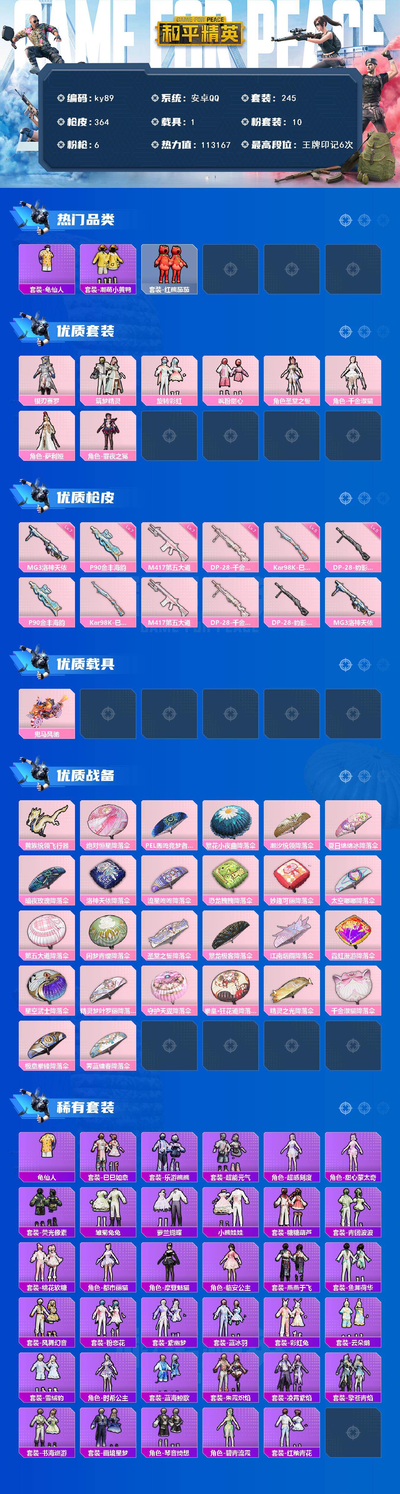 安卓 手q-10粉装-6特效呛-1载具-3粉色飞行器-113167热力值-6王牌印记-245套装-364呛皮 【热门品类】:套装-龟仙人,套装-潮萌小黄鸭,套装-红熊茄茄 【粉色套装】:粉装-银刃赛罗,粉装-筑梦精灵,粉装-旋转彩虹,粉装-飒粉甜心,角色-圣堂之誓,角色-千金淑猫,角色-萨利娅,角色-罪夜之冕 【粉色呛皮等级】:p90-金丰海韵七级,kar98k-巳巳如意五级,m417