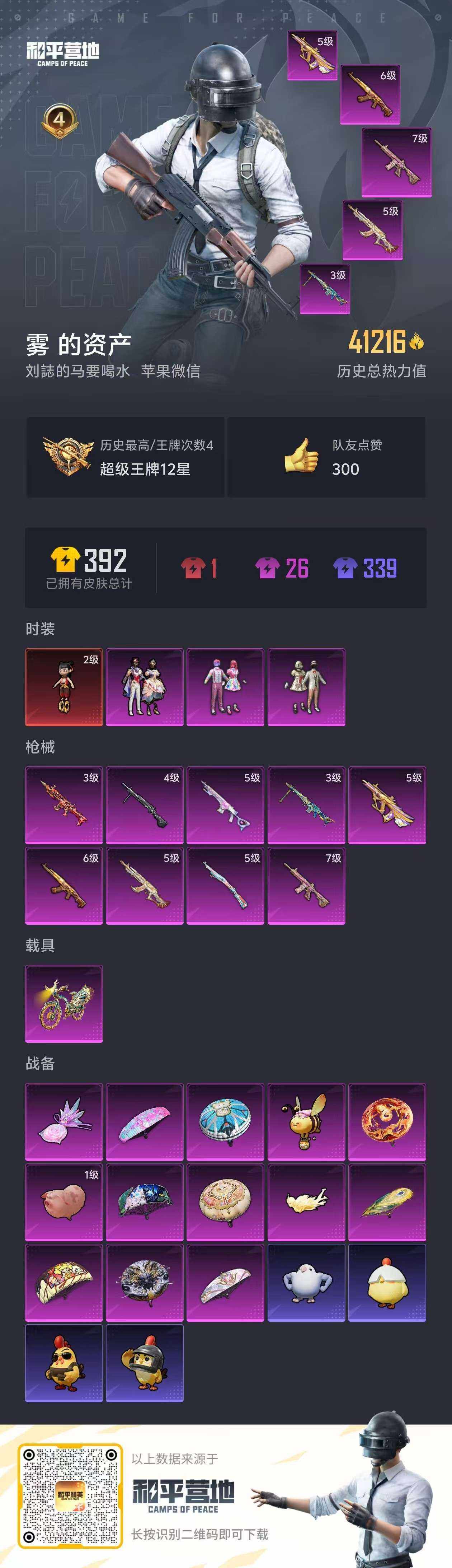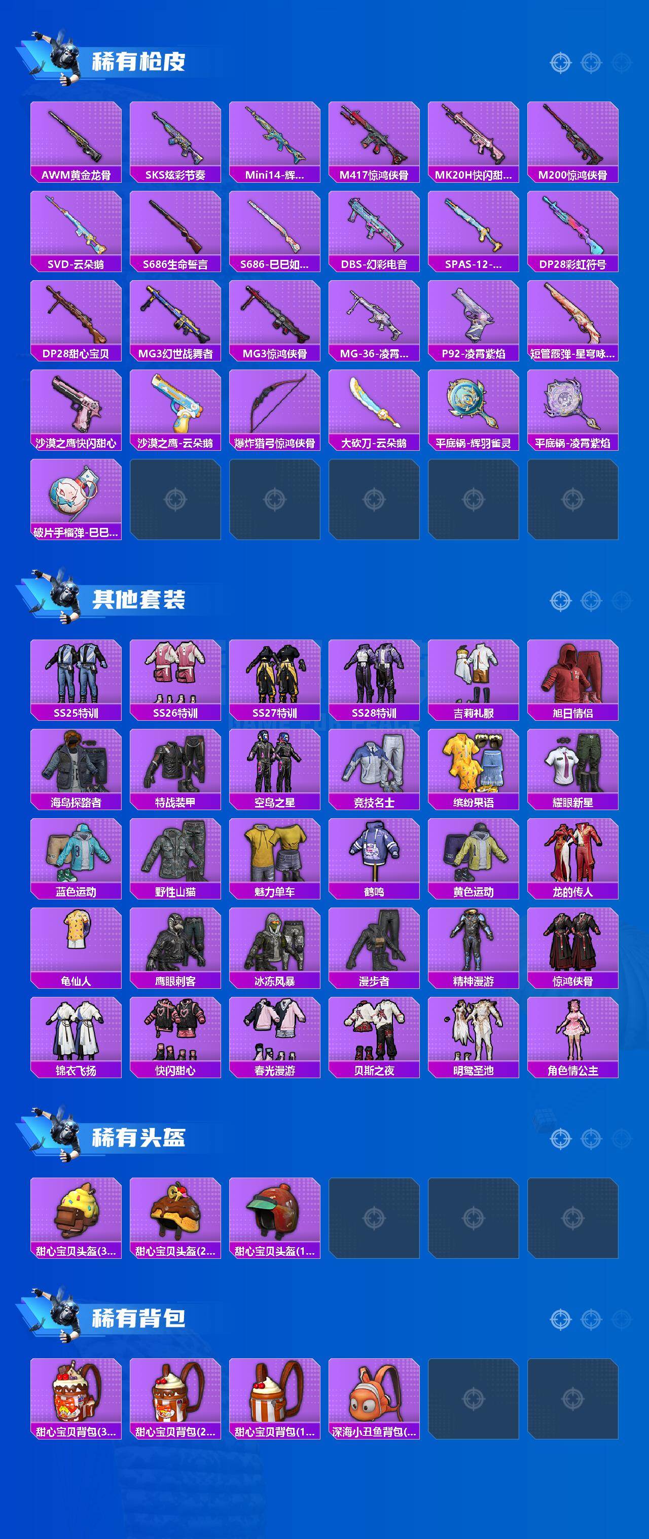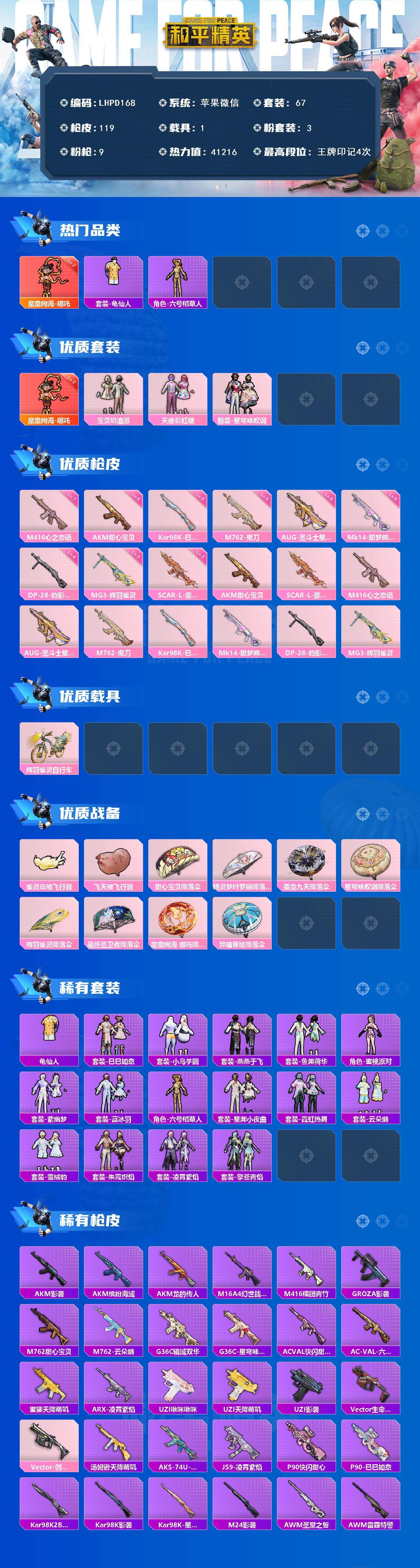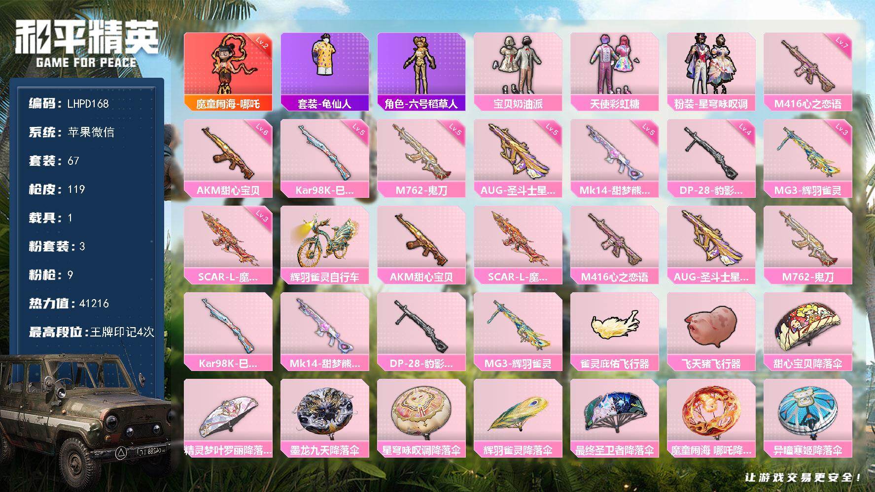 [16327436]苹果 微信-1神装-3粉装-9特效呛-1载具-4粉色飞行器-41216热力值-4王牌印记-67套装-119呛皮【红色神装等级】:魔童闹海-哪吒二级【红色角色神装】:魔童闹海-哪吒【热门品类】:套装-龟仙人,角色-六号稻草人【粉色套装】:粉装-宝贝奶油派,粉装-天使彩虹糖,粉装-星穹咏叹调【粉色呛皮等级】:akm-甜心宝贝六级,scar-l-魔童闹海 哪吒三级,m416-心之恋语七级,aug-圣斗士星矢五级,m762-鬼刀五级,kar98k-巳巳如意五级,mk14-甜梦熊击五级,dp-28-豹影疾电四级,mg3-辉羽雀灵三级【粉色载具】:辉羽雀灵自行车【粉色呛皮】:akm-甜心宝贝,scar-l-魔童闹海 哪吒,m416-心之恋语,aug-圣斗士星矢,m762-鬼刀,kar98k-巳巳如意,mk14-甜梦熊击,dp-28-豹影疾电,mg3-辉羽雀灵【粉色飞行器】:雀灵庇佑飞行器,飞天猪飞行器