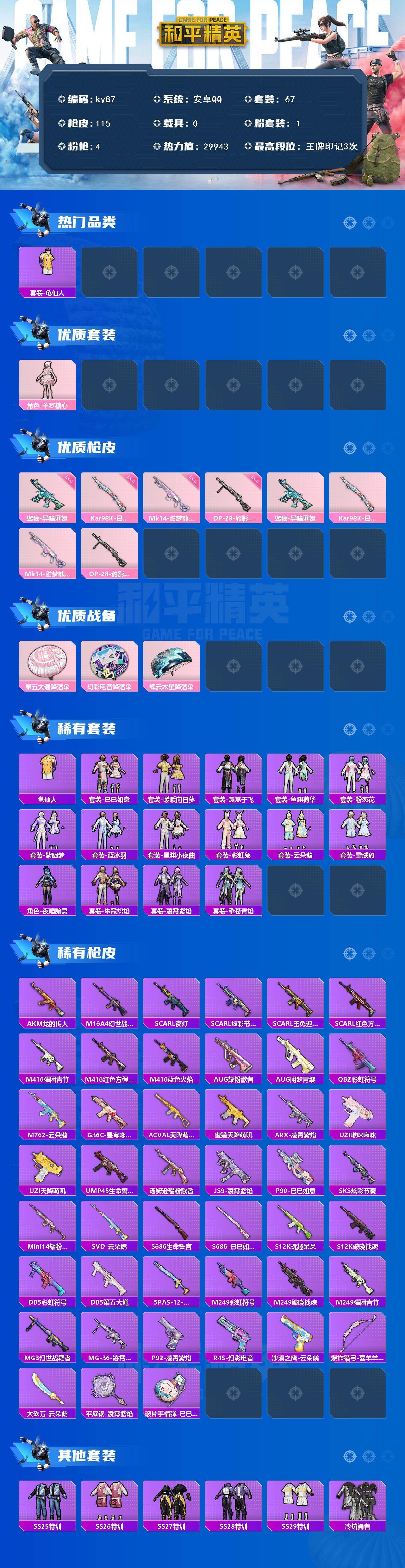 安卓 手q-1粉装-4特效呛-0载具-1粉色飞行器-29943热力值-3王牌印记-67套装-115呛皮 【热门品类】:套装-龟仙人 【粉色套装】:角色-羊梦糖心 【粉色呛皮等级】:蜜獾-异瞳寒姬六级,kar98k-巳巳如意五级,mk14-甜梦熊击五级,dp-28-豹影疾电五级 【粉色呛皮】:蜜獾-异瞳寒姬,kar98k-巳巳如意,mk14-甜梦熊击,dp-28-豹影疾电 【粉色