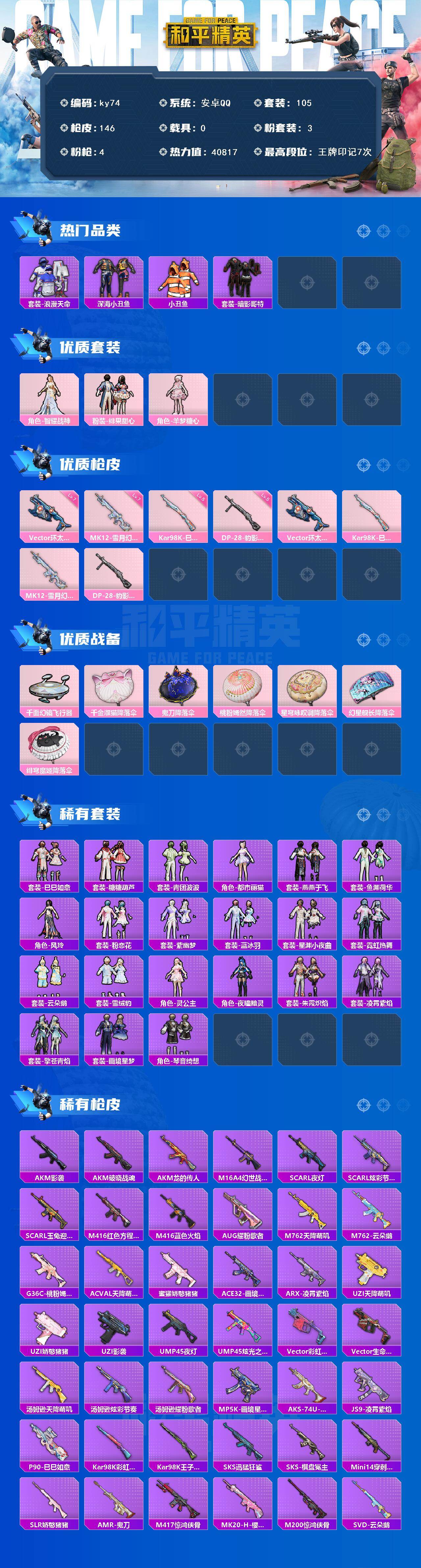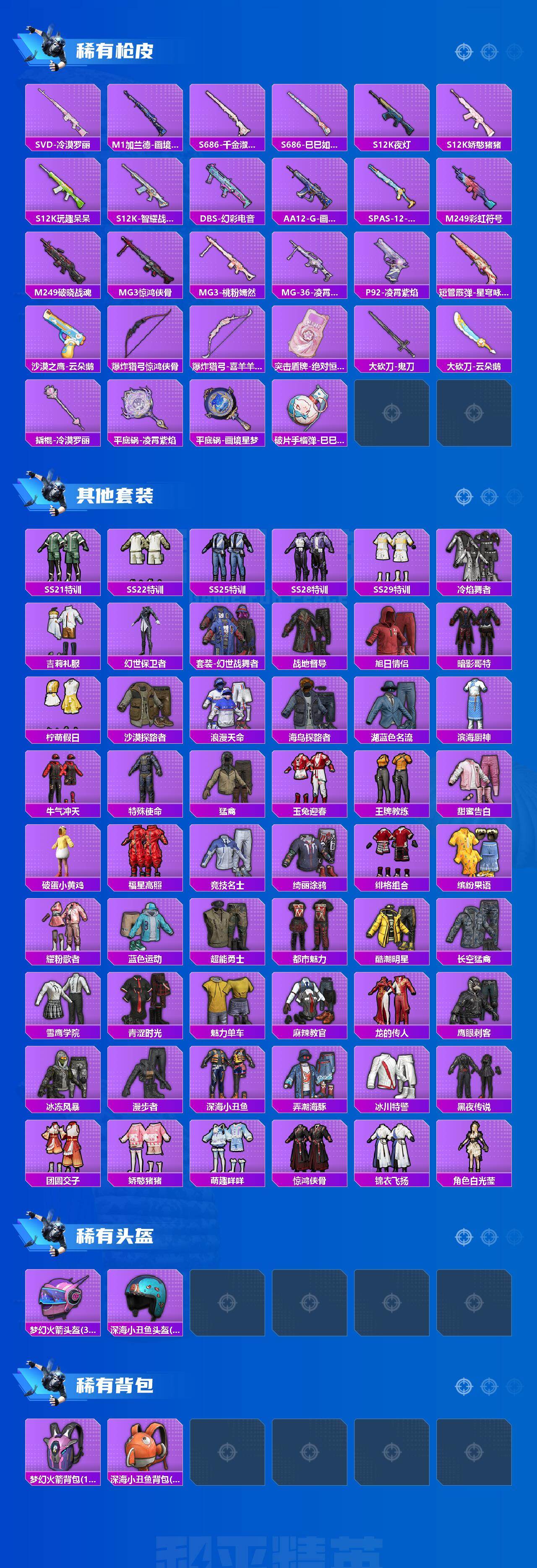 安卓 手q-3粉装-4特效呛-0载具-2粉色飞行器-40817热力值-7王牌印记-105套装-146呛皮 【热门品类】:套装-浪漫天命,套装-深海小丑鱼,套装-小丑鱼,套装-暗影哥特 【粉色套装】:角色-智耀战神,粉装-绯果甜心,角色-羊梦糖心 【粉色呛皮等级】:vect-环太平洋七级,kar98k-巳巳如意五级,mk12-雪月幻音七级,dp-28-豹影疾电五级 【粉色呛皮】:vect-环太平洋,kar98k-巳巳如意,mk12-雪月幻音,dp-28-豹影疾电 【粉色飞行器】:千面幻镜飞行器 【粉色降落伞】:千金淑猫降落伞,鬼刀降落伞,桃粉嫣然降落伞,星穹咏叹调降落伞,幻星舰长降落伞,绯穹魔姬降落伞,炫彩糖果降落伞 【稀有套装】:套装-巳巳如意,套装-炫彩糖果,套装-糖糖葫芦,套装-青团波波,角色-都市丽猫,套装-燕燕于飞,套装-鱼渊荷华,角色-风玲,套装-粉恋花,套装-紫幽梦,套装-蓝冰羽,套装-星渊小夜曲,套装-霓虹热舞,套装-云朵鹅,套装-雪绒豹,角色-灵公主,角色-夜瞳黯灵,套装-朱霞炽焰,套装-凌霄紫焰,套装-擎苍青焰,套装-画境星梦,套装-琴音绮想 【稀有呛皮】:aug-冰晶雪宝,akm-影袭,akm-破晓战魂,akm-龙的传人,m16a4-幻世战舞者,scar-l-夜灯,scar-l-炫彩节奏,scar-l-玉兔迎春,m416-红色方程式,m416-蓝色火焰,aug-耀粉歌者,m762-天降萌叽,m762-云朵鹅,g36c-桃粉嫣然,ac-val-天降萌叽,蜜獾-娇憨猪猪,ace32-画境星梦,arx-凌霄紫焰,uzi-天降萌叽,uzi-娇憨猪猪,uzi-影袭,ump45-夜灯,ump45-炫光之旅,vect-彩虹符号,vect-生命誓言,汤姆逊-天降萌叽,汤姆逊-炫彩节奏,汤姆逊-耀粉歌者,mp5k-画境星梦,aks-74u-鬼刀,js9-凌霄紫焰,p90-巳巳如意,kar98k-彩虹符号,kar98k-王子的夏天,sks-迅猛狂鲨,sks-棋盘冕主,mini14-穿刺龙虾,slr-娇憨猪猪,amr-鬼刀,m417-惊鸿侠骨,mk20-h-樱桃泡泡,m200-惊鸿侠骨,svd-云朵鹅,svd-冷漠罗丽,m1加兰德-画境星梦,s686-巳巳如意,s686-千金淑猫,s12k-玩趣呆呆,s12k-夜灯,s12k-娇憨猪猪,s12k-智耀战神,dbs-幻彩电音,aa12-g-画境星梦,spas-12-云朵鹅,m249-彩虹符号,m249-破晓战魂,mg3-惊鸿侠骨,mg3-桃粉嫣然,mg-36-凌霄紫焰,p92-凌霄紫焰,短管霰弹-星穹咏叹调,沙墨之鹦-云朵鹅,爆炸猎弓-惊鸿侠骨,爆炸猎弓-喜羊羊与灰太狼,突击盾牌-绝对恒星,大砍刀-云朵鹅,大砍刀-鬼刀,撬棍-冷漠罗丽,平底锅-凌霄紫焰,平底锅-画境星梦,破片手留单-巳巳如意 【其他套装】:套装-ss21特训,套装-ss22特训,套装-ss25特训,套装-ss28特训,套装-ss29特训,套装-冷焰舞者,套装-吉莉礼服,套装-幻世保卫者,套装-幻世战舞者,套装-战地督导,套装-旭日情侣,套装-暗影哥特,套装-柠萌假日,套装-沙漠探路者,套装-浪漫天命,套装-海岛探路者,套装-湖蓝色名流,套装-滨海厨神,套装-牛气冲天,套装-特殊使命,套装-猛禽,套装-玉兔迎春,套装-王牌教练,套装-甜蜜告白,套装-破蛋小黄鸡,套装-福星高照,套装-竞技名士,套装-绮丽涂鸦,套装-绯格组合,套装-缤纷果语,套装-耀粉歌者,套装-蓝色运动,套装-超能勇士,套装-都市魅力,套装-酷潮明星,套装-长空猛禽,套装-雪鹰学院,套装-青涩时光,套装-魅力单车,套装-麻辣教官,套装-龙的传人,套装-鹰眼刺客,套装-冰冻风暴,套装-漫步者,套装-深海小丑鱼,套装-弄潮海豚,套装-冰川特警,套装-黑夜传说,套装-团圆交子,套装-娇憨猪猪,套装-萌趣咩咩,套装-惊鸿侠骨,套装-锦衣飞扬,角色-白光莹 【稀有头盔】:梦幻火箭头盔3级,深海小丑鱼头盔1级 【稀有背包】:梦幻火箭背包1级,深海小丑鱼背包2级 【营地id】:950319160