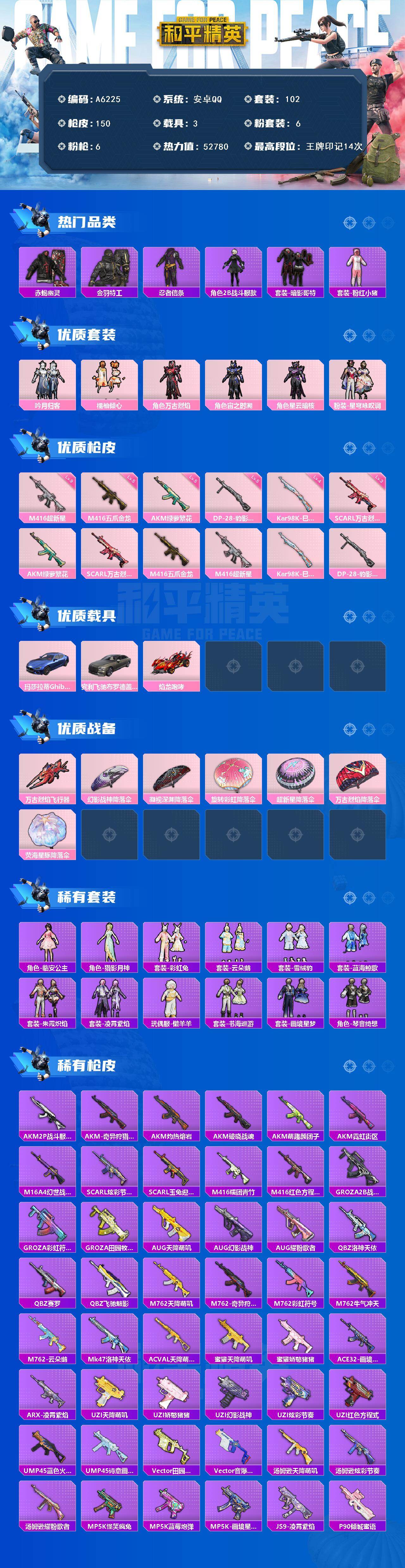 [16704844]安卓 【男神号 赤蝎幽灵 金羽特工 2b战斗服款 暗影哥特 m416-五爪金龙五级,m416-超新星九级 玛莎拉蒂ghibli(蓝),宾利飞驰(布罗德盖棕双色),焰龙咆哮】手q-6粉装-6特效呛-3载具-1粉色飞行器-52780热力值-14王牌印记-102套装-150呛皮 【热门品类】:套装-赤蝎幽灵,套装-金羽特工,套装-忍者信条,角色-2b战斗服款,套装-暗影哥特,套装-粉红小猪 【粉色套装】:粉装-吟月归客,粉装-橘柚倾心,角色-万古烈焰,角色-宙之时溯,角色-星云暗核,粉装-星穹咏叹调 【粉色呛皮等级】:akm-绿萝繁花五级,scar-l-万古烈焰三级,m416-五爪金龙五级,m416-超新星九级,kar98k-巳巳如意四级,dp-28-豹影疾电五级 【粉色载具】:玛莎拉蒂ghibli(蓝),宾利飞驰(布罗德盖棕双色),焰龙咆哮 【粉色呛皮】:akm-绿萝繁花,scar-l-万古烈焰,m416-五爪金龙,m416-超新星,kar98k-巳巳如意,dp-28-豹影疾电 【粉色飞行器】:万古烈焰飞行器 【粉色降落伞】:幻影战神降落伞,凝视深渊降落伞,旋转彩虹降落伞,超新星降落伞,万古烈焰降落伞,荧海星豚降落伞 【稀有套装】:角色-临安公主,角色-猎影月神,套装-彩虹兔,套装-云朵鹅,套装-雪绒豹,套装-蓝海鲸歌,套装-朱霞炽焰,套装-凌霄紫焰,玩偶服-懒羊羊,套装-书海巡游,套装-画境星梦,套装-琴音绮想 【稀有呛皮】:akm-2p战斗服款,akm-奇异狩猎者,akm-灼热熔岩,akm-破晓战魂,akm-萌趣颜团子,akm-霓虹街区,m16a4-幻世战舞者,scar-l-炫彩节奏,scar-l-玉兔迎春,m416-糯团青竹,m416-红色方程式,groza-2b战斗服款,groza-彩虹符号,groza-田园牧歌,aug-天降萌叽,aug-幻影战神,aug-耀粉歌者,q-洛神天依,q-赛罗,q-飞驰魅影,m762-天降萌叽,m762-奇异狩猎者,m762-彩虹符号,m762-牛气冲天,m762-云朵鹅,mk47-洛神天依,ac-val-天降萌叽,蜜獾-天降萌叽,蜜獾-娇憨猪猪,ace32-画境星梦,arx-凌霄紫焰,uzi-天降萌叽,uzi-娇憨猪猪,uzi-幻影战神,uzi-炫彩节奏,uzi-红色方程式,ump45