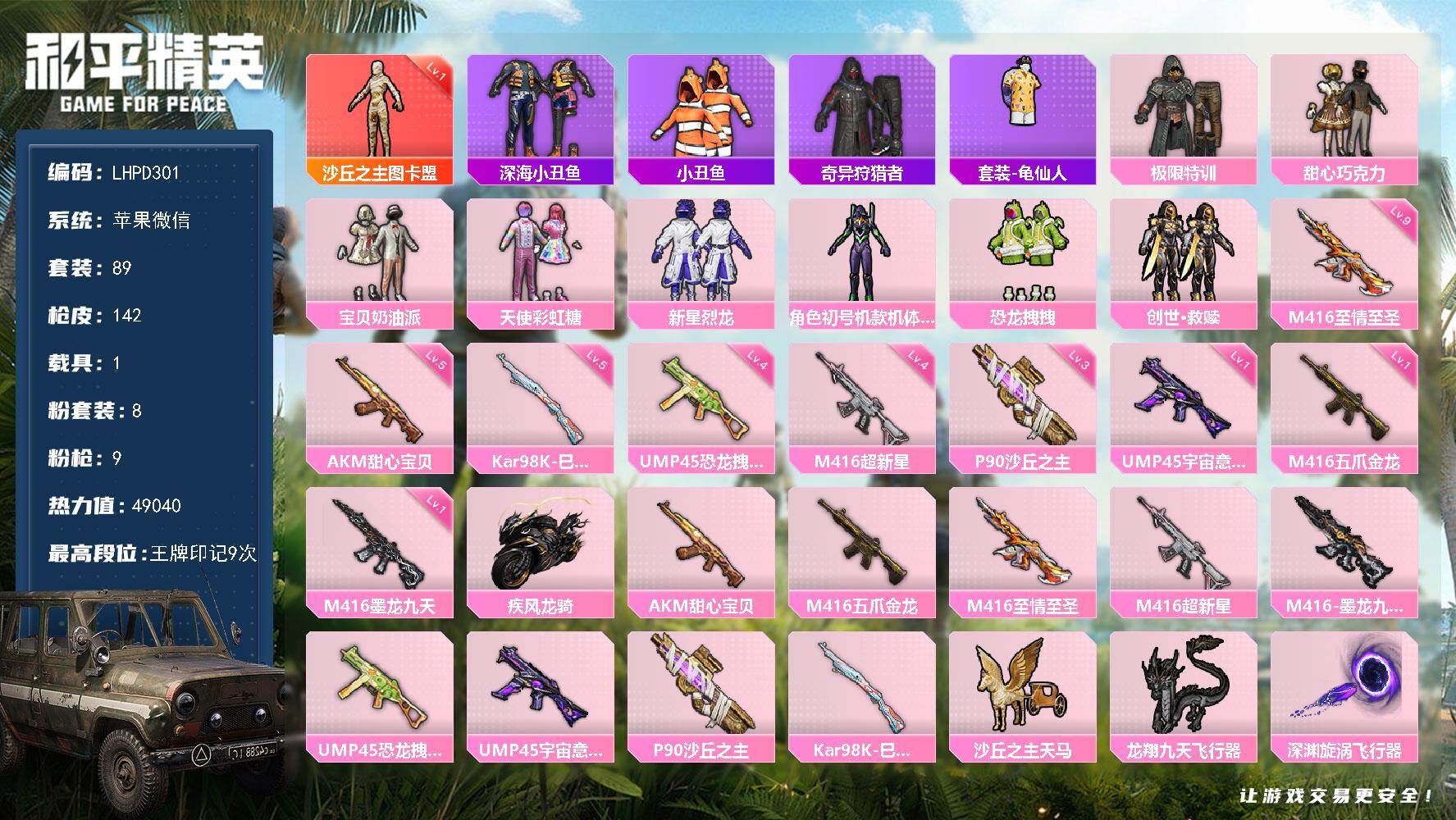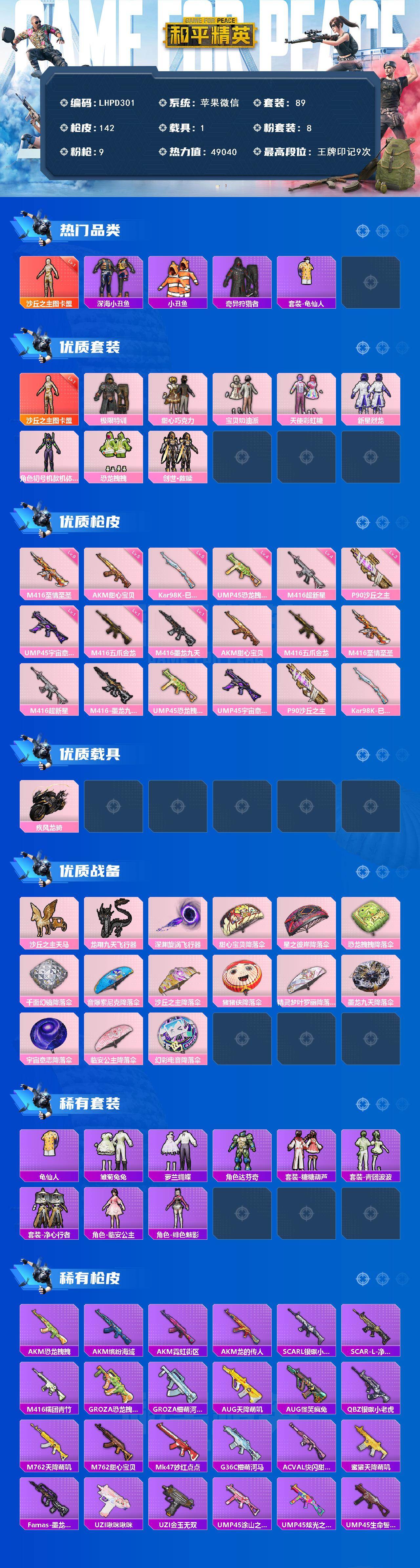 [16580580]【特价出售/店主推荐】苹果 微信-1神装-8粉装-9特效呛-1载具-3粉色飞行器-49040热力值-9王牌印记-89套装-142呛皮【红色神装等级】:沙丘之主-图卡盟一级【红色角色神装】:沙丘之主-图卡盟【热门品类】:套装-深海小丑鱼,套装-小丑鱼,套装-奇异狩猎者,套装-龟仙人【粉色套装】:粉装-极限特训,粉装-甜心巧克力,粉装-宝贝奶油派,粉装-天使彩虹糖,粉装-新星烈龙,角色-初号机款机体服,粉装-恐龙拽拽,套装-创世·救赎【粉色呛皮等级】:akm-甜心宝贝五级,m416-五爪金龙一级,m416-至情至圣九级,m416-超新星四级,m416-墨龙九天一级,ump45-恐龙拽拽四级,ump45-宇宙意志一级,p90-沙丘之主三级,kar98k-巳巳如意五级【粉色载具】:疾风龙骑【粉色呛皮】:akm-甜心宝贝,m416-五爪金龙,m416-至情至圣,m416-超新星,m416-墨龙九天,ump45-恐龙拽拽,ump45-宇宙意志,p90-沙丘之主,kar98k-巳巳如意【粉色飞行器】:沙丘之主天马,龙翔九天飞行器,深渊漩涡飞行器
