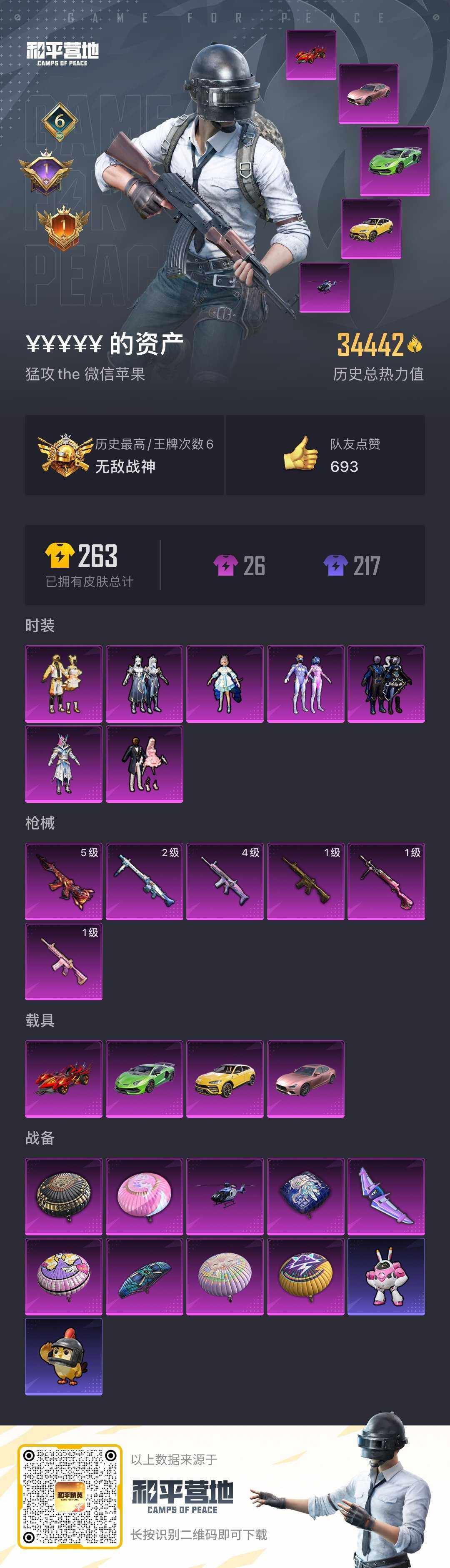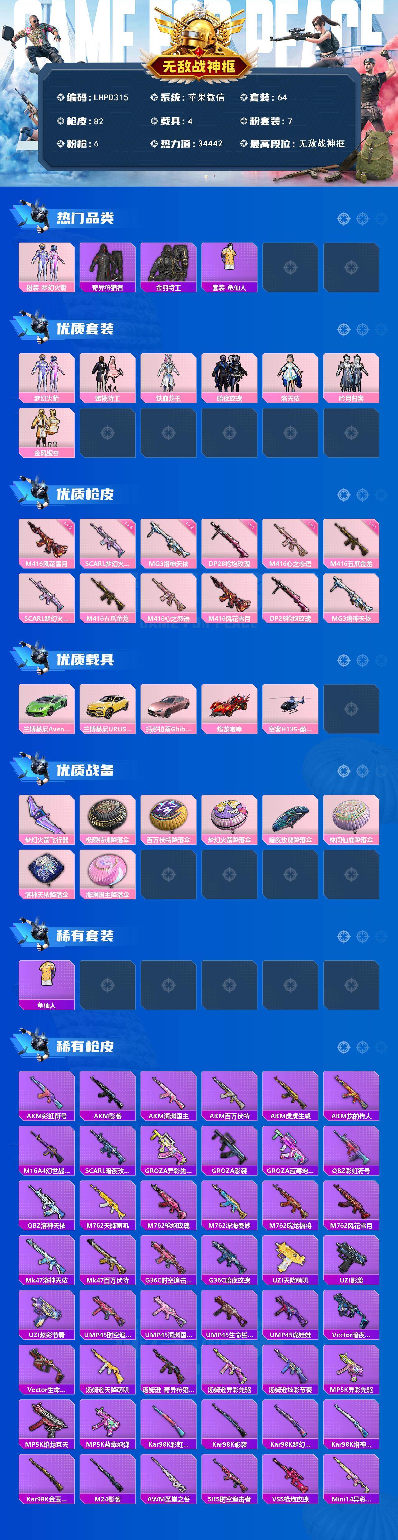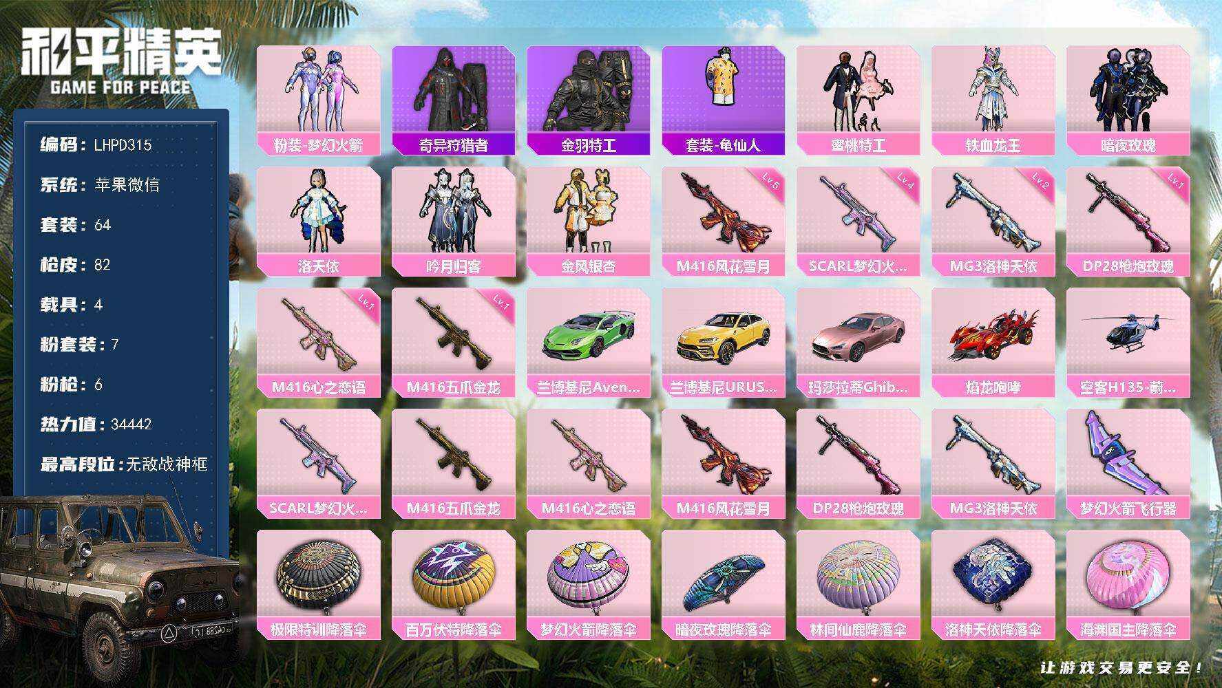 [16636893]【店主推荐捡漏号!可直接换绑】苹果 微信-无敌战神框-7粉装-6特效呛-5载具-1粉色飞行器-34442热力值-6王牌印记-64套装-82呛皮【热门品类】:粉装-梦幻火箭,套装-奇异狩猎者,套装-金羽特工,套装-龟仙人【粉色套装】:粉装-梦幻火箭,粉装-蜜桃特工,粉装-铁血龙王,粉装-暗夜玫瑰,角色-洛天依,粉装-吟月归客,粉装-金风银杏【粉色呛皮等级】:scar-l-梦幻火箭四级,m416-五爪金龙一级,m416-心之恋语一级,m416-风花雪月五级,dp-28-呛炮玫瑰一级,mg3-洛神天依二级【粉色载具】:兰博基尼aventad svj(翡翠绿),兰博基尼urus(明艳黄),玛莎拉蒂ghibli(粉),焰龙咆哮,空客h135-蔚蓝之翼【粉色呛皮】:scar-l-梦幻火箭,m416-五爪金龙,m416-心之恋语,m416-风花雪月,dp-28-呛炮玫瑰,mg3-洛神天依【粉色飞行器】:梦幻火箭飞行器