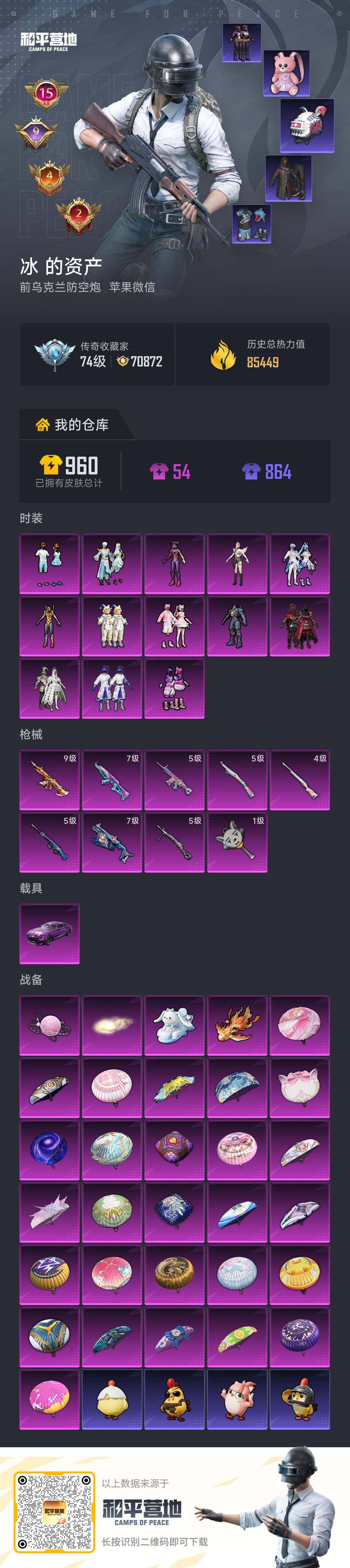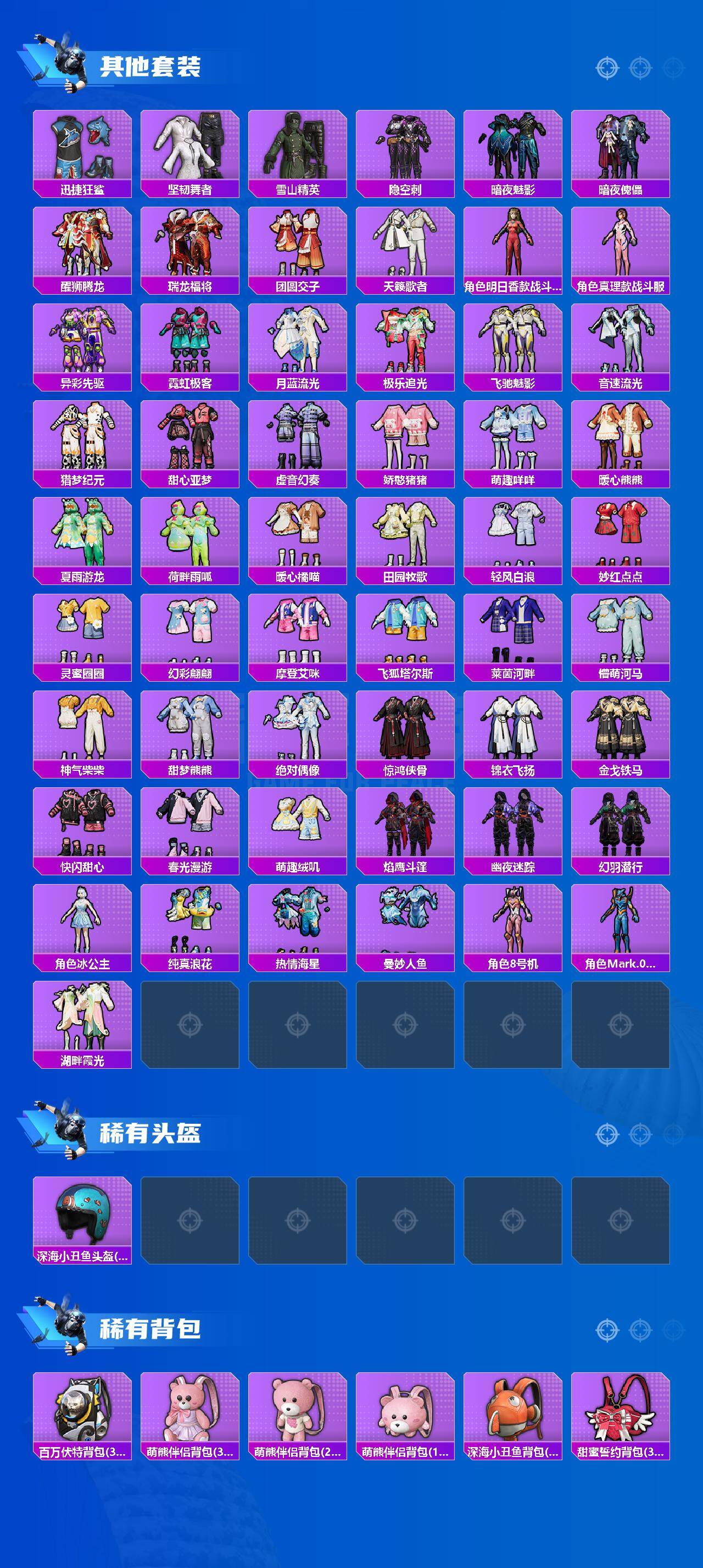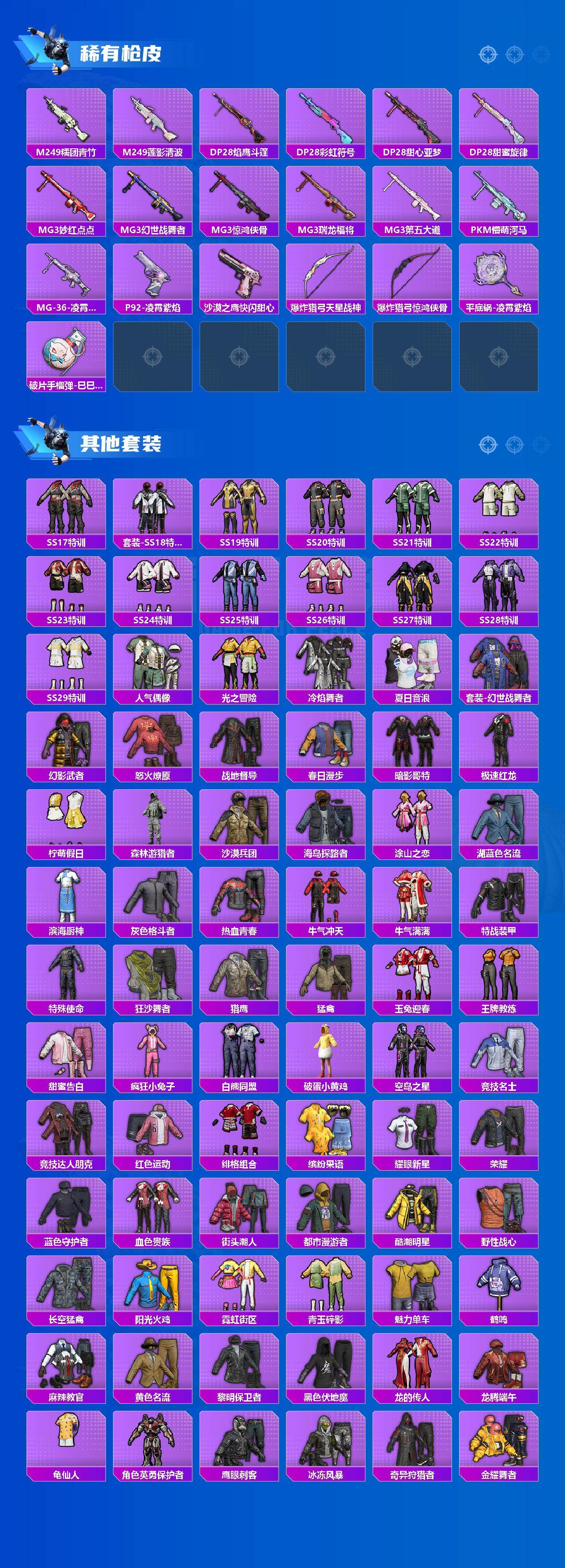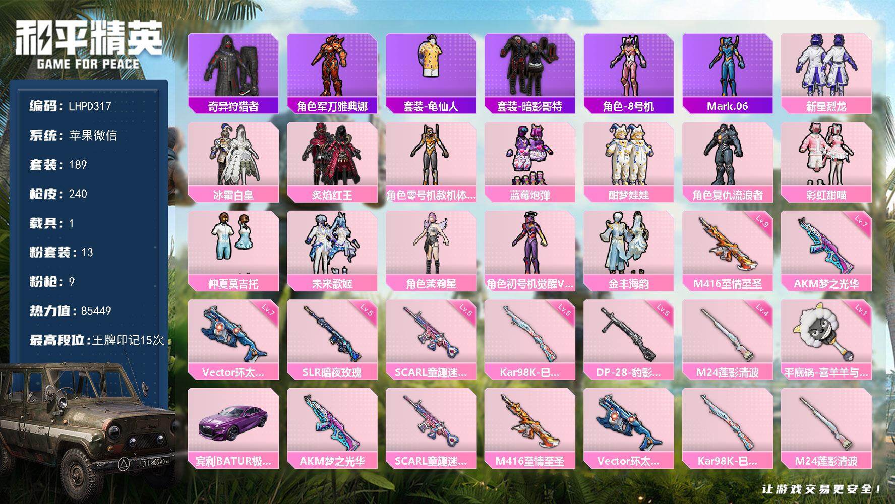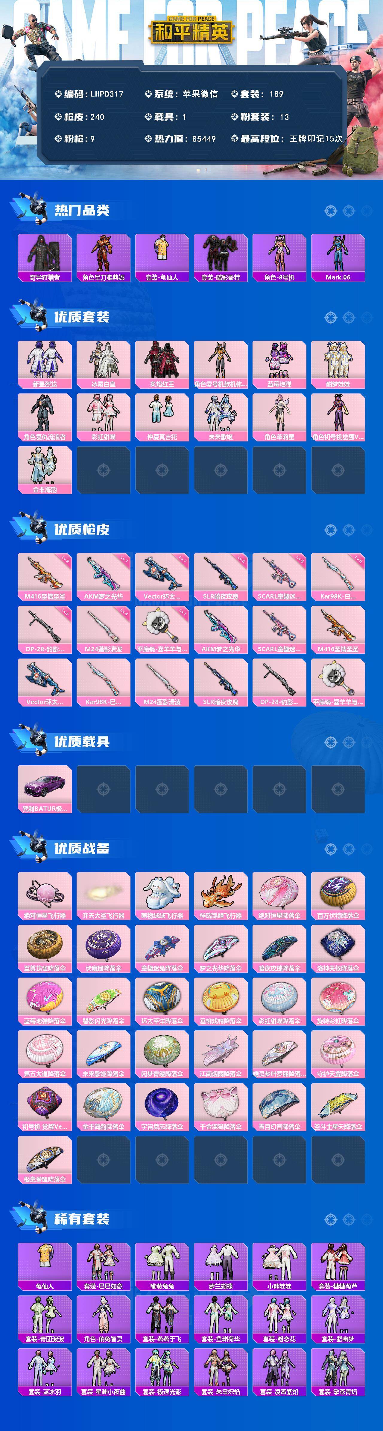 [16580396]【特价出售/店主推荐】苹果 微信-13粉装-9特效呛-1载具-4粉色飞行器-8·5w热力值-15王牌印记-189套装-240呛皮 【热门品类】:套装-奇异狩猎者,角色-军刀雅典娜,套装-龟仙人,套装-暗影哥特,角色-8号机,角色-mark.06 【粉色套装】:粉装-新星烈龙,粉装-冰霜白皇,粉装-炙焰红王,角色-零号机款机体服,粉装-蓝莓炮弹,粉装-酣梦娃娃,角色-复仇流浪者,粉装-彩虹甜喵,粉装-仲夏莫吉托,粉装-未来歌姬,角色-茉莉星,角色-初号机 觉醒ver.,粉装-金丰海韵 【粉色呛皮等级】:akm-梦之光华七级,scar-l-童趣迷兔五级,m416-至情至圣九级,vect-环太平洋七级,kar98k-巳巳如意五级,m24-莲影清波四级,slr-暗夜玫瑰五级,dp-28-豹影疾电五级,平底锅-喜羊羊与灰太狼一级 【粉色载具】:宾利batur(极速紫) 【粉色呛皮】:akm-梦之光华,scar-l-童趣迷兔,m416-至情至圣,vect-环太平洋,kar98k-巳巳如意,m24-莲影清波,slr-暗夜玫瑰,dp-28-豹影疾电,平底锅-喜羊羊与灰太狼 【粉色飞行器】:绝对恒星飞行器,齐天大圣飞行器,萌物绒绒飞行器,祥瑞锦鲤飞行器 【粉色降落伞】:绝对恒星降落伞,百万伏特降落伞,至尊龙雀降落伞,伏魔团降落伞,童趣迷兔降落伞,梦之光华降落伞,暗夜玫瑰降落伞,洛神天依降落伞,蓝莓炮弹降落伞,碧影闪光降落伞,环太平洋降落伞,垂柳戏鸭降落伞,彩虹甜喵降落伞,旋转彩虹降落伞,第五大道降落伞,未来歌姬降落伞,闲梦青缨降落伞,江南烟雨降落伞,精灵梦叶罗丽降落伞,守护天翼降落伞,初号机 觉醒ver.降落伞,金丰海韵降落伞,宇宙意志降落伞,千金淑猫降落伞,雪月幻音降落伞,圣斗士星矢降落伞,极意拳锋降落伞 【稀有套装】:套装-龟仙人,套装-巳巳如意,套装-雪国风尚,套装-雏菊兔兔,套装-萝兰蝴蝶,套装-小熊娃娃,套装-糖糖葫芦,套装-青团波波,角色-俏兔智灵,套装-燕燕于飞,套装-鱼渊荷华,套装-粉恋花,套装-紫幽梦,套装-蓝冰羽,套装-星渊小夜曲,套装-极速光影,套装-朱霞炽焰,套装-凌霄紫焰,套装-擎苍青焰 【稀有呛皮】:akm-彩虹符号,akm-海渊国主,akm-环太平洋,akm-霓虹街区,akm-龙的传人,m16a4-幻世战舞者