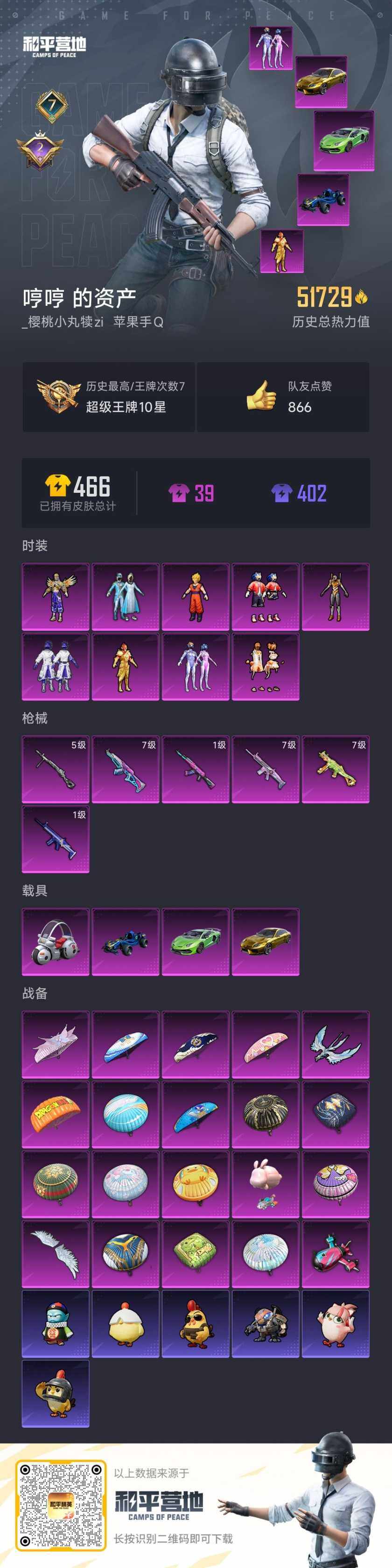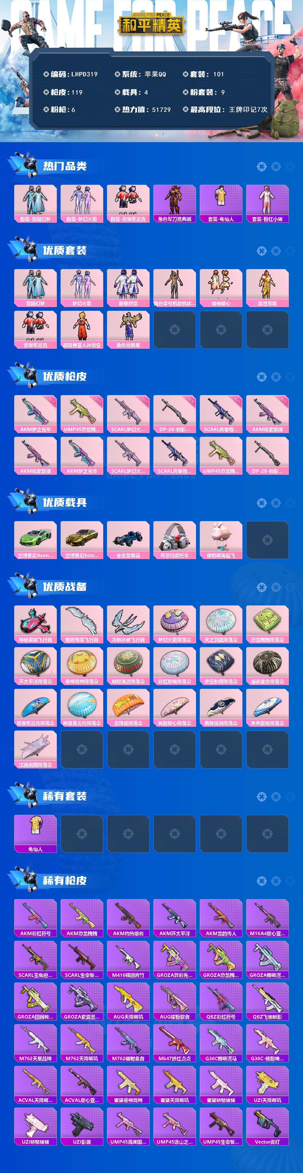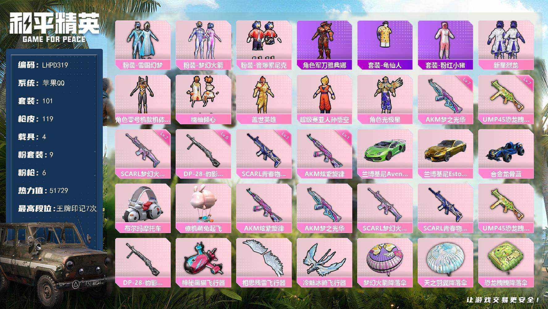 [16636879]【特价出售/店主推荐】苹果 手q-9粉装-6特效呛-5载具-3粉色飞行器-51729热力值-7王牌印记-101套装-119呛皮【热门品类】:粉装-雪国幻梦,粉装-梦幻火箭,粉装-音爆索尼克,角色-军刀雅典娜,套装-龟仙人,套装-粉红小猪【粉色套装】:粉装-雪国幻梦,粉装-梦幻火箭,粉装-新星烈龙,角色-零号机款机体服,粉装-橘柚倾心,粉装-盖世英雄,粉装-音爆索尼克,超级赛亚人-孙悟空,角色-光极星【粉色呛皮等级】:akm-炫紫旋律一级,akm-梦之光华七级,scar-l-梦幻火箭七级,scar-l-青春物语一级,ump45-恐龙拽拽七级,dp-28-豹影疾电五级【粉色载具】:兰博基尼aventad svj(翡翠绿),兰博基尼estoque(炫光金),合金龙骨(蓝),布尔玛摩托车,僚机-萌兔起飞【粉色呛皮】:akm-炫紫旋律,akm-梦之光华,scar-l-梦幻火箭,scar-l-青春物语,ump45-恐龙拽拽,dp-28-豹影疾电【粉色飞行器】:神秘黑猫飞行器,相思残雪飞行器,冷魅冰骑飞行器