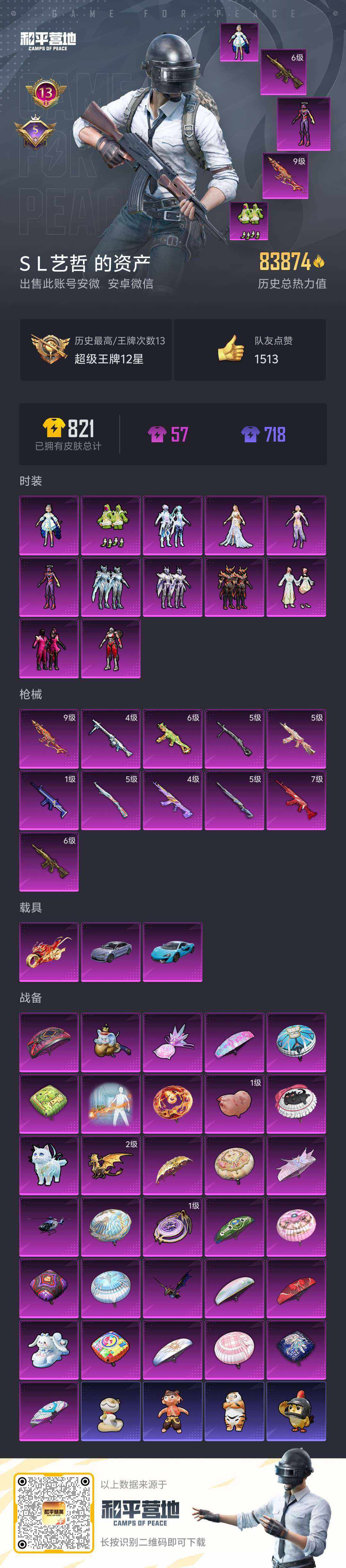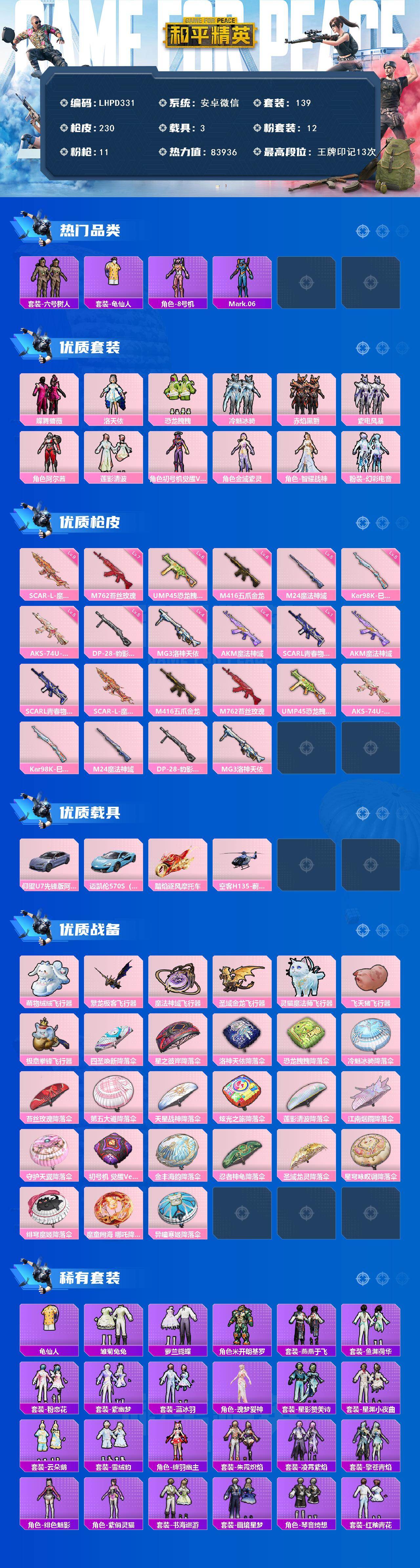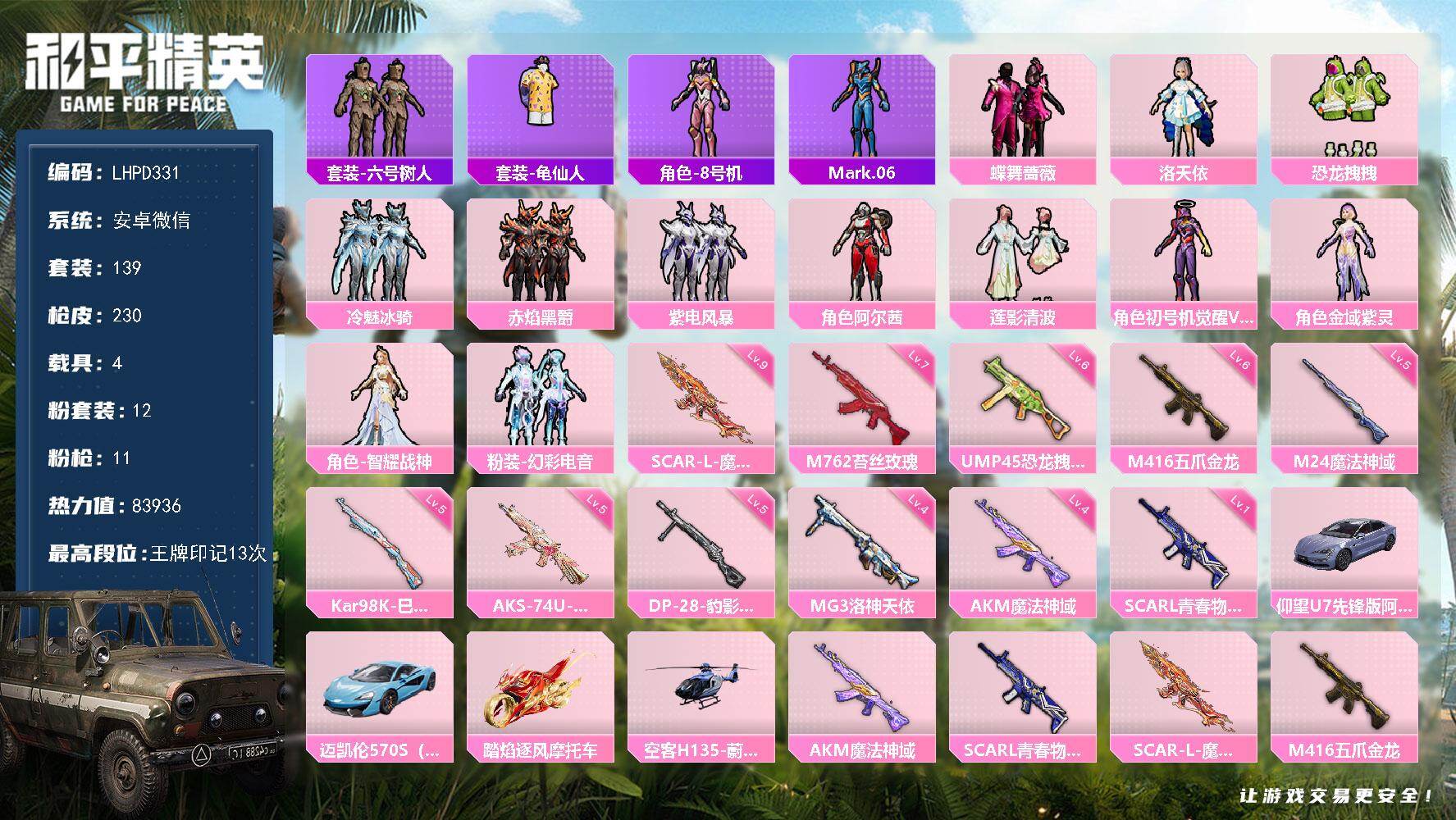 [16636909]【店主推荐捡漏号!可直接换绑】安卓 微信-12粉装-11特效呛-4载具-8粉色飞行器-83936热力值-13王牌印记-139套装-230呛皮【热门品类】:套装-六号树人,套装-龟仙人,角色-8号机,角色-mark.06【粉色套装】:粉装-蝶舞蔷薇,角色-洛天依,粉装-恐龙拽拽,粉装-冷魅冰骑,粉装-赤焰黑爵,粉装-紫电风暴,角色-阿尔茜,粉装-莲影清波,角色-初号机 觉醒ver.,角色-金域紫灵,角色-智耀战神,粉装-幻彩电音【粉色呛皮等级】:akm-魔法神域四级,scar-l-青春物语一级,scar-l-魔童闹海 哪吒九级,m416-五爪金龙六级,m762-苔丝玫瑰七级,ump45-恐龙拽拽六级,aks-74u-星穹咏叹调五级,kar98k-巳巳如意五级,m24-魔法神域五级,dp-28-豹影疾电五级,mg3-洛神天依四级【粉色载具】:仰望u7(阿盖尔紫),迈凯伦570s(天际蓝),踏焰逐风摩托车,空客h135-蔚蓝之翼【粉色呛皮】:akm-魔法神域,scar-l-青春物语,scar-l-魔童闹海 哪吒,m416-五爪金龙,m762-苔丝玫瑰,ump45-恐龙拽拽,aks-74u-星穹咏叹调,kar98k-巳巳如意,m24-魔法神域,dp-28-豹影疾电,mg3-洛神天依【粉色飞行器】:萌物绒绒飞行器,繁龙极客飞行器,魔法神域飞行器,圣域金龙飞行器,灵猫魔法师飞行器,飞天猪飞行器,极意拳锋飞行器