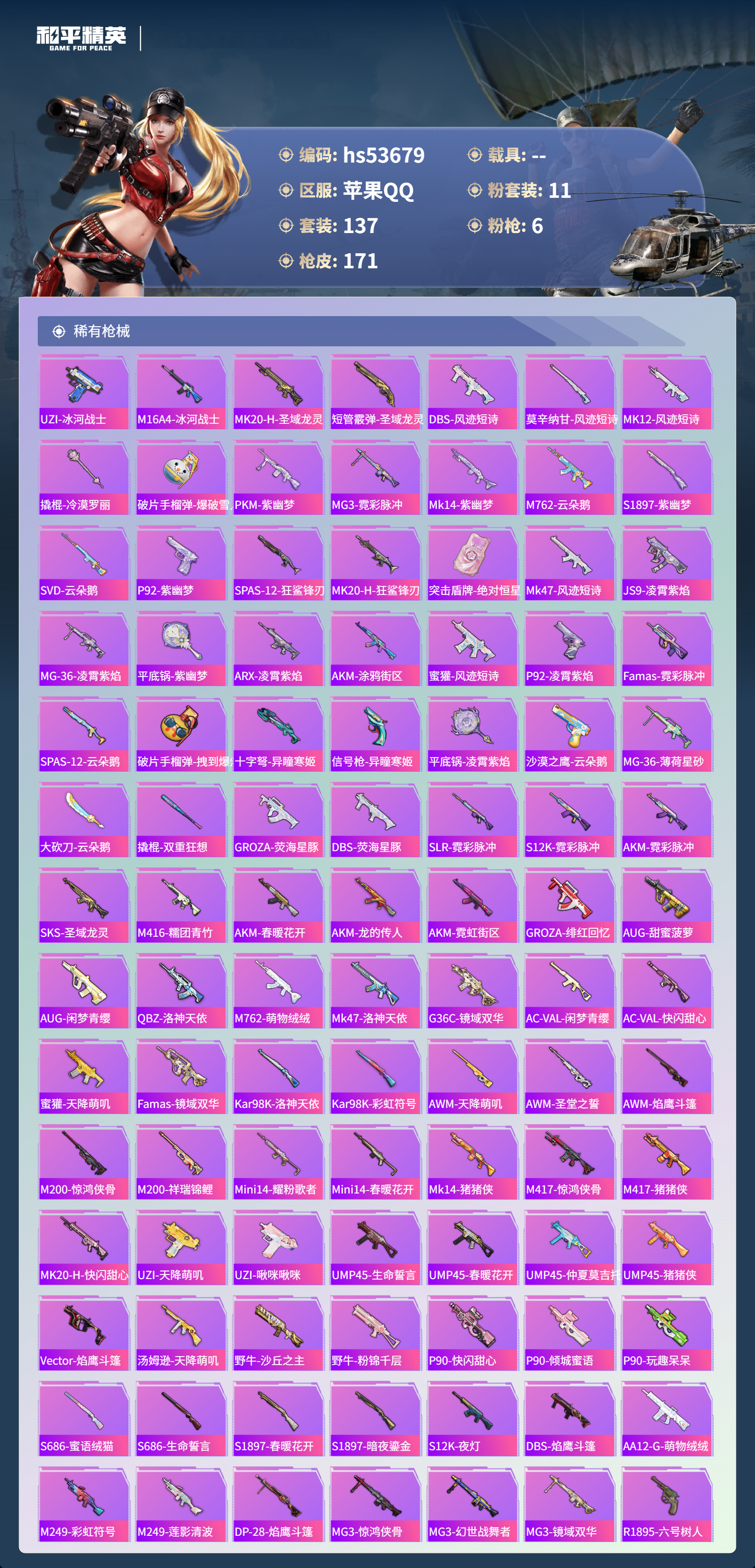 hs53679 苹果手q-10王牌印记-1红装-11粉装-6特效呛-62053热力值-137套装-171呛皮 【1红装】圣域龙灵-瑞拉/3级 【11粉装】玩偶服-猪猪侠角色-美琪角色-守护天翼套装-缤纷油彩角色-美雪套装-星穹咏叹调角色-异瞳寒姬角色-宙之时溯角色-星云暗核角色-烟云彩露套装-恐龙拽拽 【6特效呛】akm-绿萝繁花/5级kar98k-圣域龙灵/3级ump45