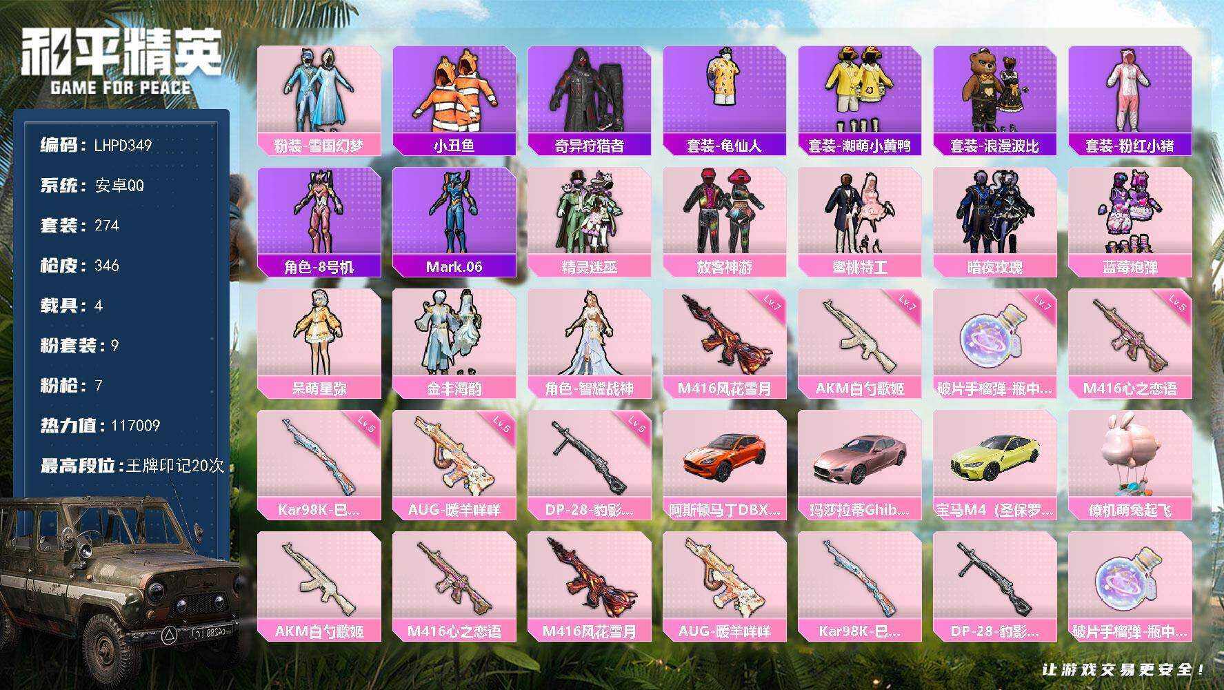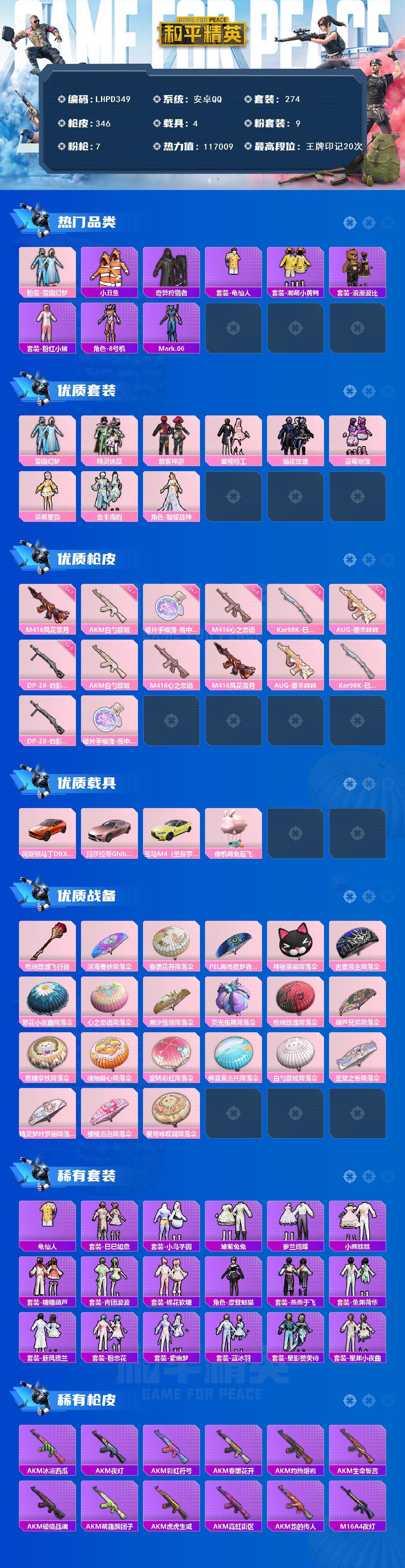 [16696118]安卓 手q-9粉装-7特效呛-4载具-2粉色飞行器-117009热力值-20王牌印记-274套装-346呛皮【热门品类】:粉装-雪国幻梦,套装-小丑鱼,套装-奇异狩猎者,套装-龟仙人,套装-潮萌小黄鸭,套装-浪漫波比,套装-粉红小猪,角色-8号机,角色-mark.06【粉色套装】:粉装-雪国幻梦,粉装-精灵迷巫,粉装-放客神游,粉装-蜜桃特工,粉装-暗夜玫瑰,粉装-蓝莓炮弹,角色-呆萌星弥,粉装-金丰海韵,角色-智耀战神【粉色呛皮等级】:akm-白勺歌姬七级,m416-心之恋语五级,m416-风花雪月七级,aug-暖羊咩咩五级,kar98k-巳巳如意五级,dp-28-豹影疾电五级,破片手留单-瓶中星球七级【粉色载具】:阿斯顿马丁dbx(橙),玛莎拉蒂ghibli(粉),宝马m4(圣保罗黄),僚机-萌兔起飞【粉色呛皮】:akm-白勺歌姬,m416-心之恋语,m416-风花雪月,aug-暖羊咩咩,kar98k-巳巳如意,dp-28-豹影疾电,破片手留单-瓶中星球【粉色飞行器】:呛炮玫瑰飞行器