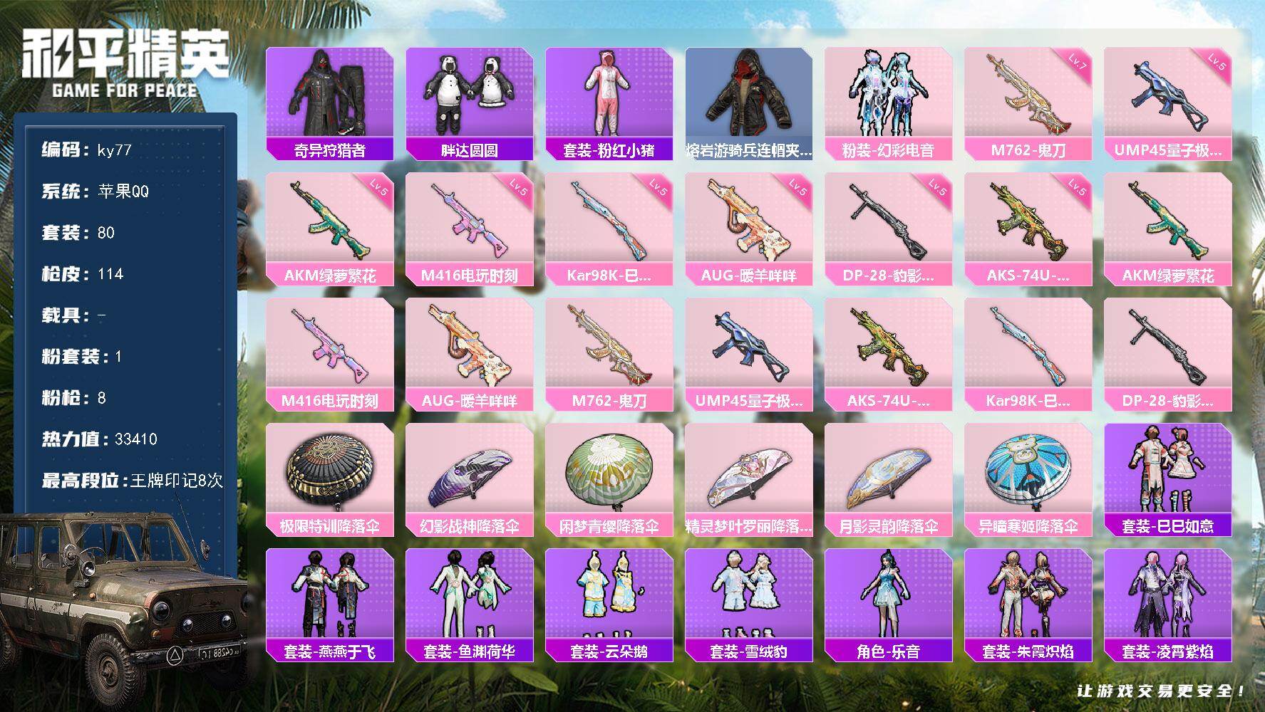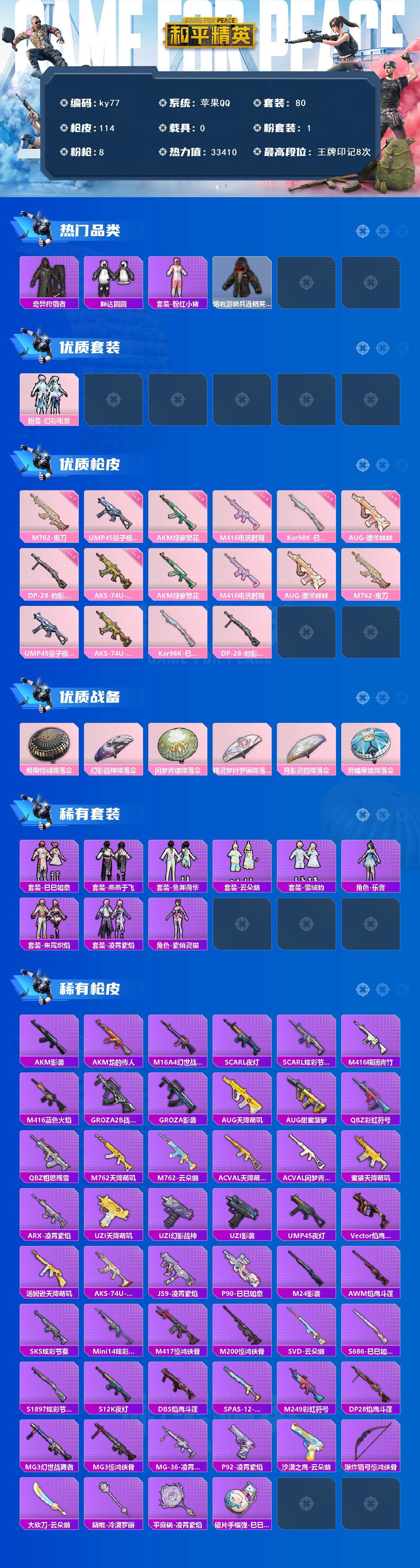 [16705032]苹果 手q-1粉装-8特效呛-0载具-1粉色飞行器-33410热力值-8王牌印记-80套装-114呛皮 【热门品类】:套装-奇异狩猎者,套装-胖达圆圆,套装-粉红小猪,熔岩游骑兵连帽夹克 【粉色套装】:粉装-幻彩电音 【粉色呛皮等级】:akm-绿萝繁花五级,m416-电玩时刻五级,aug-暖羊咩咩五级,m762-鬼刀七级,ump45-量子极限五级,aks-74u-森灵之息五级,kar98k-巳巳如意五级,dp-28-豹影疾电五级 【粉色呛皮】:akm-绿萝繁花,m416-电玩时刻,aug-暖羊咩咩,m762-鬼刀,ump45-量子极限,aks-74u-森灵之息,kar98k-巳巳如意,dp-28-豹影疾电 【粉色降落伞】:极限特训降落伞,幻影战神降落伞,闲梦青缨降落伞,精灵梦叶罗丽降落伞,月影灵韵降落伞,异瞳寒姬降落伞,炫彩糖果降落伞 【稀有套装】:套装-巳巳如意,套装-雪国风尚,套装-炫彩糖果,套装-燕燕于飞,套装-鱼渊荷华,套装-云朵鹅,套装-雪绒豹,角色-乐音,套装-朱霞炽焰,套装-凌霄紫焰,角色-紫俏灵猫 【稀有呛皮】:akm-影袭,akm-龙的传人,m16a4-幻世战舞者,scar-l-夜灯,scar-l-炫彩节奏,m416-糯团青竹,m416-蓝色火焰,groza-2b战斗服款,groza-影袭,aug-天降萌叽,aug-甜蜜菠萝,q-彩虹符号,q-相思残雪,m762-天降萌叽,m762-云朵鹅,ac-val-天降萌叽,ac-val-闲梦青缨,蜜獾-天降萌叽,arx-凌霄紫焰,uzi-天降萌叽,uzi-幻影战神,uzi-影袭,ump45-夜灯,vect-焰鹰斗篷,汤姆逊-天降萌叽,aks-74u-鬼刀,js9-凌霄紫焰,p90-巳巳如意,m24-影袭,awm-焰鹰斗篷,sks-炫彩节奏,mini14-炫彩节奏,m417-惊鸿侠骨,m200-惊鸿侠骨,svd-云朵鹅,s686-巳巳如意,s1897-炫彩节奏,s12k-夜灯,dbs-焰鹰斗篷,spas-12-云朵鹅,m249-彩虹符号,dp-28-焰鹰斗篷,mg3-幻世战舞者,mg3-惊鸿侠骨,mg-36-凌霄紫焰,p92-凌霄紫焰,沙墨之鹦-云朵鹅,爆炸猎弓-惊鸿侠骨,大砍刀-云朵鹅,撬棍-冷漠罗丽,平底锅-凌霄紫焰,破片手留单-巳巳如意 【其他套装】:套装-