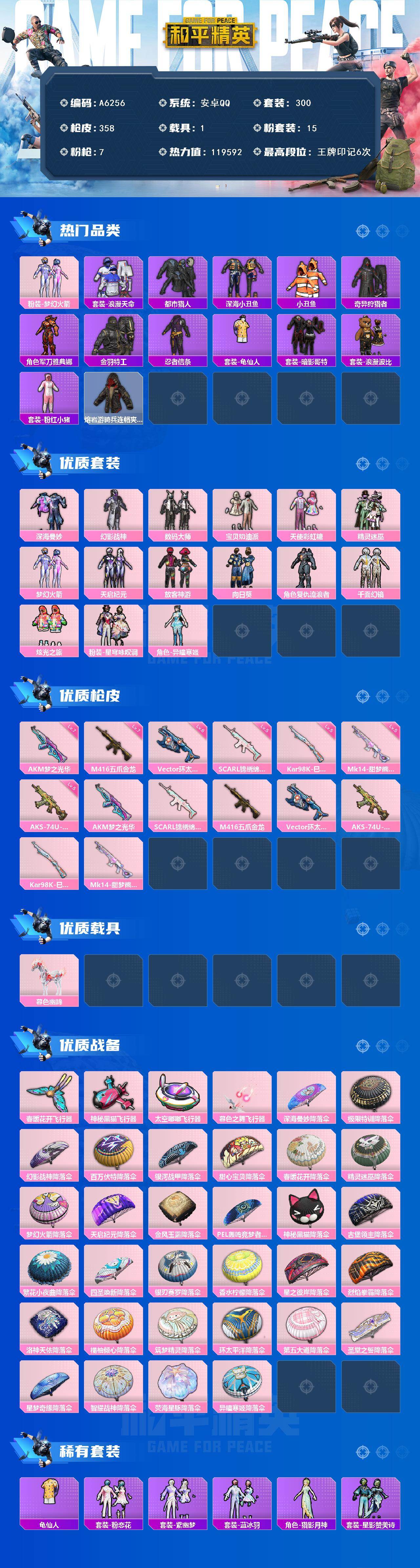 [16705310]安卓 【极品男神号 梦幻火箭 浪漫天命 都市猎人 深海小丑鱼 小丑鱼 奇异狩猎者 军刀雅典娜 金羽特工 暗影哥特 浪漫波比 熔岩游骑兵连帽夹克 akm-梦之光华七级 m416-五爪金龙七级 暮色幽蹄】手q-15粉装-7特效呛-1载具-5粉色飞行器-119592热力值-6王牌印记-300套装-358呛皮 【热门品类】:粉装-梦幻火箭,套装-浪漫天命,套装-都市猎人,套装-深海小丑鱼,套装-小丑鱼,套装-奇异狩猎者,角色-军刀雅典娜,套装-金羽特工,套装-忍者信条,套装-龟仙人,套装-暗影哥特,套装-浪漫波比,套装-粉红小猪,熔岩游骑兵连帽夹克 【粉色套装】:粉装-深海曼妙,粉装-幻影战神,粉装-数码大师,粉装-宝贝奶油派,粉装-天使彩虹糖,粉装-精灵迷巫,粉装-梦幻火箭,粉装-天启纪元,粉装-放客神游,粉装-向日葵,角色-复仇流浪者,粉装-千面幻镜,粉装-炫光之旅,粉装-星穹咏叹调,角色-异瞳寒姬 【粉色呛皮等级】:akm-梦之光华七级,scar-l-锦绣绵绵五级,m416-五爪金龙七级,vect-环太平洋六级,aks-74u-森灵之息五级,kar98k-巳巳如意五级,mk14-甜梦熊击五级 【粉色载具】:暮色幽蹄 【粉色呛皮】:akm-梦之光华,scar-l-锦绣绵绵,m416-五爪金龙,vect-环太平洋,aks-74u-森灵之息,kar98k-巳巳如意,mk14-甜梦熊击 【粉色飞行器】:春暖花开飞行器,神秘黑猫飞行器,太空嘟嘟飞行器,暮色之舞飞行器 【粉色降落伞】:深海曼妙降落伞,极限特训降落伞,幻影战神降落伞,百万伏特降落伞,银河战甲降落伞,甜心宝贝降落伞,春暖花开降落伞,精灵迷巫降落伞,梦幻火箭降落伞,天启纪元降落伞,金风玉露降落伞,pel轰鸣竞梦者降落伞,神秘黑猫降落伞,古堡领主降落伞,繁花小夜曲降落伞,四圣焕新降落伞,银刃赛罗降落伞,香水柠檬降落伞,星之彼岸降落伞,烈焰拳霸降落伞,洛神天依降落伞,橘柚倾心降落伞,筑梦精灵降落伞,环太平洋降落伞,第五大道降落伞,圣堂之誓降落伞,星梦奇缘降落伞,智耀战神降落伞,荧海星豚降落伞,异瞳寒姬降落伞,炫彩糖果降落伞 【稀有套装】:套装-龟仙人,套装-雪国风尚,套装-炫彩糖果,套装-粉恋花,套装-紫幽梦,套装-蓝冰羽,角色-猎影月神,套装-星影赞美诗,套装-彩虹兔,套装-