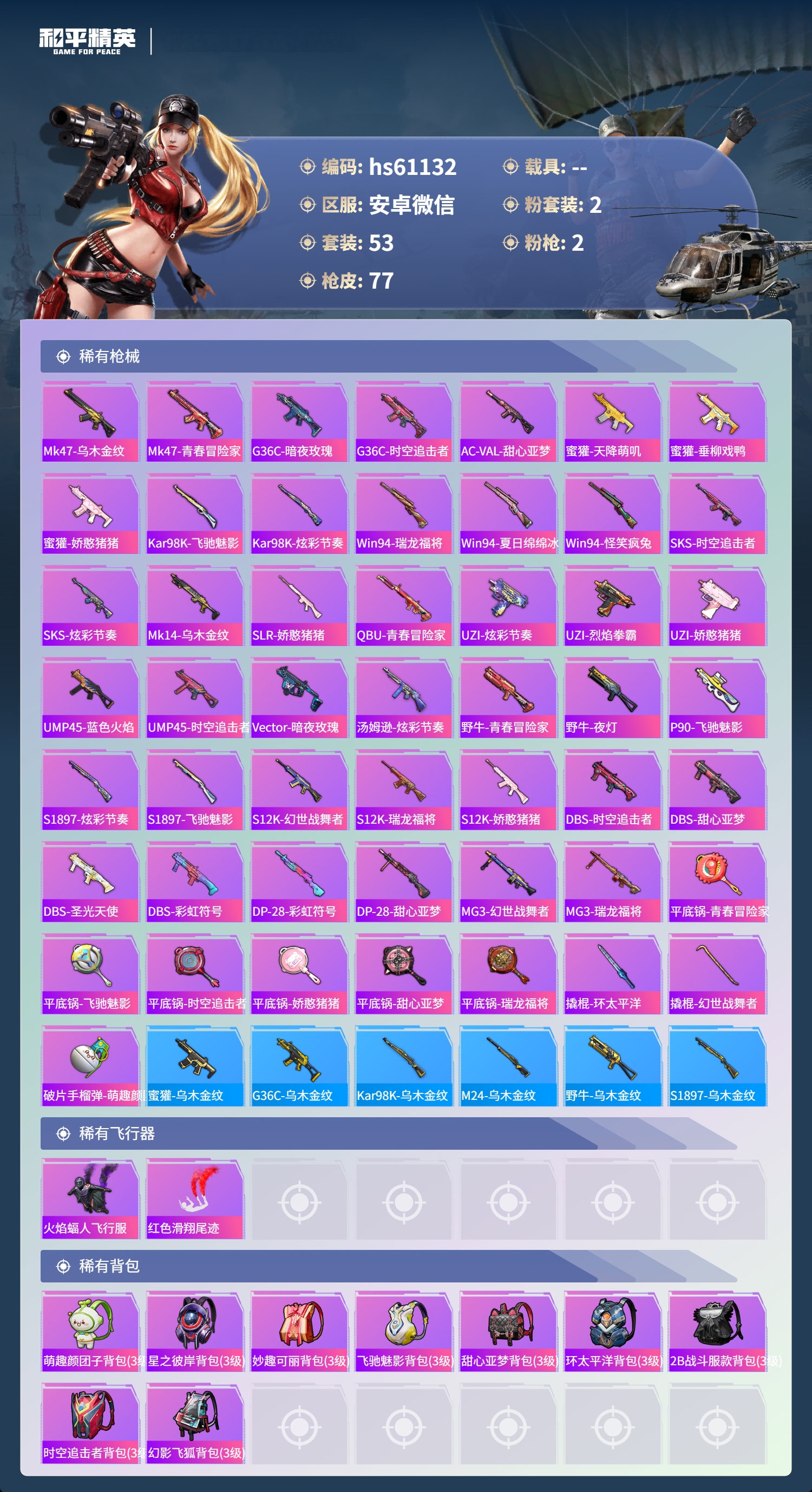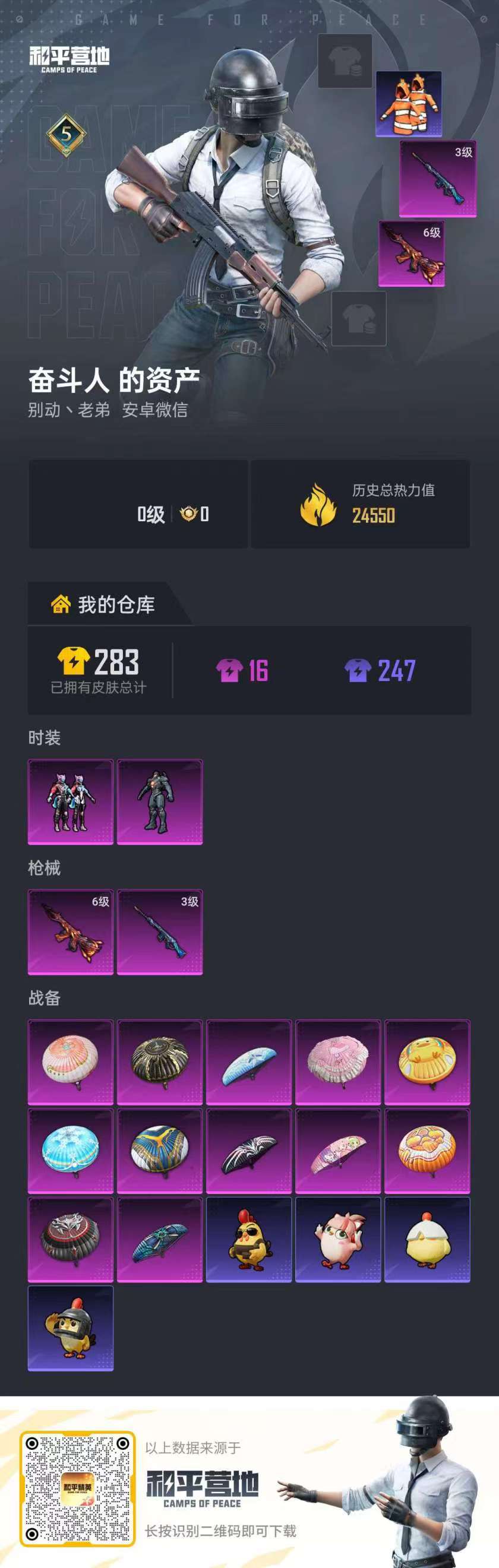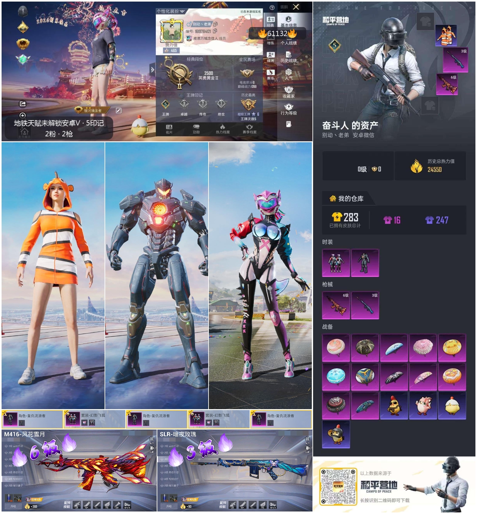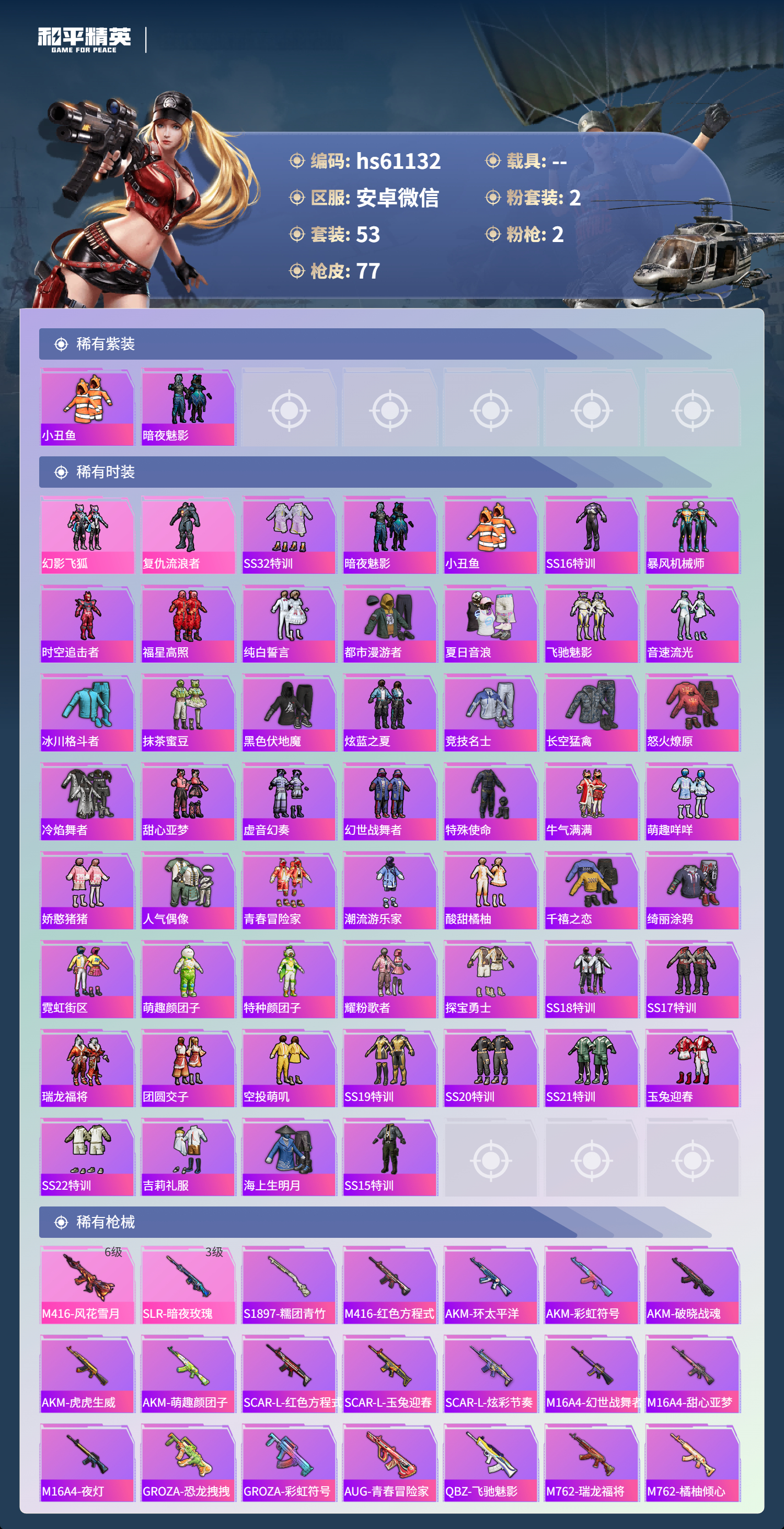 hs61132 安卓微信-5王牌印记-2粉装-2特效呛-24550热力值-53套装-77呛皮 【2粉装】套装-幻影飞狐角色-复仇流浪者 【2特效呛】slr-暗夜玫瑰/3级m416-风花雪月/6级 【2稀有紫装】小丑鱼暗夜魅影 【53稀有时装】ss32特训暗夜魅影小丑鱼幻影飞狐复仇流浪者ss16特训暴风机械师时空追击者福星高照纯白誓言都市漫游者夏日音浪飞驰魅影音速流光