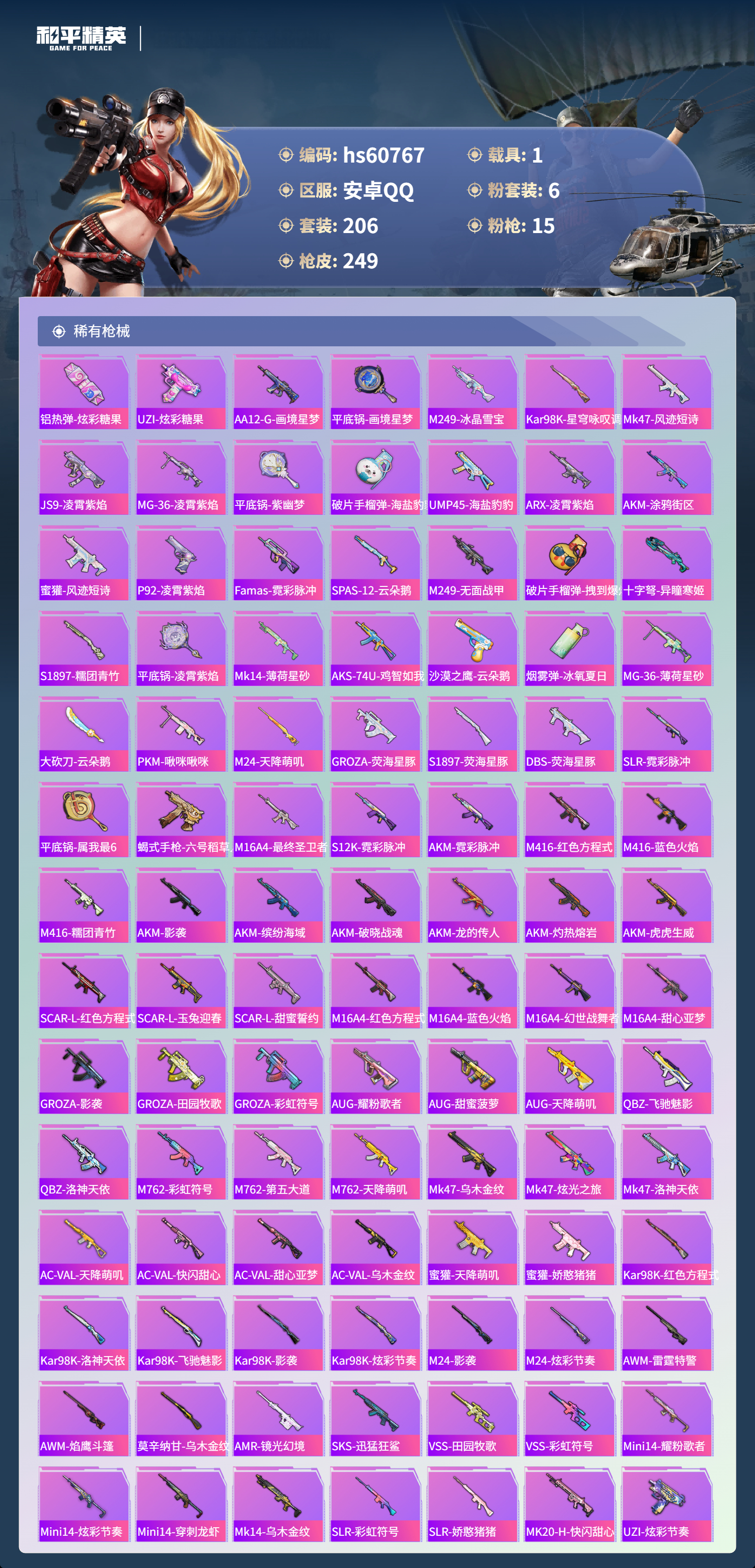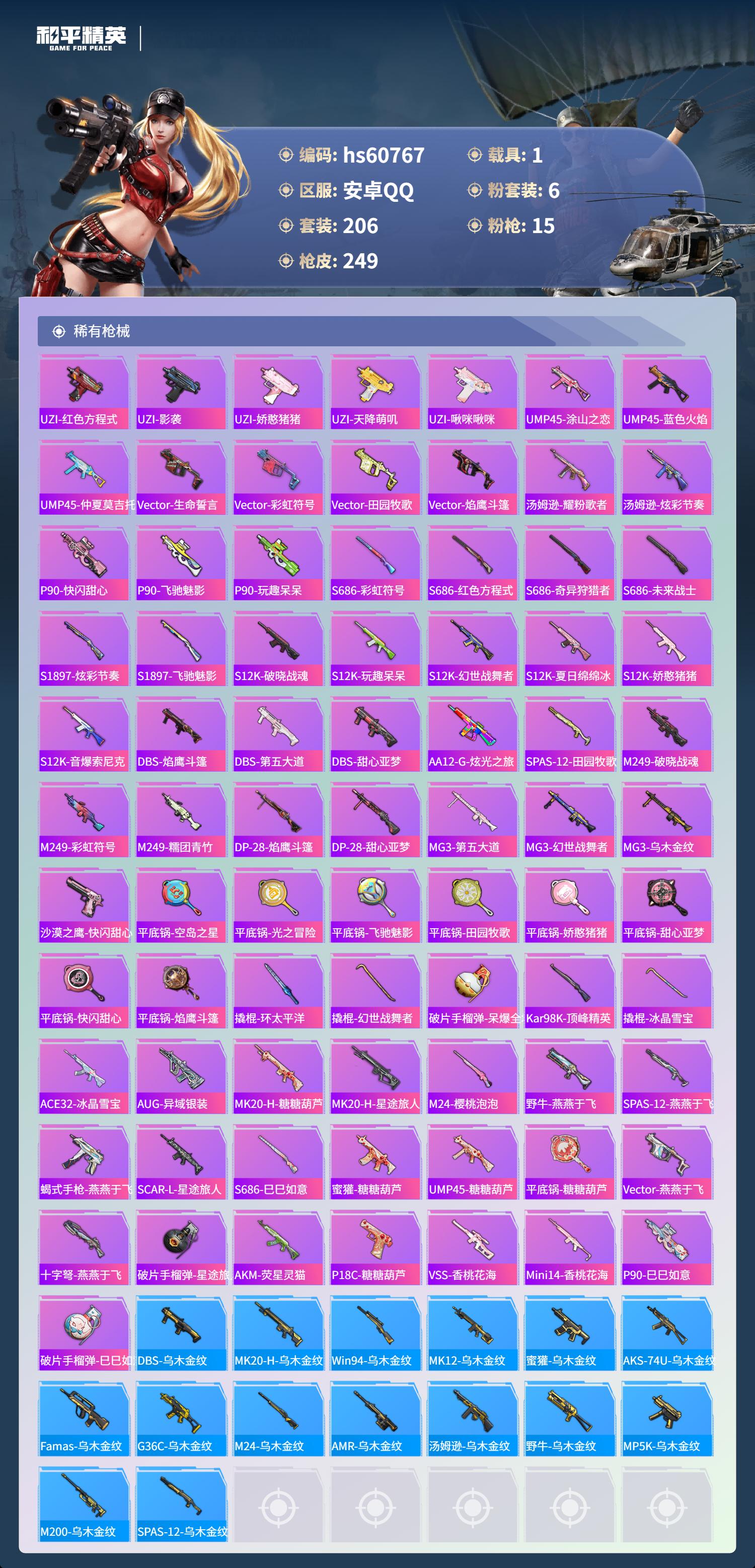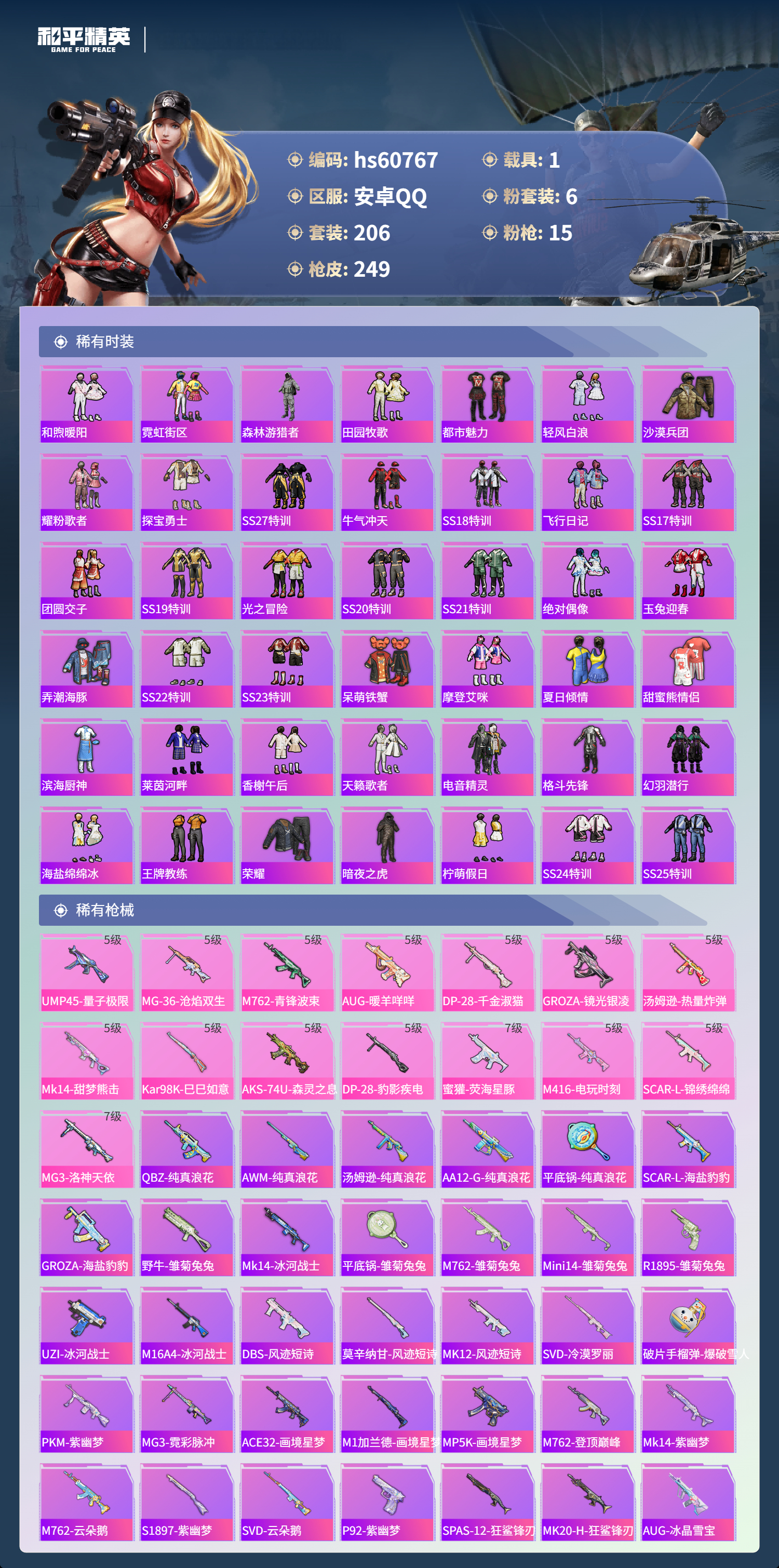 hs60767 安卓手q-16王牌印记-6粉装-15特效呛-1载具-84966热力值-206套装-249呛皮-3卓越印记-1传奇印记 【6粉装】套装-仲夏莫吉托套装-缤纷油彩角色-荧海星豚角色-千金淑猫套装-第五大道角色-冷漠罗丽 【15特效呛】aks-74u-森灵之息/5级ump45-量子极限/5级mk14-甜梦熊击/5级dp-28-千金淑猫/5级m762-青锋波束/5级汤姆