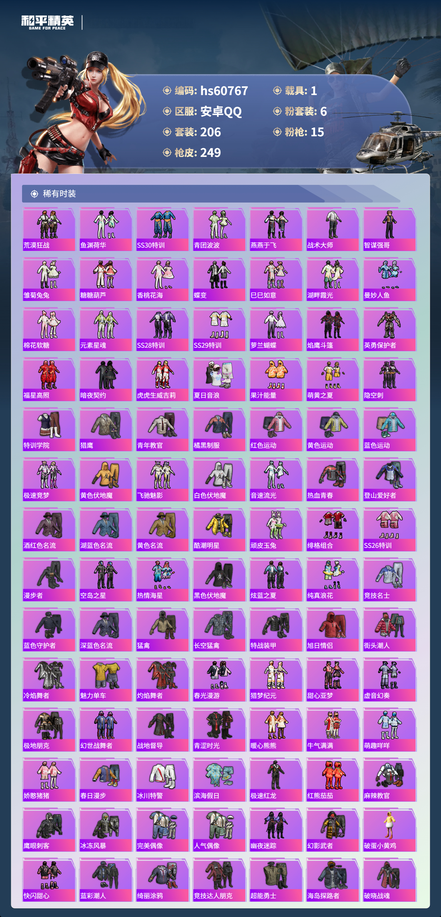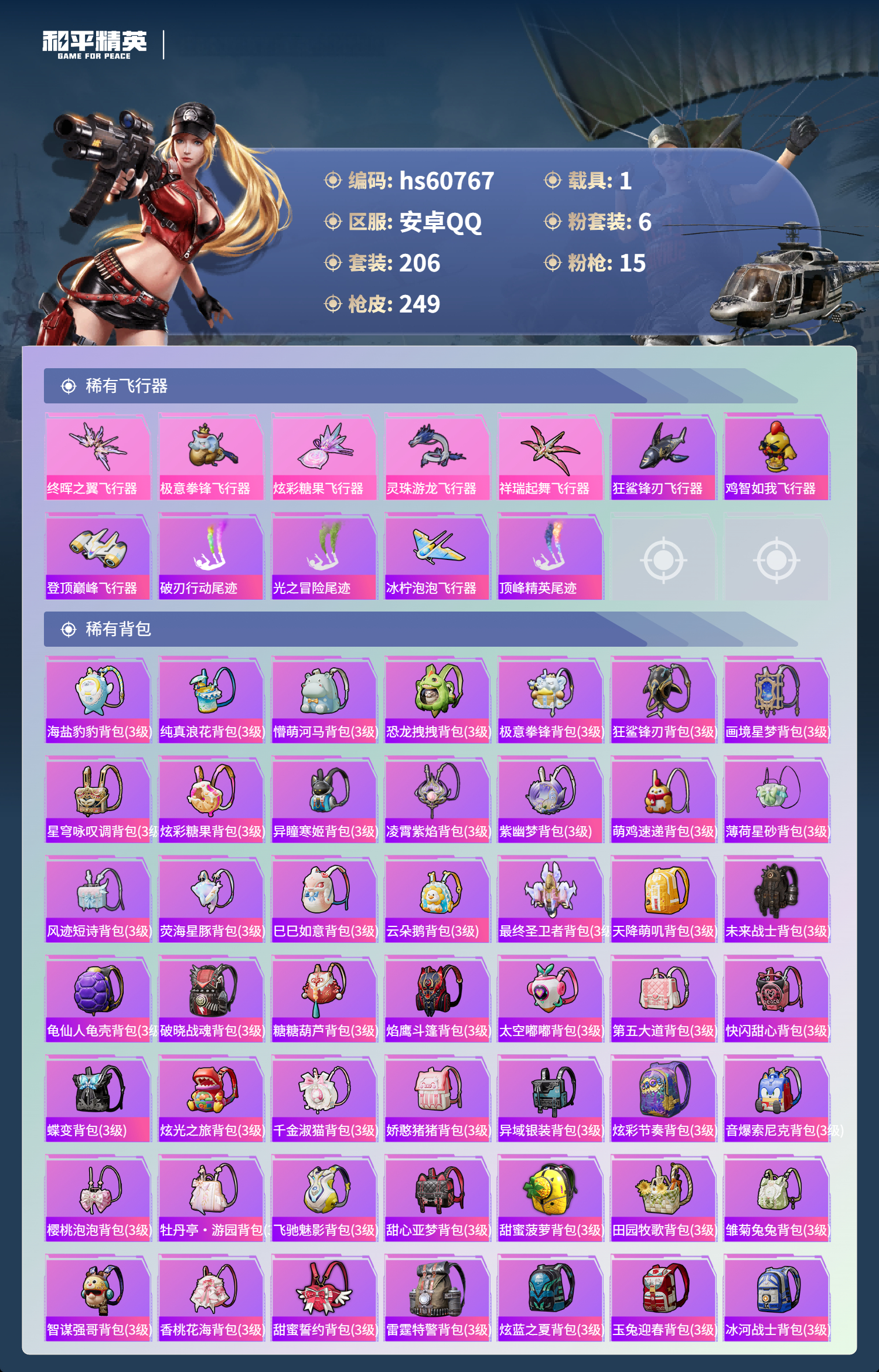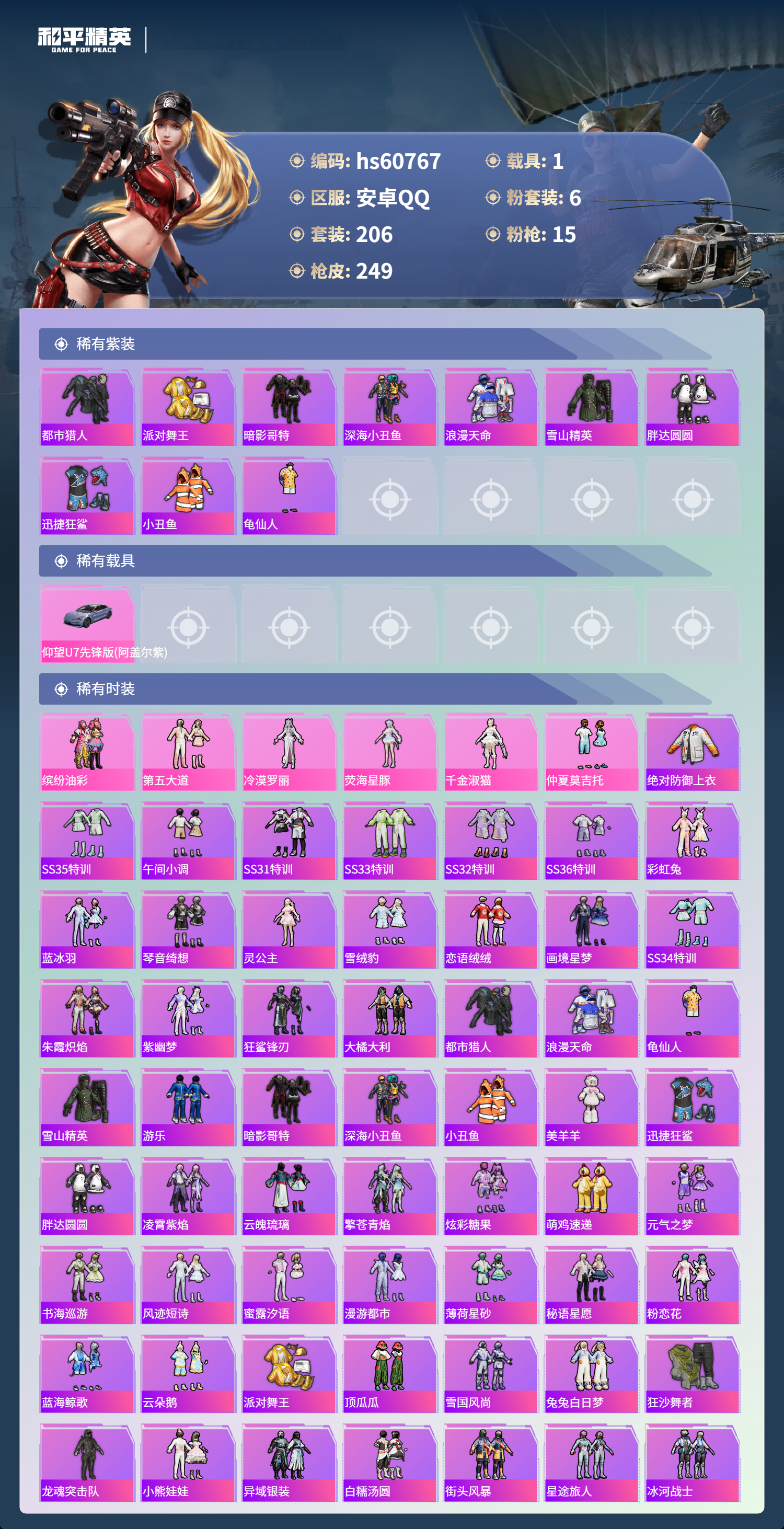 hs60767 安卓手q-16王牌印记-6粉装-15特效呛-1载具-84966热力值-206套装-249呛皮-3卓越印记-1传奇印记 【6粉装】套装-仲夏莫吉托套装-缤纷油彩角色-荧海星豚角色-千金淑猫套装-第五大道角色-冷漠罗丽 【15特效呛】aks-74u-森灵之息/5级ump45-量子极限/5级mk14-甜梦熊击/5级dp-28-千金淑猫/5级m762-青锋波束/5级汤姆