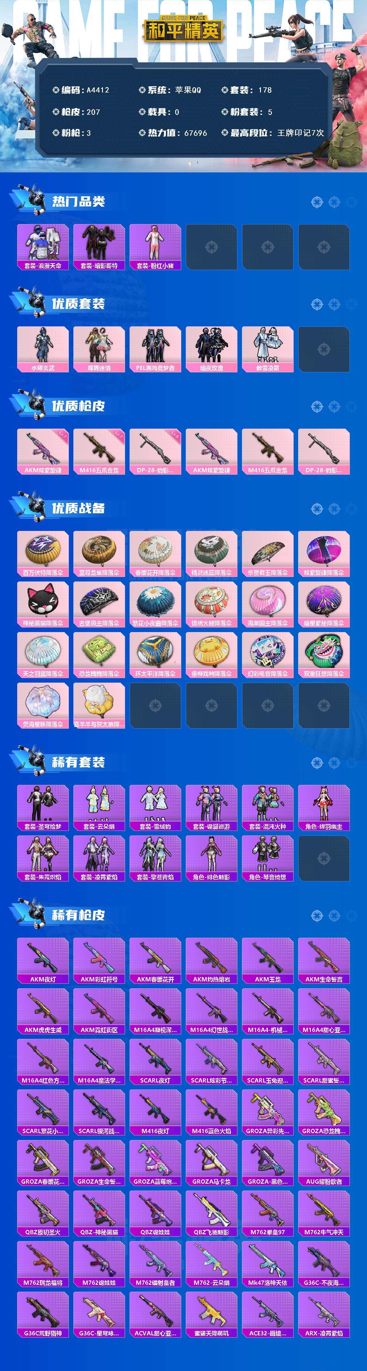 [16705524]苹果 【公主号 浪漫天命/暗影哥特/蝶舞迷情/暗夜玫瑰/m416-五爪金龙七级】手q-5粉装-3特效呛-0载具-0粉色飞行器-67696热力值-7王牌印记-178套装-207呛皮 【热门品类】:套装-浪漫天命,套装-暗影哥特,套装-粉红小猪 【粉色套装】:粉装-水曜玄武,粉装-蝶舞迷情,粉装-pel轰鸣竞梦者,粉装-暗夜玫瑰,粉装-傲雪凌霜 【粉色呛皮等级】:akm-炫紫旋律七级,m416-五爪金龙七级,dp-28-豹影疾电五级 【粉色呛皮】:akm-炫紫旋律,m416-五爪金龙,dp-28-豹影疾电 【粉色降落伞】:百万伏特降落伞,至尊龙雀降落伞,春暖花开降落伞,精灵迷巫降落伞,华贵君王降落伞,炫紫旋律降落伞,神秘黑猫降落伞,古堡领主降落伞,繁花小夜曲降落伞,锦绣火鲤降落伞,海渊国主降落伞,暗星紫秘降落伞,天之羽翼降落伞,恐龙拽拽降落伞,环太平洋降落伞,垂柳戏鸭降落伞,幻彩电音降落伞,双重狂想降落伞,荧海星豚降落伞,喜羊羊与灰太狼降落伞,炫彩糖果降落伞 【稀有套装】:套装-圣穹绘梦,套装-云朵鹅,套装-雪绒豹,套装-诡诞巡游,套装-混沌火种,角色-绛羽幽主,套装-朱霞炽焰,套装-凌霄紫焰,套装-擎苍青焰,角色-绯色魅影,套装-琴音绮想 【稀有呛皮】:akm-夜灯,akm-彩虹符号,akm-春暖花开,akm-灼热熔岩,akm-玉龙,akm-生命誓言,akm-虎虎生威,akm-霓虹街区,m16a4-凝视深渊,m16a4-幻世战舞者,m16a4-机械英豪,m16a4-甜心亚梦,m16a4-红色方程式,m16a4-魔法学院,scar-l-夜灯,scar-l-炫彩节奏,scar-l-玉兔迎春,scar-l-甜蜜誓约,scar-l-繁花小夜曲,scar-l-银河战甲,m416-夜灯,m416-蓝色火焰,groza-异彩先驱,groza-恐龙拽拽,groza-春暖花开,groza-生命誓言,groza-蓝莓炮弹,groza-马卡龙,groza-黑色刀锋,aug-耀粉歌者,q-原初圣火,q-神秘黑猫,q-诡娃娃,q-飞驰魅影,m762-拳皇97,m762-牛气冲天,m762-瑞龙福将,m762-诡娃娃,m762-镭射皇者,m762-云朵鹅,mk47-洛神天依,g36c-不夜海上花,g36c-荒野猎神,g36c-星穹咏叹调,ac-val-甜心亚梦,