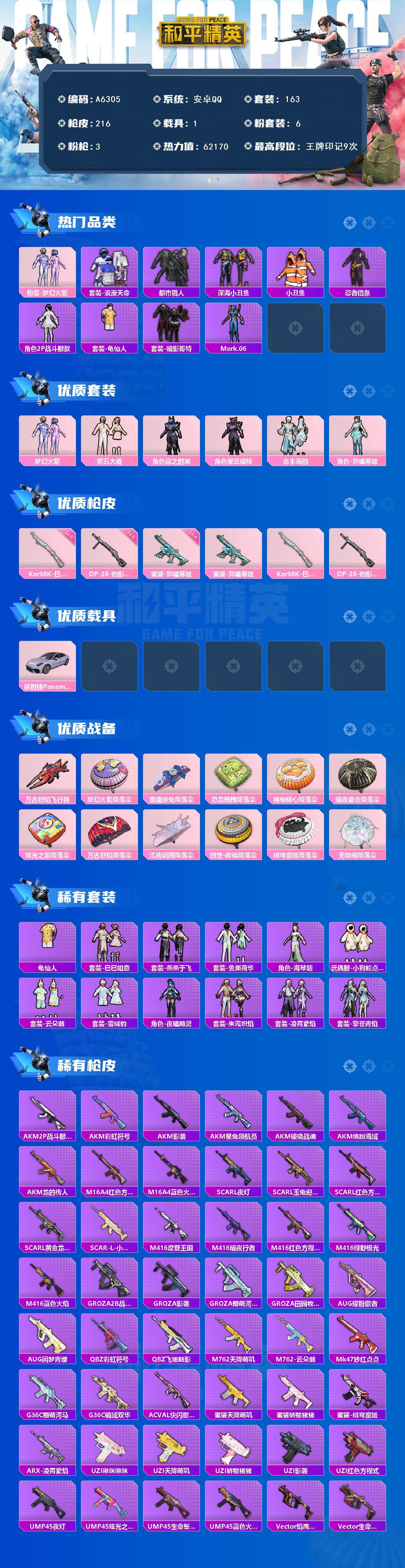 [16705943]安卓 【男神号 梦幻火箭 浪漫天命 都市猎人 深海小丑鱼 小丑鱼 2p战斗服 暗影哥特 蓝螳螂 保时捷panamera(星辰紫)】手q-6粉装-3特效呛-1载具-2粉色飞行器-62170热力值-9王牌印记-163套装-216呛皮 【热门品类】:粉装-梦幻火箭,套装-浪漫天命,套装-都市猎人,套装-深海小丑鱼,套装-小丑鱼,套装-忍者信条,角色-2p战斗服款,套装-龟仙人,套装-暗影哥特,角色-mark.06 【粉色套装】:粉装-梦幻火箭,粉装-第五大道,角色-宙之时溯,角色-星云暗核,粉装-金丰海韵,角色-异瞳寒姬 【粉色呛皮等级】:蜜獾-异瞳寒姬四级,kar98k-巳巳如意五级,dp-28-豹影疾电五级 【粉色载具】:保时捷panamera(星辰紫) 【粉色呛皮】:蜜獾-异瞳寒姬,kar98k-巳巳如意,dp-28-豹影疾电 【粉色飞行器】:万古烈焰飞行器 【粉色降落伞】:梦幻火箭降落伞,童趣迷兔降落伞,恐龙拽拽降落伞,橘柚倾心降落伞,暗夜鎏金降落伞,炫光之旅降落伞,万古烈焰降落伞,江南烟雨降落伞,创世·救赎降落伞,绯穹魔姬降落伞,无垠阁降落伞,炫彩糖果降落伞 【稀有套装】:套装-龟仙人,套装-巳巳如意,套装-雪国风尚,套装-炫彩糖果,套装-燕燕于飞,套装-鱼渊荷华,角色-海琴烟,玩偶服-小狗蛇点点,套装-云朵鹅,套装-雪绒豹,角色-夜瞳黯灵,套装-朱霞炽焰,套装-凌霄紫焰,套装-擎苍青焰 【稀有呛皮】:aug-冰晶雪宝,akm-2p战斗服款,akm-彩虹符号,akm-影袭,akm-星兔领航员,akm-破晓战魂,akm-缤纷海域,akm-龙的传人,m16a4-红色方程式,m16a4-蓝色火焰,scar-l-夜灯,scar-l-玉兔迎春,scar-l-红色方程式,scar-l-黄金龙骨,scar-l-小狗蛇点点,m416-摩登王国,m416-暗夜行者,m416-红色方程式,m416-绿野极光,m416-蓝色火焰,groza-2b战斗服款,groza-影袭,groza-懵萌河马,groza-田园牧歌,aug-耀粉歌者,aug-闲梦青缨,q-彩虹符号,q-飞驰魅影,m762-天降萌叽,m762-云朵鹅,mk47-妙红点点,g36c-镜域双华,g36c-懵萌河马,ac-val-快闪甜心,蜜獾-天降萌叽,蜜獾-娇憨猪猪,蜜獾-绯穹魔姬,arx-凌霄紫焰