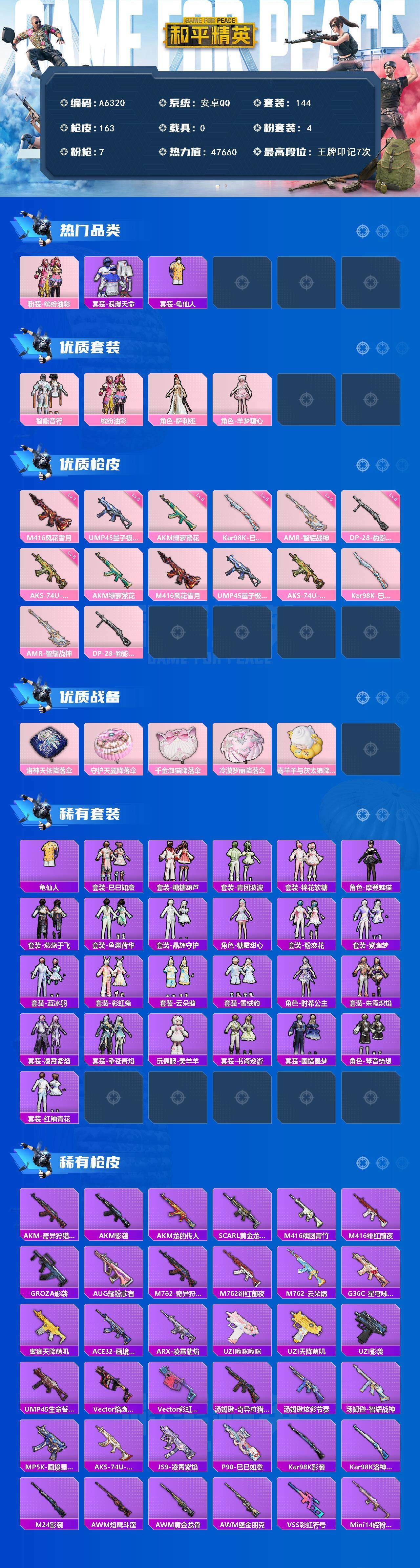 [16706152]安卓 【男神号 缤纷油彩 浪漫天命 m416-风花雪月七级】手q-4粉装-7特效呛-0载具-0粉色飞行器-47660热力值-7王牌印记-144套装-163呛皮 【热门品类】:粉装-缤纷油彩,套装-浪漫天命,套装-龟仙人 【粉色套装】:粉装-智能音符,粉装-缤纷油彩,角色-萨利娅,角色-羊梦糖心 【粉色呛皮等级】:akm-绿萝繁花五级,m416-风花雪月七级,ump45-量子极限五级,aks-74u-森灵之息五级,kar98k-巳巳如意五级,amr-智耀战神五级,dp-28-豹影疾电五级 【粉色呛皮】:akm-绿萝繁花,m416-风花雪月,ump45-量子极限,aks-74u-森灵之息,kar98k-巳巳如意,amr-智耀战神,dp-28-豹影疾电 【粉色降落伞】:洛神天依降落伞,守护天翼降落伞,千金淑猫降落伞,冷漠罗丽降落伞,喜羊羊与灰太狼降落伞 【稀有套装】:套装-龟仙人,套装-巳巳如意,套装-糖糖葫芦,套装-青团波波,套装-棉花软糖,角色-摩登魅猫,套装-燕燕于飞,套装-鱼渊荷华,套装-晶辉守护,角色-糖霜甜心,套装-粉恋花,套装-紫幽梦,套装-蓝冰羽,套装-彩虹兔,套装-云朵鹅,套装-雪绒豹,角色-时希公主,套装-朱霞炽焰,套装-凌霄紫焰,套装-擎苍青焰,玩偶服-美羊羊,套装-书海巡游,套装-画境星梦,套装-琴音绮想,套装-红釉青花 【稀有呛皮】:akm-奇异狩猎者,akm-影袭,akm-龙的传人,scar-l-黄金龙骨,m416-糯团青竹,m416-绯红前夜,groza-影袭,aug-耀粉歌者,m762-奇异狩猎者,m762-绯红前夜,m762-云朵鹅,g36c-星穹咏叹调,蜜獾-天降萌叽,ace32-画境星梦,arx-凌霄紫焰,uzi-啾咪啾咪,uzi-天降萌叽,uzi-影袭,ump45-生命誓言,vect-焰鹰斗篷,vect-彩虹符号,汤姆逊-奇异狩猎者,汤姆逊-炫彩节奏,汤姆逊-智耀战神,mp5k-画境星梦,aks-74u-鬼刀,js9-凌霄紫焰,p90-巳巳如意,kar98k-影袭,kar98k-洛神天依,m24-影袭,awm-焰鹰斗篷,awm-鎏金朋克,awm-黄金龙骨,vss-彩虹符号,mini14-耀粉歌者,m417-惊鸿侠骨,mk20-h-莲影清波,m200-惊鸿侠骨,m200-六号稻草人,svd-云