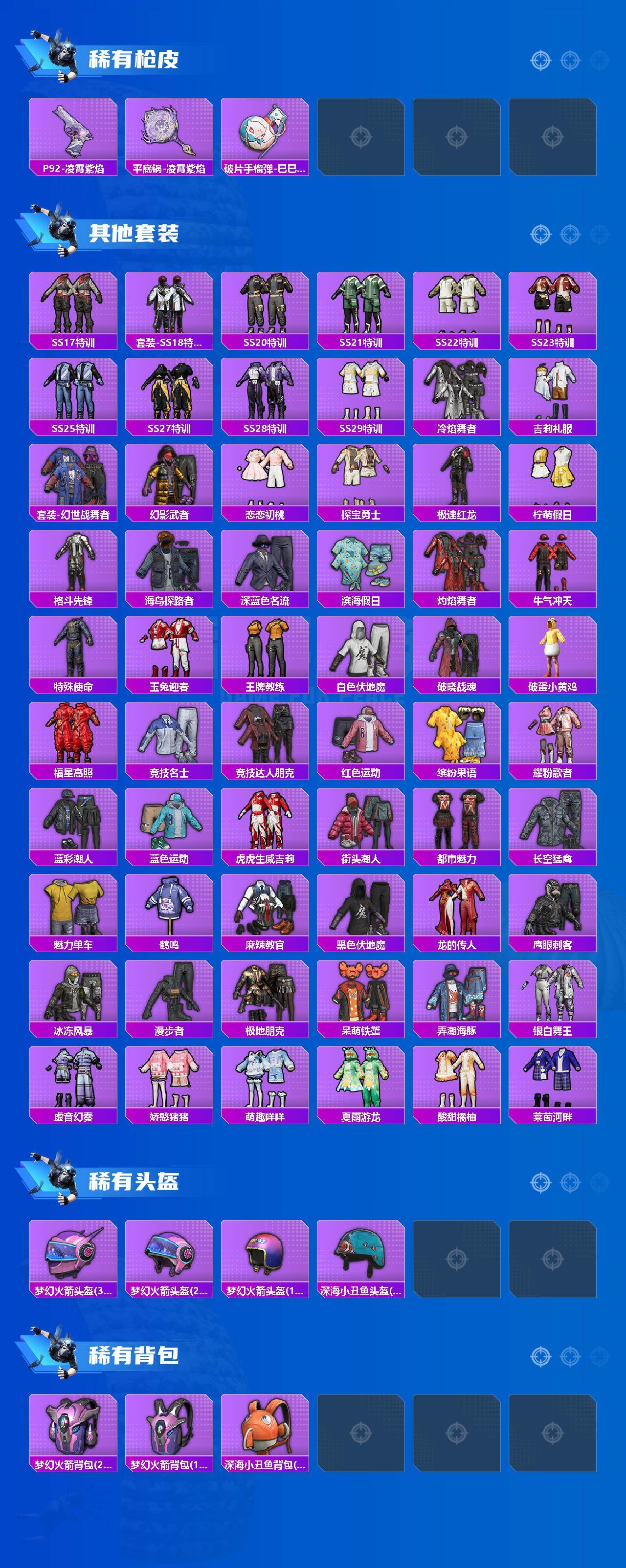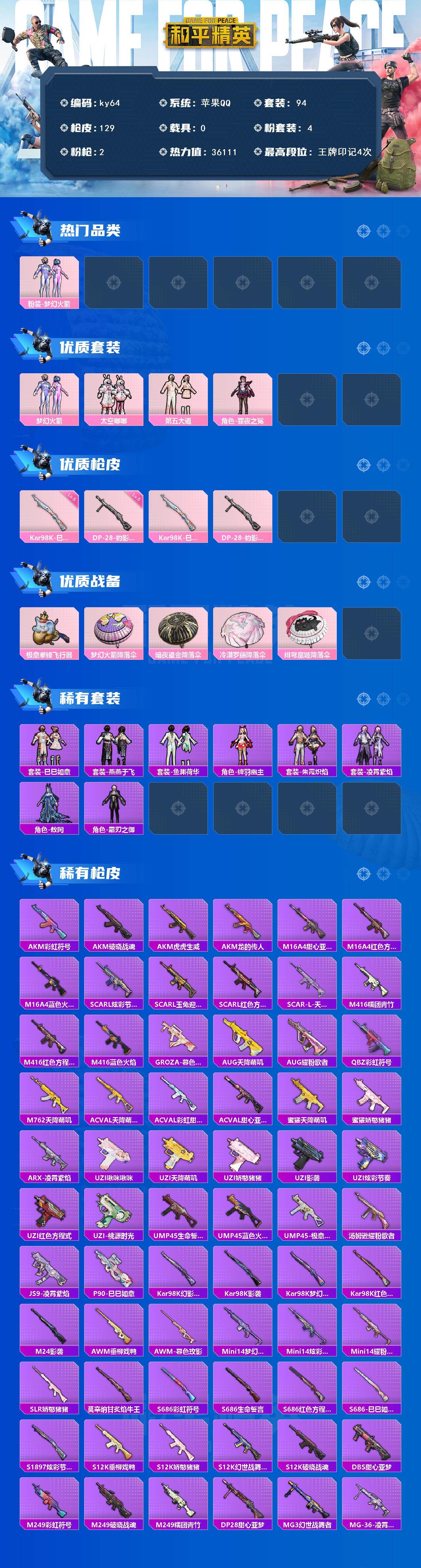 苹果 手q-4粉装-2特效呛-0载具-1粉色飞行器-36111热力值-4王牌印记-94套装-129呛皮 【热门品类】:粉装-梦幻火箭 【粉色套装】:粉装-梦幻火箭,粉装-太空嘟嘟,粉装-第五大道,角色-罪夜之冕 【粉色呛皮等级】:kar98k-巳巳如意五级,dp-28-豹影疾电五级 【粉色呛