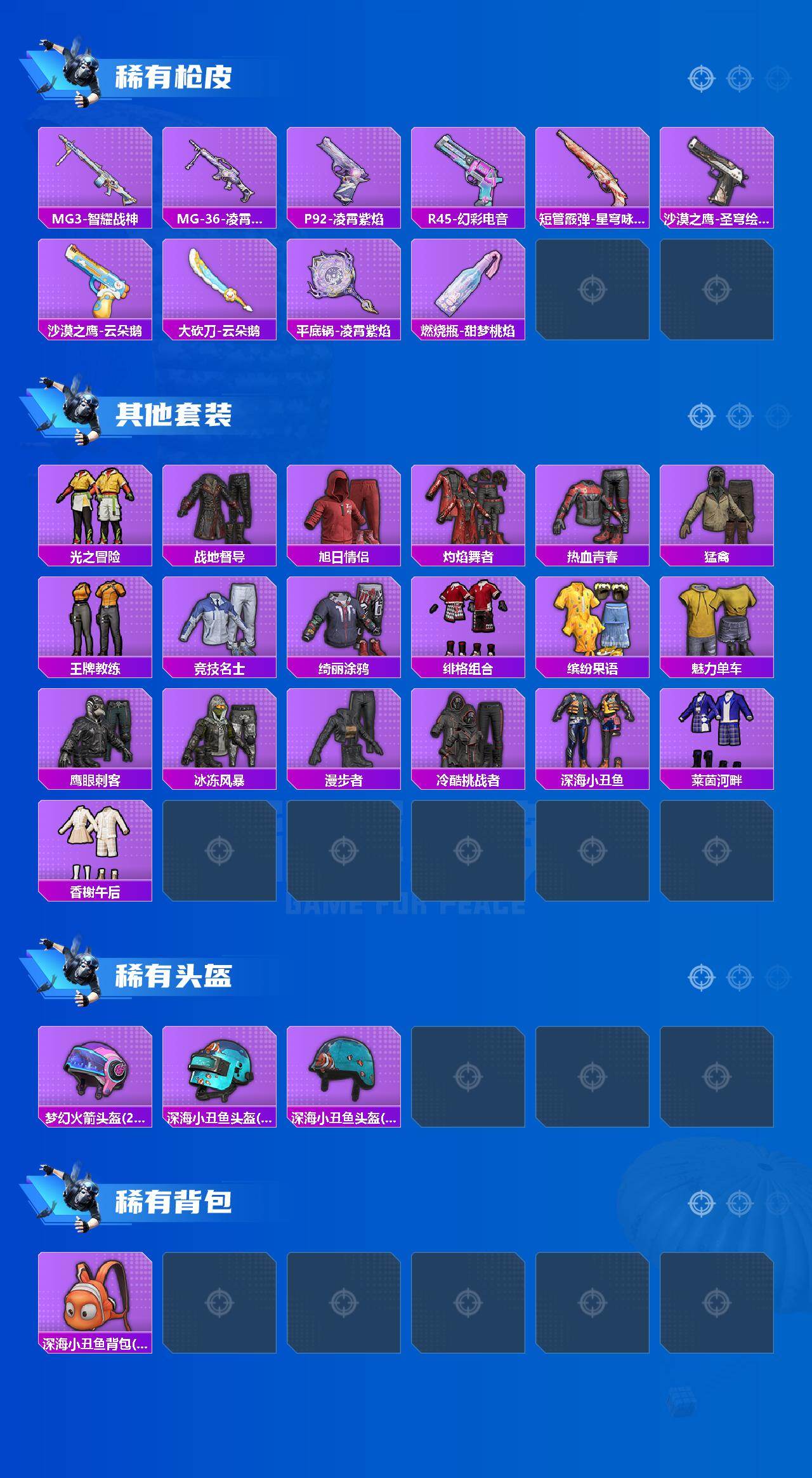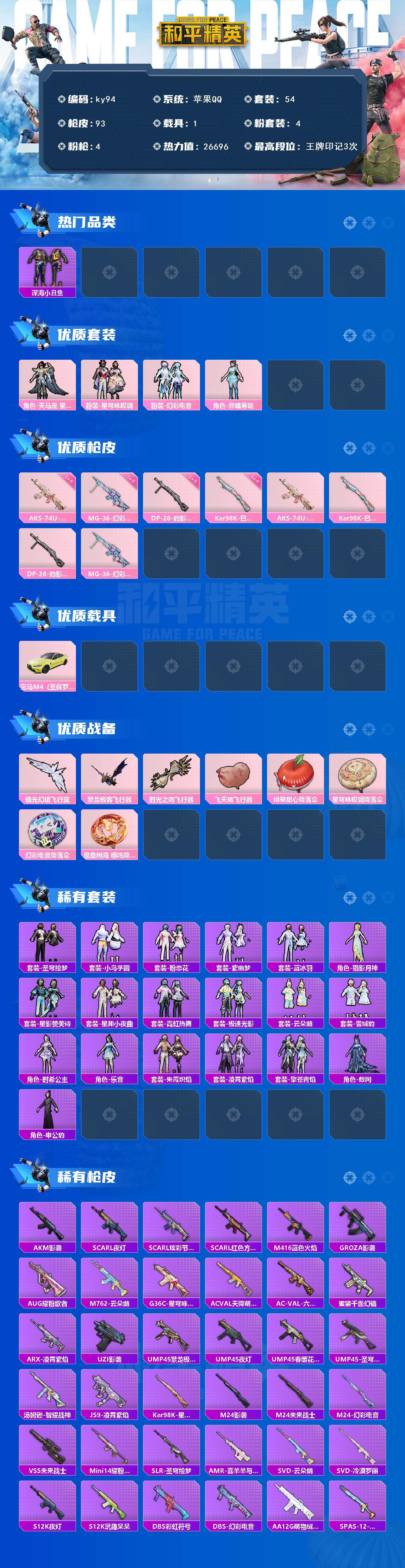 苹果 手q-4粉装-4特效呛-1载具-5粉色飞行器-26696热力值-3王牌印记-54套装-93呛皮 【热门品类】:套装-深海小丑鱼 【粉色套装】:角色-天马座 星矢,粉装-星穹咏叹调,粉装-幻彩电音,角色-异瞳寒姬 【粉色呛皮等级】:aks-74u-星穹咏叹调六级,kar98k-巳巳如意四级