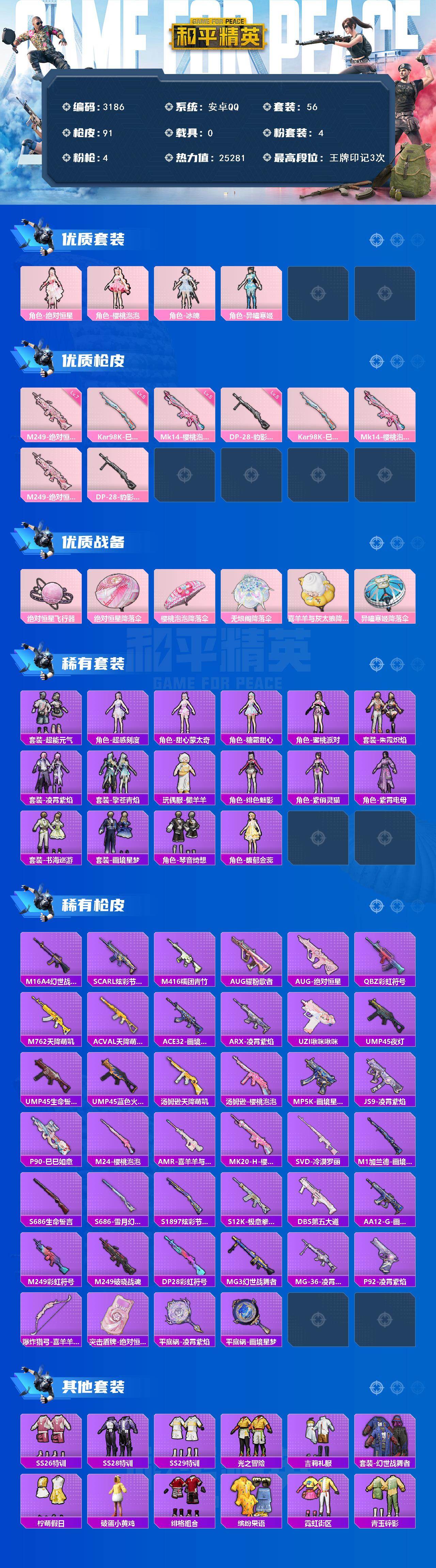 安卓 手q-4粉装-4特效呛-0载具-2粉色飞行器-25281热力值-3王牌印记-56套装-91呛皮 【粉色套装】:角色-绝对恒星,角色-樱桃泡泡,角色-冰魄,角色-异瞳寒姬 【粉色呛皮等级】:kar98k-巳巳如意五级,mk14-樱桃泡泡五级,m249-绝对恒星七级,dp-28-豹影疾电五级 【粉色呛皮】:kar98k-巳巳如意,mk14-樱桃泡泡,m249-绝对恒星,dp-28-豹影疾电 【粉色飞行器】:绝对恒星飞行器 【粉色降落伞】:绝对恒星降落伞,樱桃泡泡降落伞,无垠阁降落伞,喜羊羊与灰太狼降落伞,异瞳寒姬降落伞,炫彩糖果降落伞 【稀有套装】:套装-超能元气,角色-超感刻度,角色-甜心蒙太奇,套装-雪国风尚,套装-炫彩糖果,角色-糖霜甜心,角色-蜜桃派对,套装-朱霞炽焰,套装-凌霄紫焰,套装-擎苍青焰,玩偶服-懒羊羊,角色-绯色魅影,角色-紫俏灵猫,角色-紫霄电母,套装-书海巡游,套装-画境星梦,套装-琴音绮想,角色-馥郁金蕊 【稀有呛皮】:aug-冰晶雪宝,m16a4-幻世战舞者,scar-l-炫彩节奏,m416-糯团青竹,aug-耀粉歌者,aug-绝对恒星,q-彩虹符号,m762-天降萌叽,ac-val-天降萌叽,ace32-画境星梦,arx-凌霄紫焰,uzi-啾咪啾咪,ump45-夜灯,ump45-生命誓言,ump45-蓝色火焰,汤姆逊-天降萌叽,汤姆逊-樱桃泡泡,mp5k-画境星梦,js9-凌霄紫焰,p90-巳巳如意,m24-樱桃泡泡,amr-喜羊羊与灰太狼,mk20-h-樱桃泡泡,svd-冷漠罗丽,m1加兰德-画境星梦,s686-生命誓言,s686-雪月幻音,s1897-炫彩节奏,s12k-极意拳锋,dbs-第五大道,aa12-g-画境星梦,m249-彩虹符号,m249-破晓战魂,dp-28-彩虹符号,mg3-幻世战舞者,mg-36-凌霄紫焰,p92-凌霄紫焰,爆炸猎弓-喜羊羊与灰太狼,突击盾牌-绝对恒星,平底锅-凌霄紫焰,平底锅-画境星梦 【其他套装】:套装-ss26特训,套装-ss28特训,套装-ss29特训,套装-光之冒险,套装-吉莉礼服,套装-幻世战舞者,套装-柠萌假日,套装-破蛋小黄鸡,套装-绯格组合,套装-缤纷果语,套装-霓虹街区,套装-青玉碎影 【