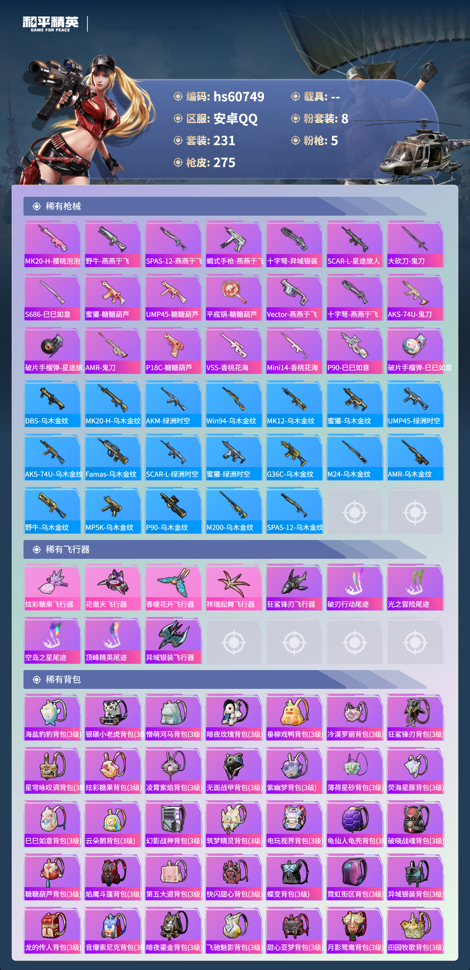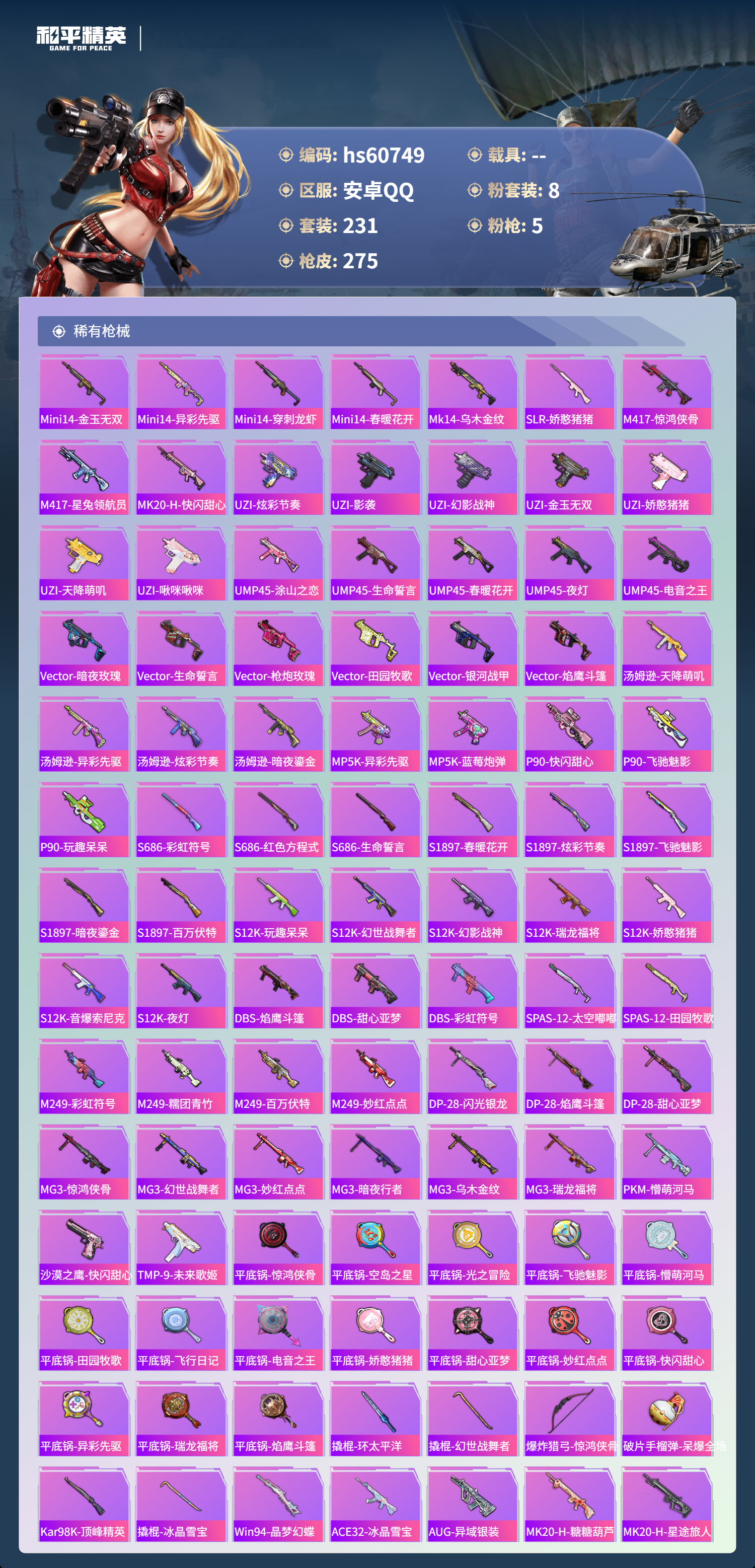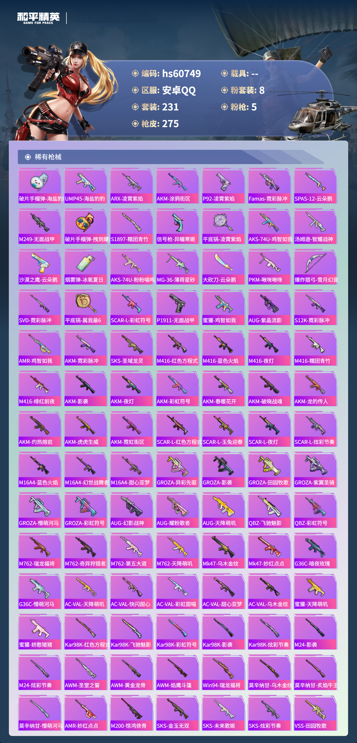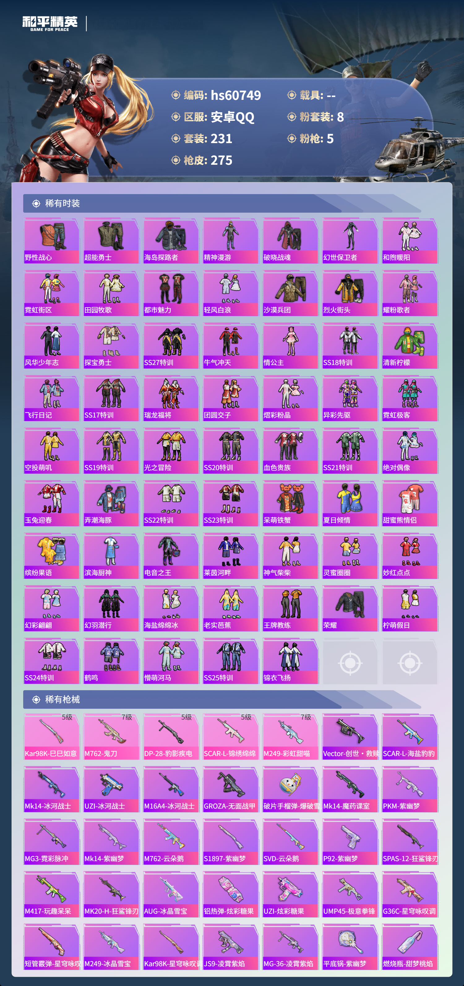 0载具-231套装-275呛皮-hs60749 安卓手q-19王牌印记-8粉装-5特效呛-83735热力值-231套装-275呛皮-13卓越印记-6传奇印记 【8粉装】套装-碧穹智者套装-放客神游套装-第五大道角色-萨利娅角色-复仇流浪者套装-幻彩电音套装-极限特训套装-荒野猎神 【5特效呛】kar98k-巳巳如意/5级m249-彩虹甜喵/7级m762-鬼刀/7级dp-28-豹影疾电/5级scar-l-锦绣