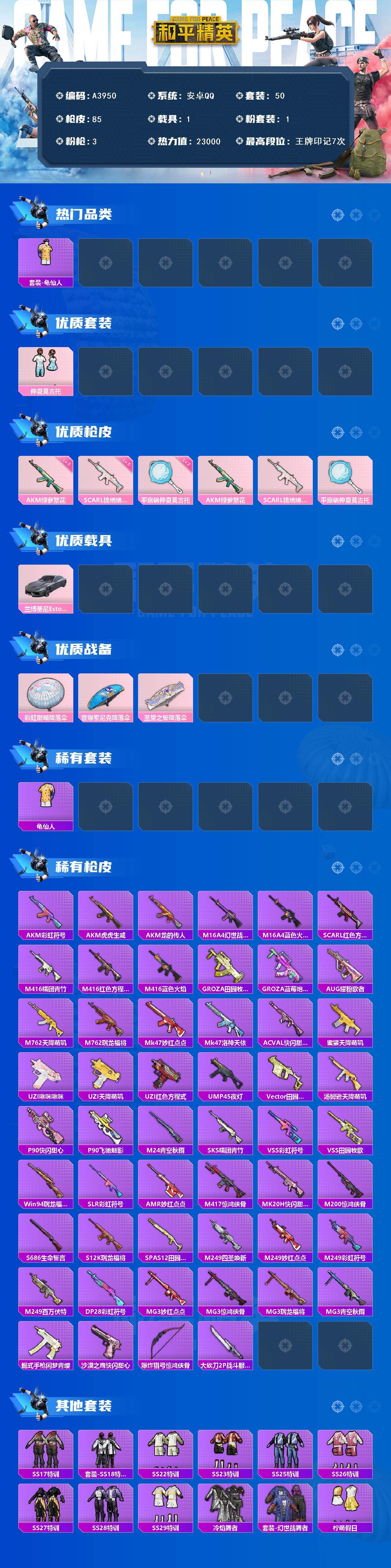 [16709930]安卓【小号/scar-l-锦绣绵绵五级/兰博基尼estoque(银翼灰)】 手q-1粉装-3特效呛-1载具-0粉色飞行器-23000热力值-7王牌印记-50套装-85呛皮 【热门品类】:套装-龟仙人 【粉色套装】:粉装-仲夏莫吉托 【粉色呛皮等级】:akm-绿萝繁花五级,scar-l-锦绣绵绵五级,平底锅-仲夏莫吉托二级 【粉色载具】:兰博基尼estoque(银翼灰) 【粉色呛皮】:akm-绿萝繁花,scar-l-锦绣绵绵,平底锅-仲夏莫吉托 【粉色降落伞】:彩虹甜喵降落伞,音爆索尼克降落伞,圣堂之誓降落伞,炫彩糖果降落伞 【稀有套装】:套装-龟仙人 【稀有呛皮】:akm-彩虹符号,akm-虎虎生威,akm-龙的传人,m16a4-幻世战舞者,m16a4-蓝色火焰,scar-l-红色方程式,m416-糯团青竹,m416-红色方程式,m416-蓝色火焰,groza-田园牧歌,groza-蓝莓炮弹,aug-耀粉歌者,m762-天降萌叽,m762-瑞龙福将,mk47-妙红点点,mk47-洛神天依,ac-val-快闪甜心,蜜獾-天降萌叽,uzi-啾咪啾咪,uzi-天降萌叽,uzi-红色方程式,ump45-夜灯,vect-田园牧歌,汤姆逊-天降萌叽,p90-快闪甜心,p90-飞驰魅影,m24-青空秋雨,sks-糯团青竹,vss-彩虹符号,vss-田园牧歌,win94-瑞龙福将,slr-彩虹符号,amr-妙红点点,m417-惊鸿侠骨,mk20-h-快闪甜心,m200-惊鸿侠骨,s686-生命誓言,s12k-瑞龙福将,spas-12-田园牧歌,m249-四圣焕新,m249-妙红点点,m249-彩虹符号,m249-百万伏特,dp-28-彩虹符号,mg3-妙红点点,mg3-惊鸿侠骨,mg3-瑞龙福将,mg3-青空秋雨,蝎式手呛-闲梦青缨,沙墨之鹦-快闪甜心,爆炸猎弓-惊鸿侠骨,大砍刀-2p战斗服款 【其他套装】:套装-ss17特训,套装-ss18特训,套装-ss22特训,套装-ss23特训,套装-ss25特训,套装-ss26特训,套装-ss27特训,套装-ss28特训,套装-ss29特训,套装-冷焰舞者,套装-幻世战舞者,套装-柠萌假日,套装-海岛探路者,套装-滨海假日,套装-王牌教练,套装-福星高照,套装-空岛之星,套装-竞技名士,套装-绯格组合,套装-耀眼新星
