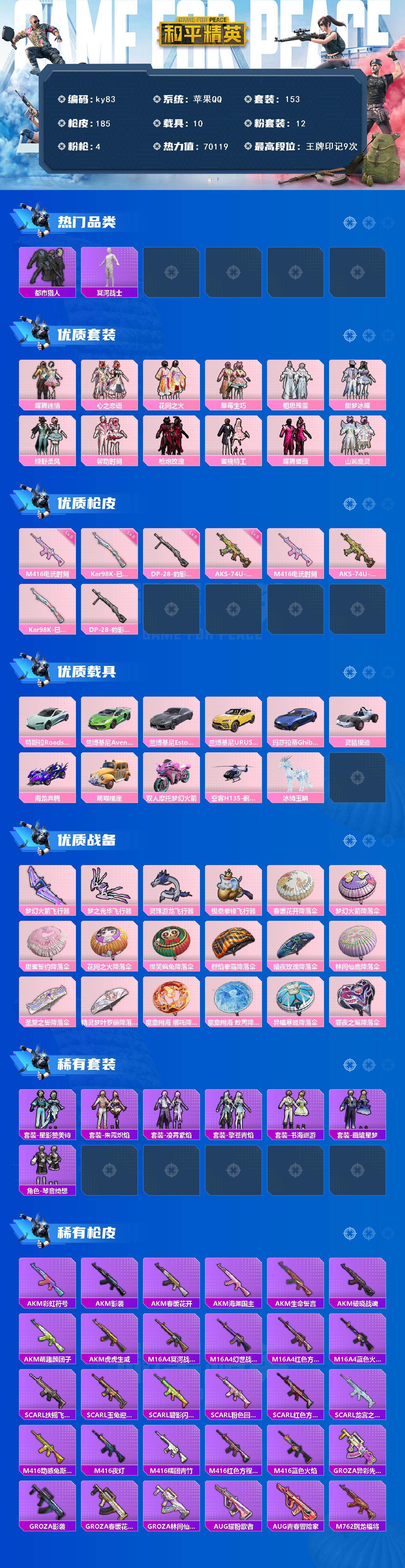 10载具-153套装-185呛皮-苹果 手q-12粉装-4特效呛-10载具-5粉色飞行器-70119热力值-9王牌印记-153套装-185呛皮 【热门品类】:套装-都市猎人,套装-冥河战士 【粉色套装】:粉装-蝶舞迷情,粉装-心之恋语,粉装-花间之火,粉装-草莓生巧,粉装-相思残雪,粉装-甜梦冰蝶,粉装-绿野柔风,粉装-馨动时刻,粉装-呛炮玫瑰,粉装-蜜桃特工,粉装-蝶舞蔷薇,粉装-山涧鹿灵 【粉色呛皮等级】:m416-电玩时