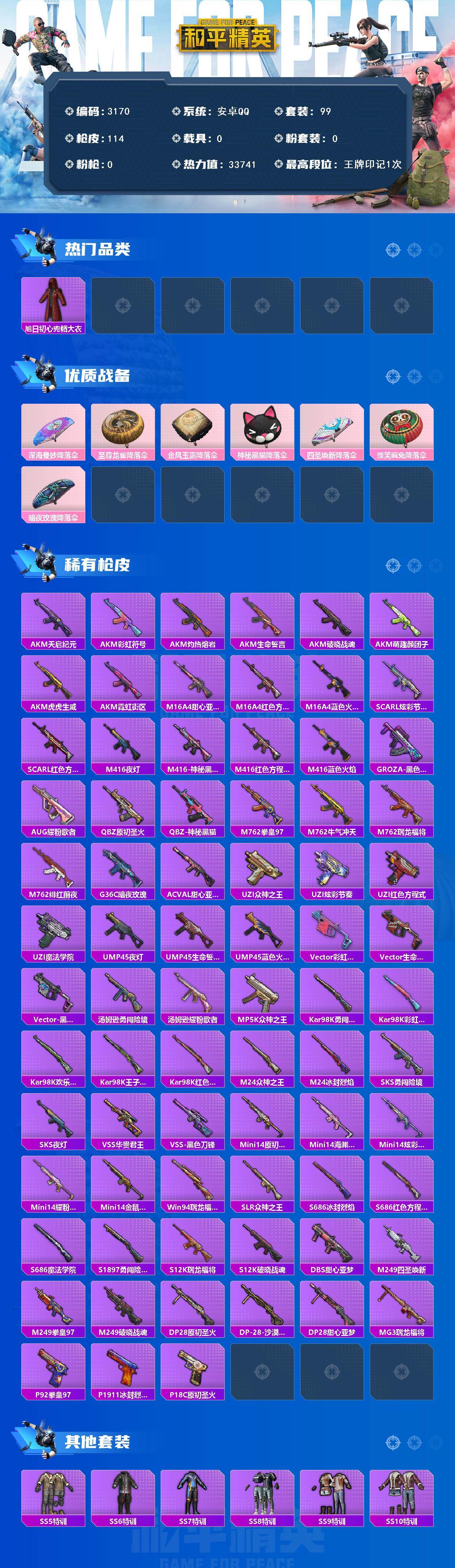 安卓 手q-0粉装-0特效呛-0载具-0粉色飞行器-33741热力值-1王牌印记-99套装-114呛皮 【热门品类】:旭日初心兜帽大衣 【粉色降落伞】:深海曼妙降落伞,至尊龙雀降落伞,金风玉露降落伞,神秘黑猫降落伞,四圣焕新降落伞,怪笑疯兔降落伞,暗夜玫瑰降落伞 【稀有呛皮】:akm-天启纪元,akm-彩虹符号,akm-灼热熔岩,akm-生命誓言,akm-破晓战魂,akm-萌趣颜团子,akm-虎虎生威,akm-霓虹街区,m16a4-甜心亚梦,m16a4-红色方程式,m16a4-蓝色火焰,scar-l-炫彩节奏,scar-l-红色方程式,m416-夜灯,m416-神秘黑猫,m416-红色方程式,m416-蓝色火焰,groza-黑色刀锋,aug-耀粉歌者,q-原初圣火,q-神秘黑猫,m762-拳皇97,m762-牛气冲天,m762-瑞龙福将,m762-绯红前夜,g36c-暗夜玫瑰,ac-val-甜心亚梦,uzi-众神之王,uzi-炫彩节奏,uzi-红色方程式,uzi-魔法学院,ump45-夜灯,ump45-生命誓言,ump45-蓝色火焰,vect-彩虹符号,vect-生命誓言,vect-黑色刀锋,汤姆逊-勇闯险境,汤姆逊-耀粉歌者,mp5k-众神之王,kar98k-勇闯险境,kar98k-彩虹符号,kar98k-欢乐麻酱,kar98k-王子的夏天,kar98k-红色方程式,m24-众神之王,m24-冰封烈焰,sks-勇闯险境,sks-夜灯,vss-华贵君王,vss-黑色刀锋,mini14-原初圣火,mini14-海渊国主,mini14-炫彩节奏,mini14-耀粉歌者,mini14-金鼠迎春,win94-瑞龙福将,slr-众神之王,s686-冰封烈焰,s686-红色方程式,s686-魔法学院,s1897-勇闯险境,s12k-瑞龙福将,s12k-破晓战魂,dbs-甜心亚梦,m249-四圣焕新,m249-拳皇97,m249-破晓战魂,dp-28-原初圣火,dp-28-沙漠守护者,dp-28-甜心亚梦,mg3-瑞龙福将,p92-拳皇97,p1911-冰封烈焰,p18c-原初圣火 【其他套装】:套装-ss5特训,套装-ss6特训,套装-ss7特训,套装-ss8特训,套装-ss9特训,套装-ss10特训,套装-ss11特训,套装-ss12特训,套装-ss13特训,套装-ss14特训,套装-ss15特训,套装-ss16特训,套装-ss17特训,套装-ss18特训,套装-ss20特训,套装-ss21特训,套装-ss22特训,套装-ss23特训,套装-丛林猎人,套装-传奇侦探,套装-冰川格斗者,套装-冷焰舞者,套装-北国孤狼,套装-千禧之恋,套装-夏日音浪,套装-幻世战舞者,套装-拳皇97草薙京,套装-探宝勇士,套装-极速红龙,套装-格斗专家,套装-格斗先锋,套装-海上生明月,套装-深蓝色名流,套装-湖蓝色名流,套装-灰色格斗者,套装-炽焰拳师,套装-热血青春,套装-热血骑手,套装-爆竹金鼠,套装-牛气冲天,套装-牛气满满,套装-特战装甲,套装-特种颜团子,套装-特训学院,套装-猎鹰,套装-甜蜜告白,套装-疯狂小兔子,套装-白色伏地魔,套装-破晓战魂,套装-福星高照,套装-空投萌叽,套装-突袭者,套装-竞技勇士朋克,套装-竞技名士,套装-绮丽涂鸦,套装-耀粉歌者,套装-萌趣颜团子,套装-蓝彩潮人,套装-蓝色运动,套装-虎虎生威吉莉,套装-跃动心情,套装-酒红色名流,套装-金鼠迎春,套装-长空猛禽,套装-霓虹街区,套装-青涩时光,套装-骑行爱好者,套装-魅力单车,套装-黄色伏地魔,套装-黄色名流,套装-黑色伏地魔,套装-沙漠毒蛇,套装-战地菁英,套装-极地朋克,套装-夜莺强袭者,套装-冰川特警,套装-坚韧舞者,套装-黑夜传说,套装-凛冬战士,套装-雪山精英,套装-雪山征服者,套装-冰原使者,套装-奇趣章鱼,套装-圣诞大吉,套装-核芯基因,套装-精神漫游,套装-黑色刀锋,套装-迷域探索者,套装-深蓝冒险家,套装-众神之王,套装-智慧之神,套装-大橘为重,套装-原初圣火,套装-逆风勇士,套装-白虎圣者,套装-双棍侠客,套装-瑞龙福将,套装-团圆交子,套装-虚音幻奏 【稀有头盔】:木曜青龙头盔3级,木曜青龙头盔1级,马卡龙头盔2级 【稀有背包】:金曜白虎背包3级,金曜白虎背包2级,幻影战神背包1级,金风玉露背包1级,神秘黑猫背包1级 【