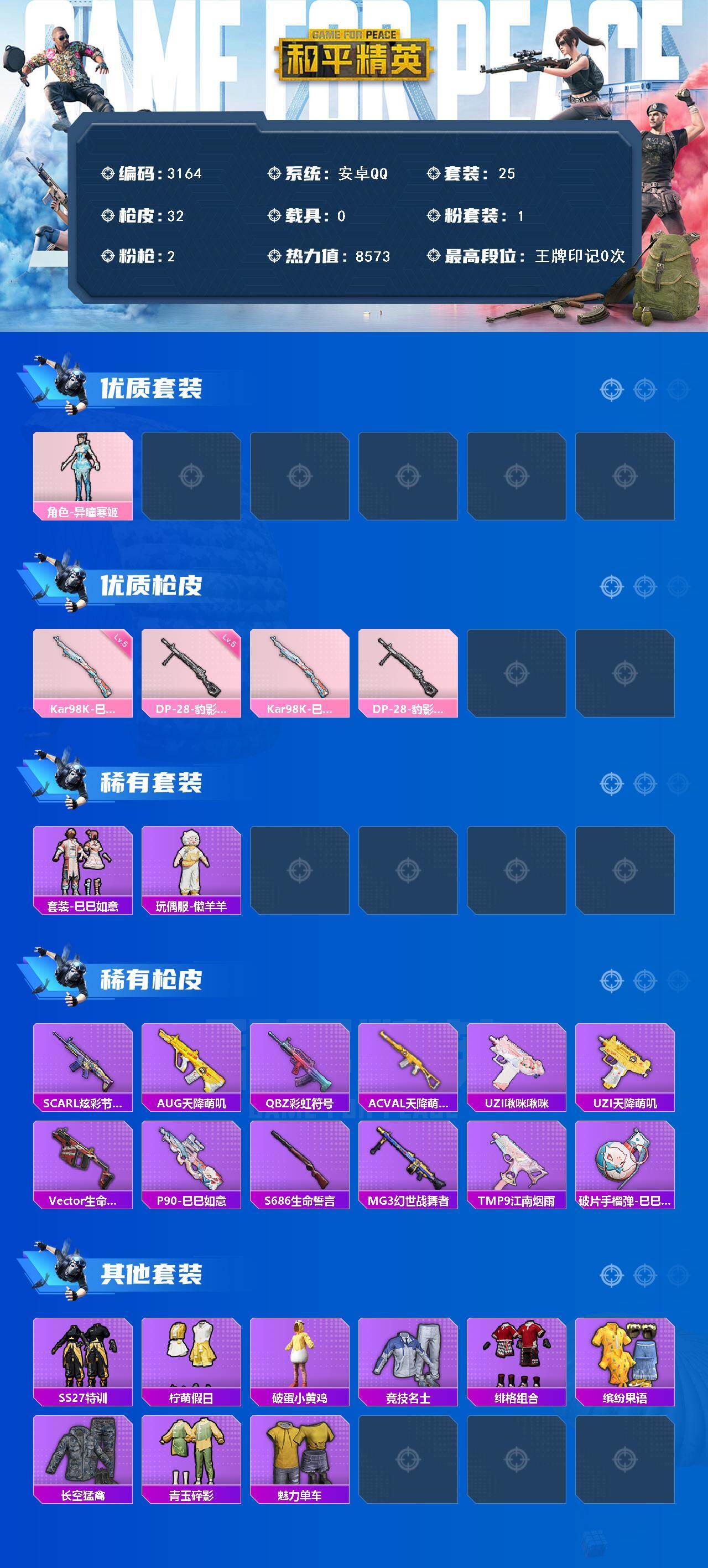 0载具-25套装-32呛皮-25套装/呛械2/装备33/战备20/热力值8573/五级kar98k-巳巳如意/五级dp-28-豹影疾电/角色-异瞳寒姬/kar98k-巳巳如意/dp-28-豹影疾电/炫彩糖果降落伞/巳巳如意/玩偶服-懒羊羊/scar-l-炫彩节奏/aug-天降萌叽/q-彩虹符号/ac-val-天降萌叽/uzi-啾咪啾咪/uzi-天降萌叽/vect-生命誓言/p90-巳巳如意/s686-生命誓言/m
