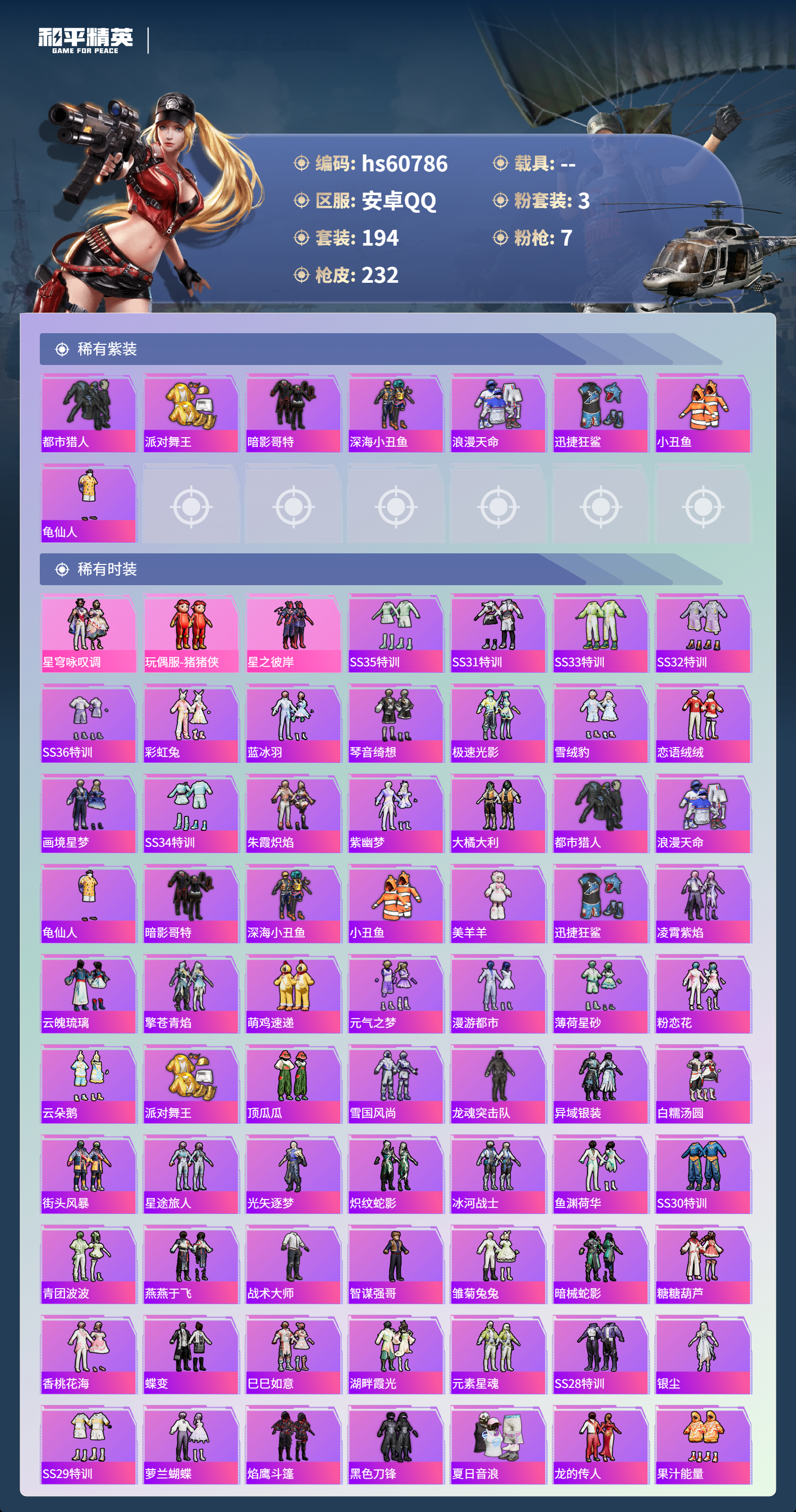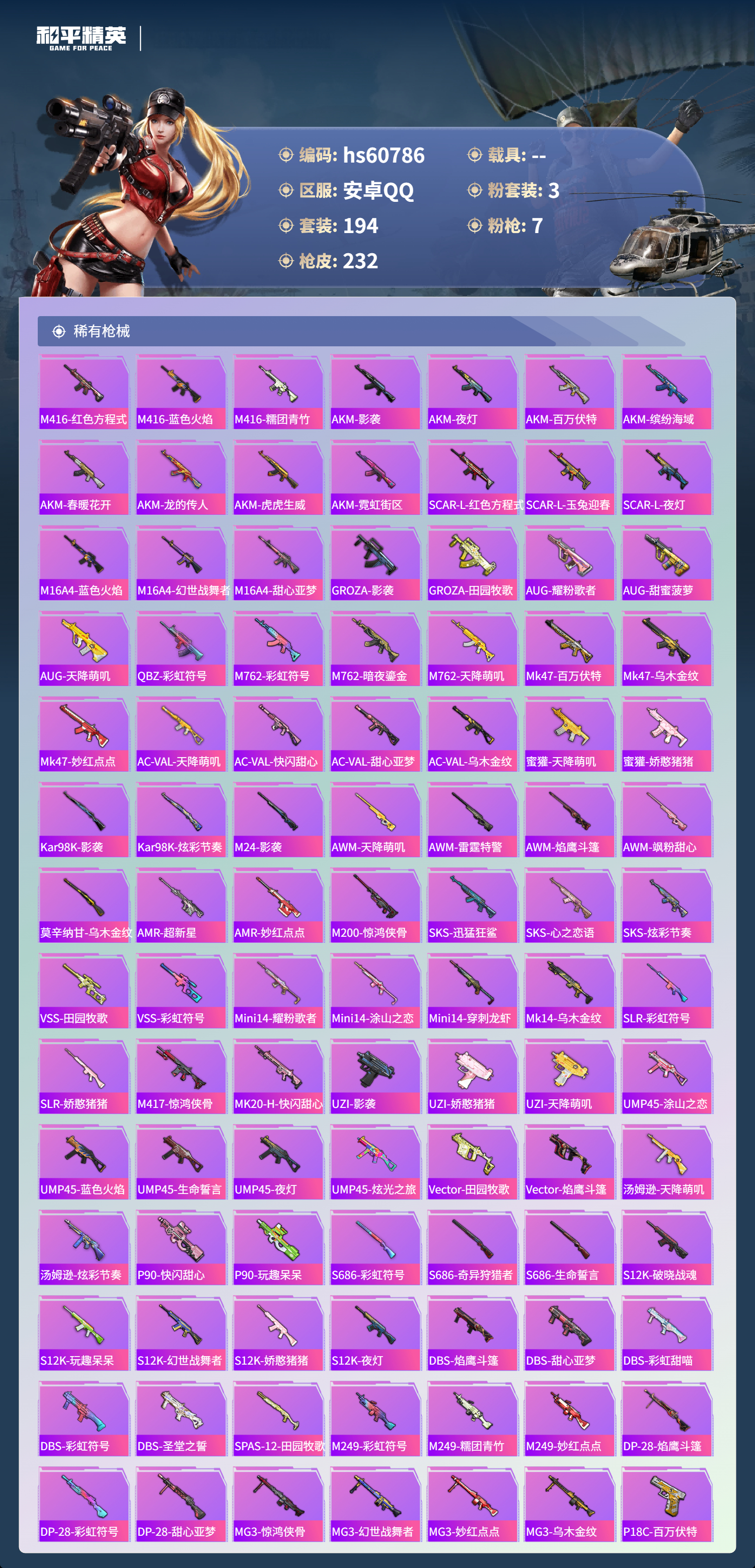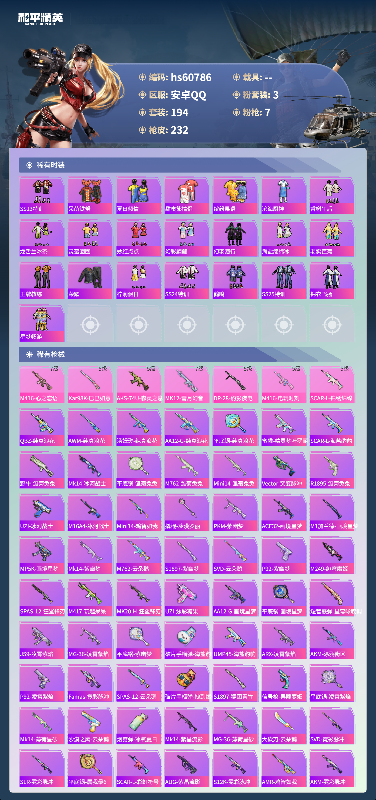 hs60786 安卓手q-17王牌印记-3粉装-7特效呛-69771热力值-194套装-232呛皮-4卓越印记-2传奇印记 【3粉装】套装-星穹咏叹调玩偶服-猪猪侠套装-星之彼岸 【7特效呛】scar-l-锦绣绵绵/5级dp-28-豹影疾电/5级m416-电玩时刻/5级aks-74u-森灵之息/5级mk12-雪月幻音/7级m416-心之恋语/7级kar98k-巳巳如意/5级 【8稀