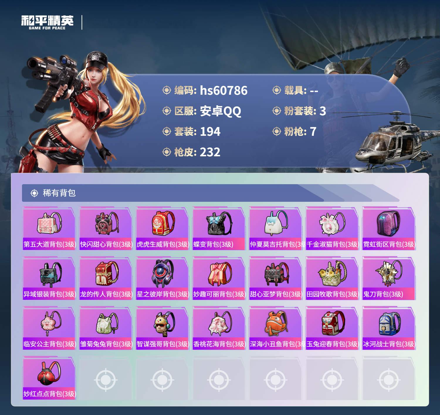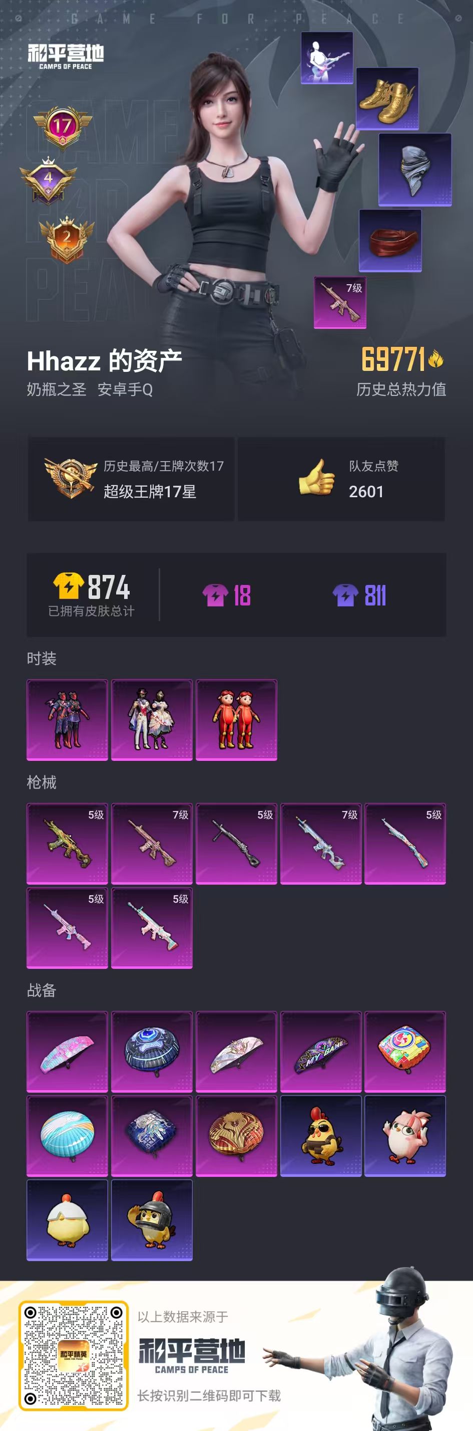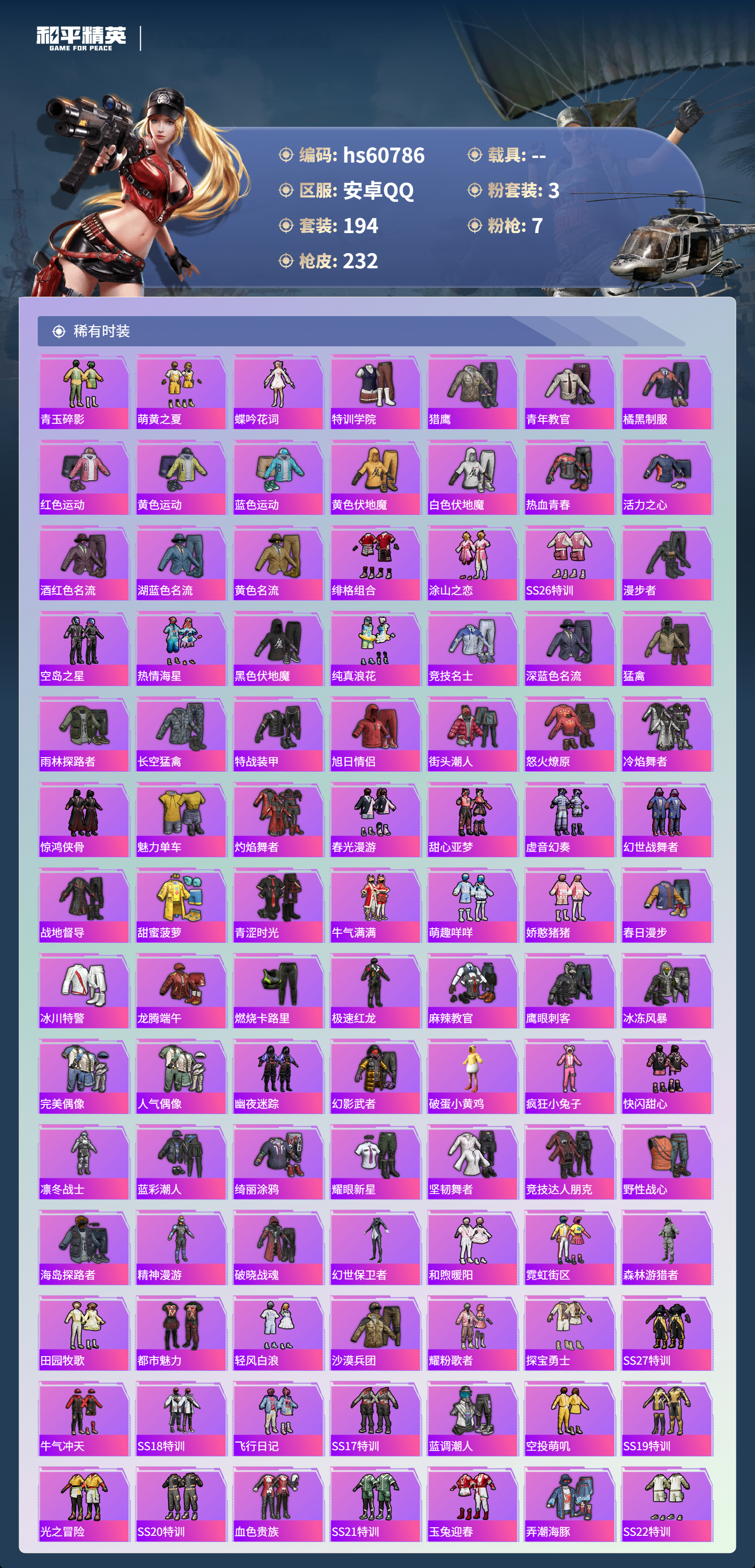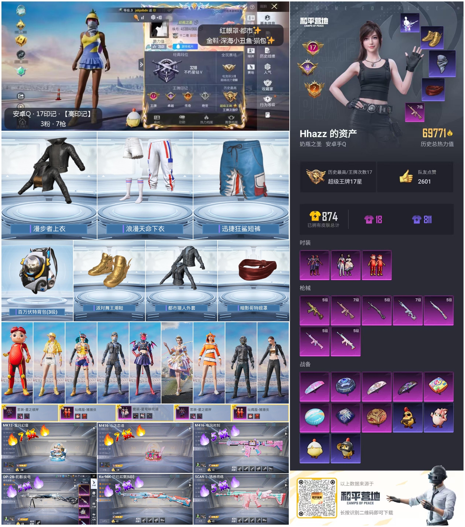 hs60786 安卓手q-17王牌印记-3粉装-7特效呛-69771热力值-194套装-232呛皮-4卓越印记-2传奇印记 【3粉装】套装-星穹咏叹调玩偶服-猪猪侠套装-星之彼岸 【7特效呛】scar-l-锦绣绵绵/5级dp-28-豹影疾电/5级m416-电玩时刻/5级aks-74u-森灵之息/5级mk12-雪月幻音/7级m416-心之恋语/7级kar98k-巳巳如意/5级 【8稀