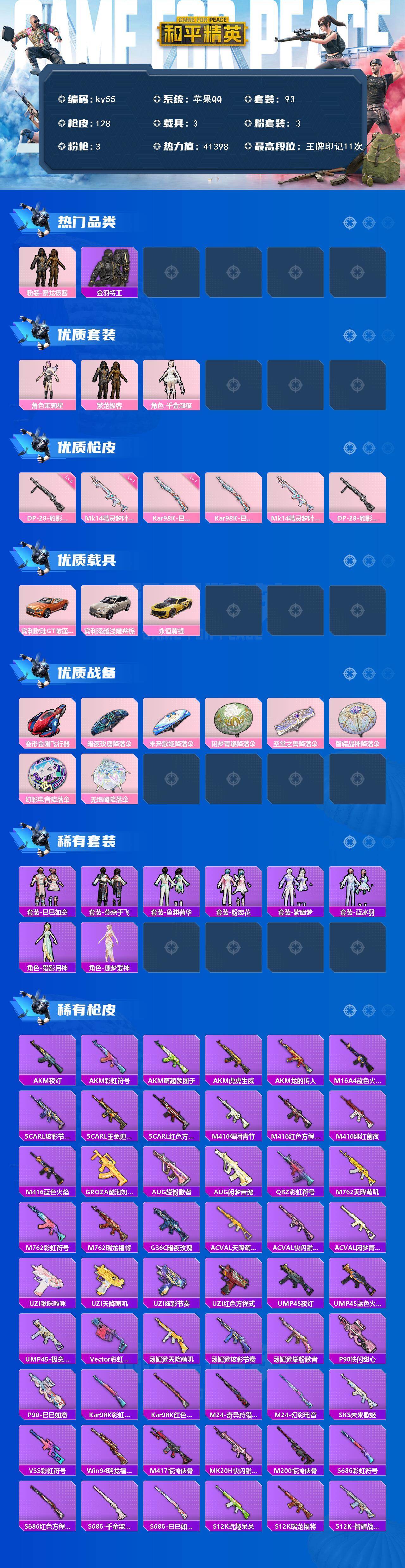 3载具-93套装-128呛皮-苹果 手q-3粉装-3特效呛-3载具-1粉色飞行器-41398热力值-11王牌印记-93套装-128呛皮 【热门品类】:粉装-繁龙极客,套装-金羽特工 【粉色套装】:角色-茉莉星,粉装-繁龙极客,角色-千金淑猫 【粉色呛皮等级】:kar98k-巳巳如意一级,mk14-精灵梦叶罗丽一级,dp-28-豹影疾电五级 【粉色载具】:宾利欧陆gt敞篷(火焰橘),宾利添越(浅瞪羚棕),永恒黄蜂