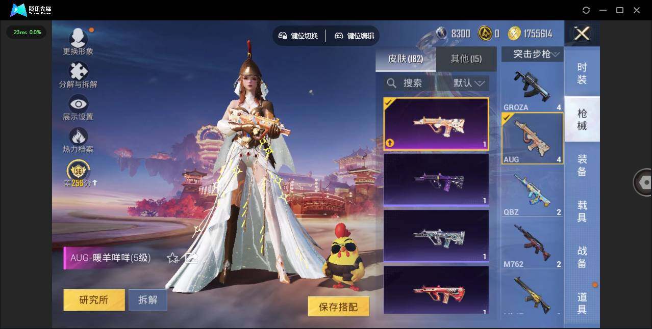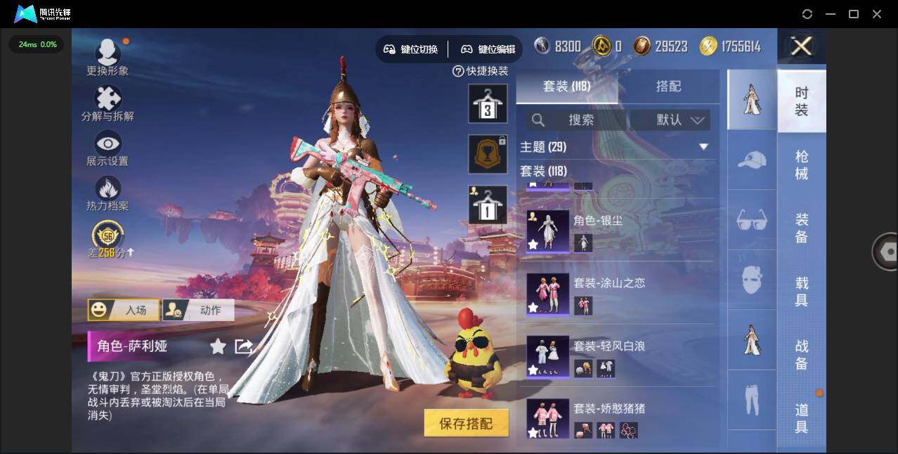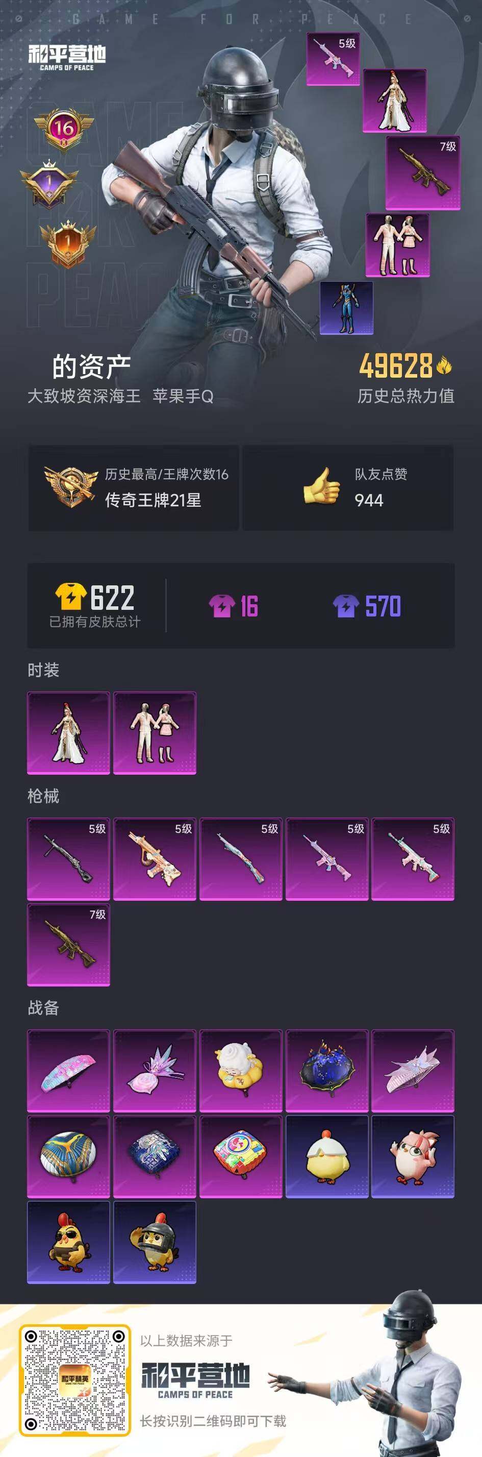 0载具-439套装-182呛皮-时装数: 439 呛械数: 182 战备数: 118 热门装扮: 奇异狩猎者迅捷狂鲨鹰眼刺客第五大道萨利娅 稀有呛皮: scar-l-锦绣绵绵五级,m416-五爪金龙七级,m416-电玩时刻五级,aug-暖羊咩咩五级,kar98k-巳巳如意五级,dp-28-豹影疾电五级
