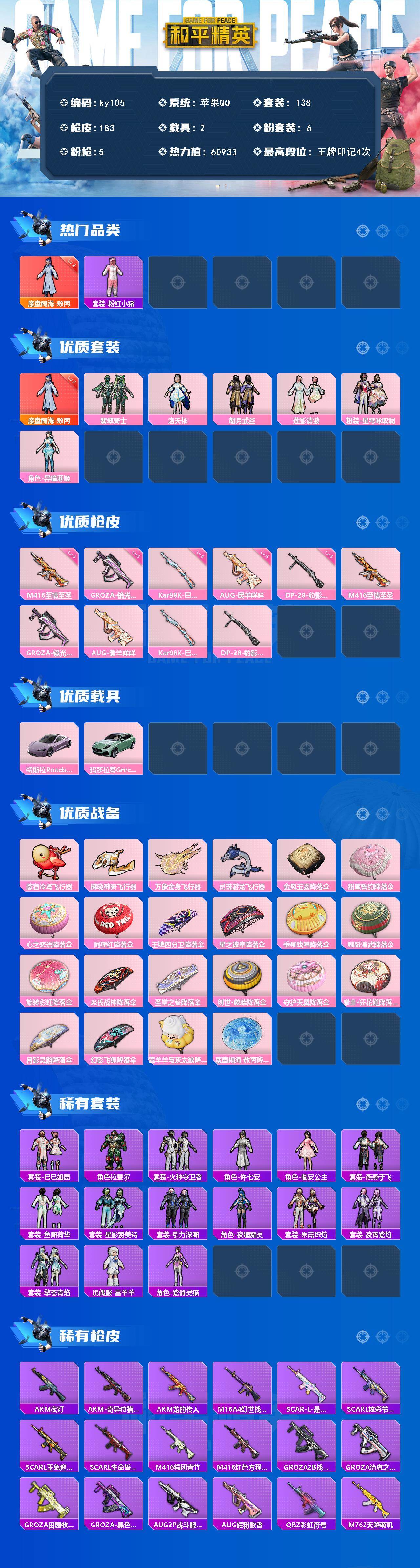 2载具-138套装-183呛皮-苹果 手q-1神装-6粉装-5特效呛-2载具-4粉色飞行器-60933热力值-4王牌印记-138套装-183呛皮 【红色神装等级】:魔童闹海-敖丙二级 【红色角色神装】:魔童闹海-敖丙 【热门品类】:套装-粉红小猪 【粉色套装】:粉装-翡翠骑士,角色-洛天依,粉装-朗月武圣,粉装-莲影清波,粉装-星穹咏叹调,角色-异瞳寒姬 【粉色呛皮等级】:m416-至情至圣九级,groza-镜光银凌