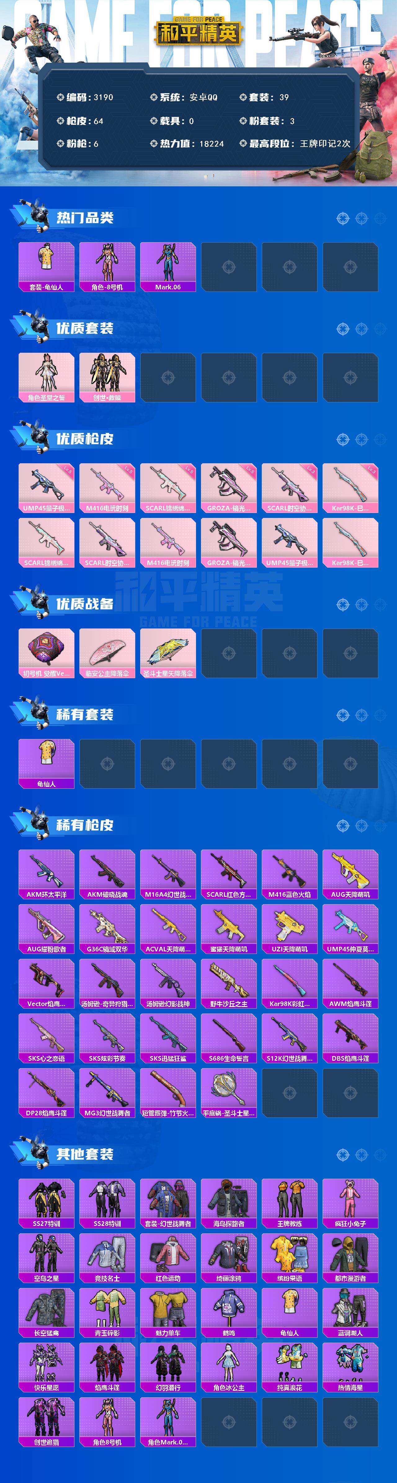 安卓 手q-3粉装-6特效呛-0载具-0粉色飞行器-18224热力值-2王牌印记-39套装-64呛皮 【热门品类】:套装-龟仙人,角色-8号机,角色-mark.06 【粉色套装】:角色-圣堂之誓,套装-创世·救赎 【粉色呛皮等级】:scar-l-锦绣绵绵五级,scar-l-时空协奏三级,m416-电玩时刻五级,groza-镜光银凌五级,ump45-量子极限五级,kar98k-巳巳如意三级 【粉色呛皮】:scar-l-锦绣绵绵,scar-l-时空协奏,m416-电玩时刻,groza-镜光银凌,ump45-量子极限,kar98k-巳巳如意 【粉色降落伞】:初号机 觉醒ver.降落伞,临安公主降落伞,圣斗士星矢降落伞 【稀有套装】:套装-龟仙人 【稀有呛皮】:akm-环太平洋,akm-破晓战魂,m16a4-幻世战舞者,scar-l-红色方程式,m416-蓝色火焰,aug-天降萌叽,aug-耀粉歌者,g36c-镜域双华,ac-val-天降萌叽,蜜獾-天降萌叽,uzi-天降萌叽,ump45-仲夏莫吉托,vect-焰鹰斗篷,汤姆逊-奇异狩猎者,汤姆逊-幻影战神,野牛-沙丘之主,kar98k-彩虹符号,awm-焰鹰斗篷,sks-心之恋语,sks-炫彩节奏,sks-迅猛狂鲨,s686-生命誓言,s12k-幻世战舞者,dbs-焰鹰斗篷,dp-28-焰鹰斗篷,mg3-幻世战舞者,短管霰弹-竹节火铳,平底锅-圣斗士星矢 【其他套装】:套装-ss27特训,套装-ss28特训,套装-幻世战舞者,套装-海岛探路者,套装-王牌教练,套装-疯狂小兔子,套装-空岛之星,套装-竞技名士,套装-红色运动,套装-绮丽涂鸦,套装-缤纷果语,套装-都市漫游者,套装-长空猛禽,套装-青玉碎影,套装-魅力单车,套装-鹤鸣,套装-龟仙人,套装-蓝调潮人,套装-快乐星愿,套装-焰鹰斗篷,套装-幻羽潜行,角色-冰公主,套装-纯真浪花,套装-热情海星,套装-创世·追猎,角色-8号机,角色-mark.06 【