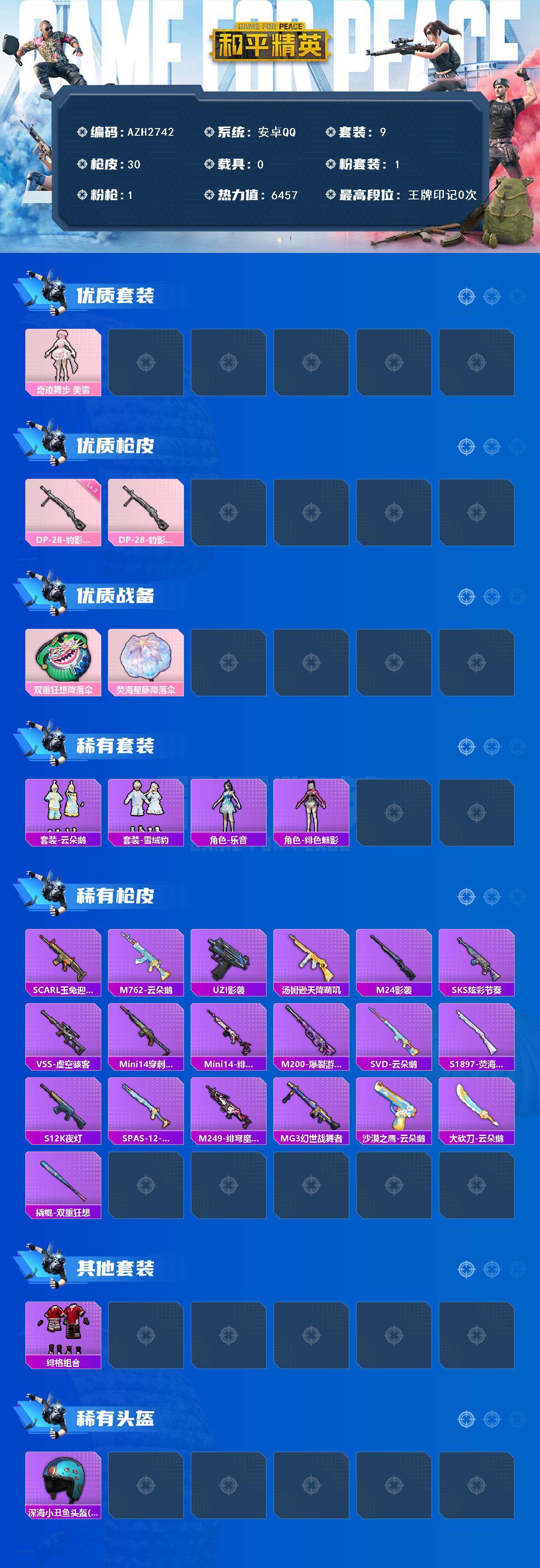安卓 手q【奇迹舞步 美雪】1粉装-1特效呛-0载具-1粉色飞行器-6457热力值-0王牌印记-9套装-30呛皮 【粉色套装】:角色-奇迹舞步 美雪 【粉色呛皮等级】:dp-28-豹影疾电三级 【粉色呛皮】:dp-28-豹影疾电 【粉色降落伞】:双重狂想降落伞,荧海星豚降落伞 【稀有套装】:套装-云朵鹅,套装-雪绒豹,角色-乐音,角色-绯色魅影 【稀有呛皮】:scar-l-玉兔迎春,m76