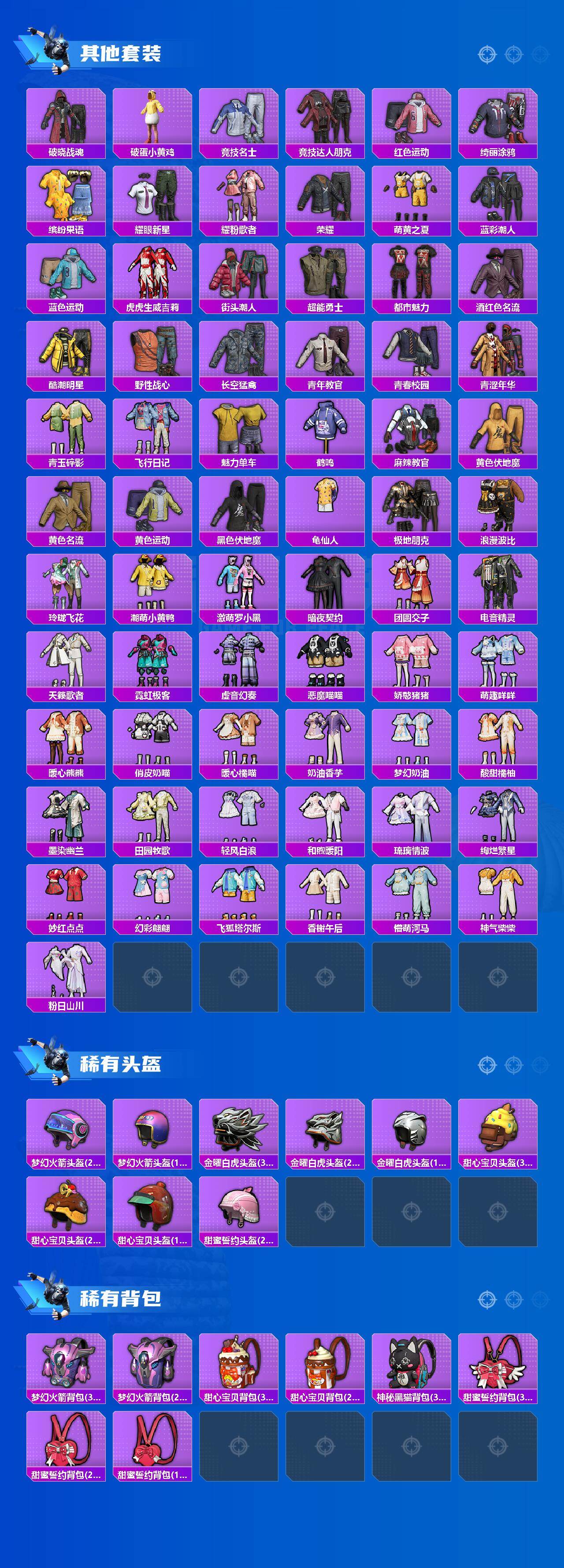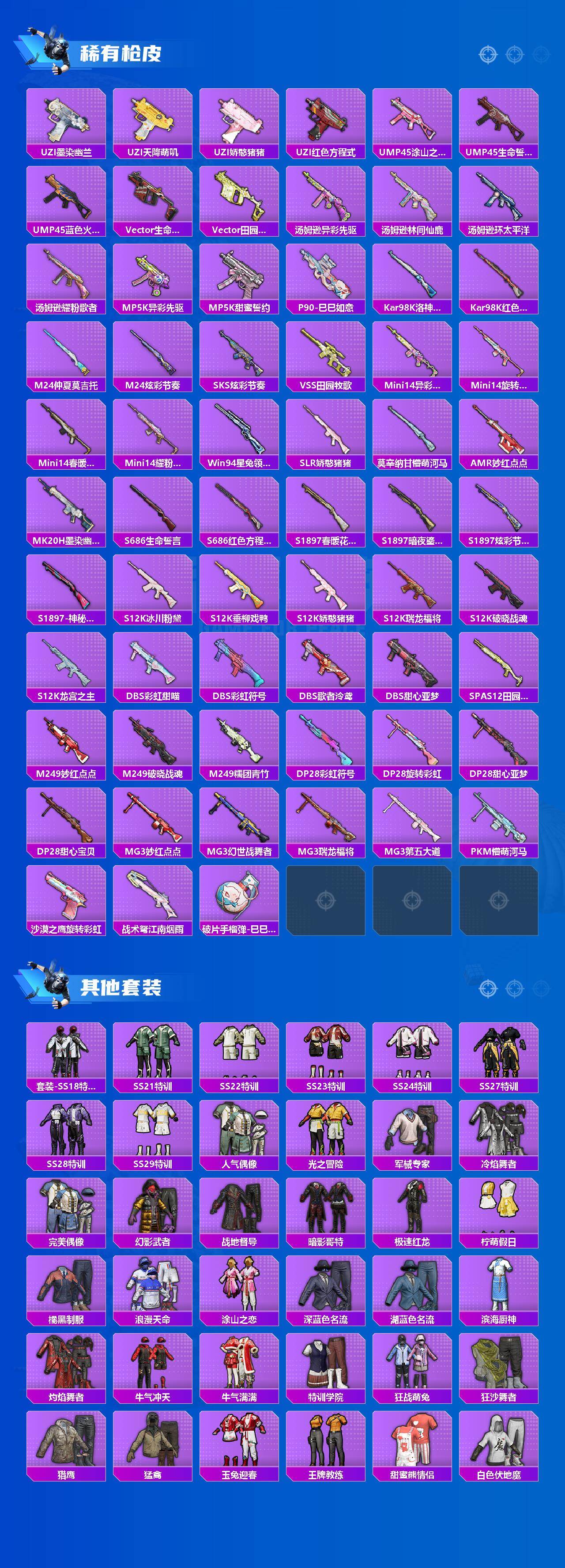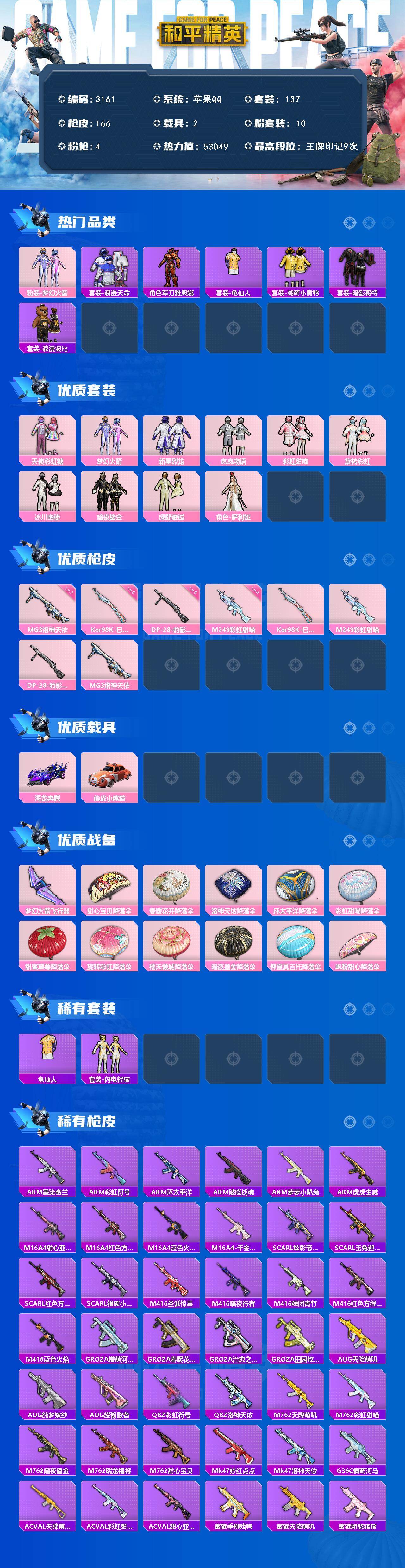 2载具-137套装-166呛皮-137套装/呛械4/装备185/载具2/战备123/王牌印记9/热力值53049/五级kar98k-巳巳如意/四级m249-彩虹甜喵/五级dp-28-豹影疾电/七级mg3-洛神天依/粉装-梦幻火箭/套装-浪漫天命/军刀雅典娜/套装-龟仙人/套装-潮萌小黄鸭/套装-暗影哥特/套装-浪漫波比/天使彩虹糖/梦幻火箭/新星烈龙/岚岚物语/彩虹甜喵/旋转彩虹/冰川幽秘/暗夜鎏金/绿野邂逅/萨利娅/海龙奔
