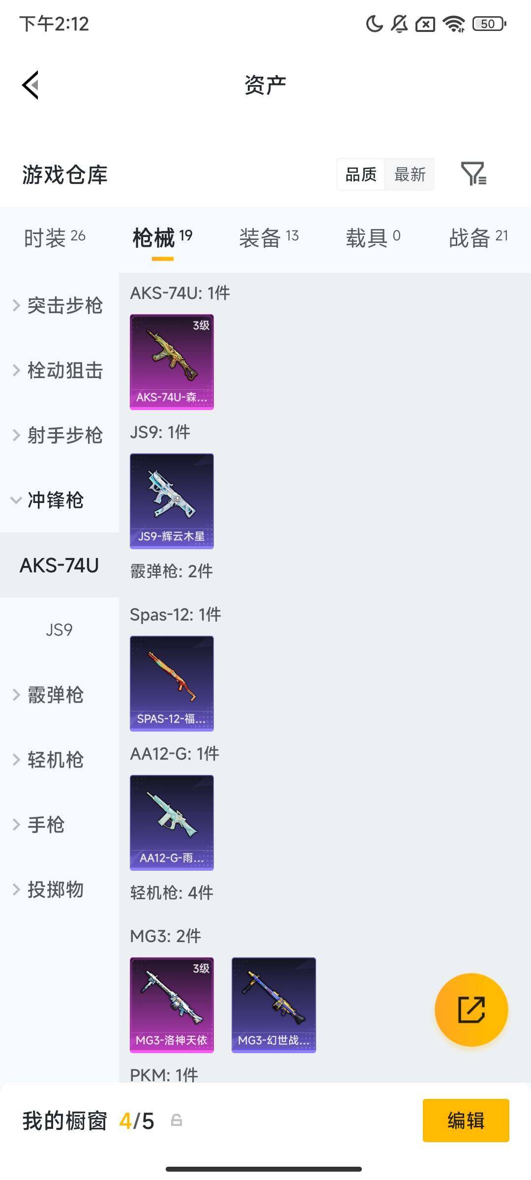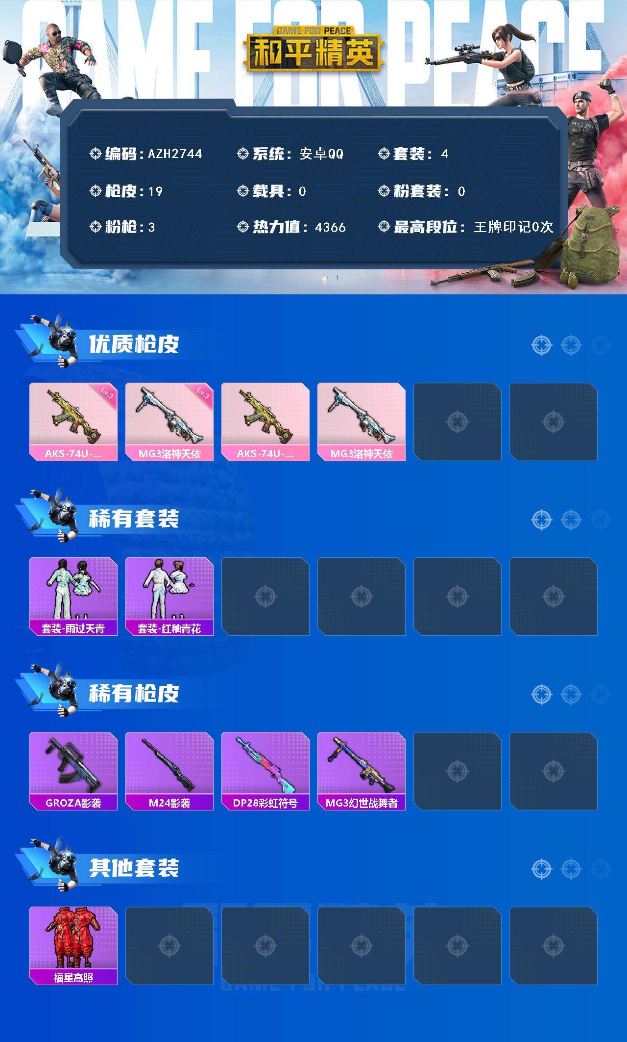 安卓 手q【洛神天依mg3】0粉装-3特效呛-0载具-0粉色飞行器-4366热力值-0王牌印记-4套装-19呛皮 【粉色呛皮等级】:aks-74u-森灵之息三级,mg3-洛神天依三级 【粉色呛皮】:aks-74u-森灵之息,mg3-洛神天依 【稀有套装】:套装-雨过天青,套装-红釉青花 【稀有呛皮】:groza-影袭,m24-影袭,dp-28-彩虹符号,mg3-幻世战舞者 【其他套装】