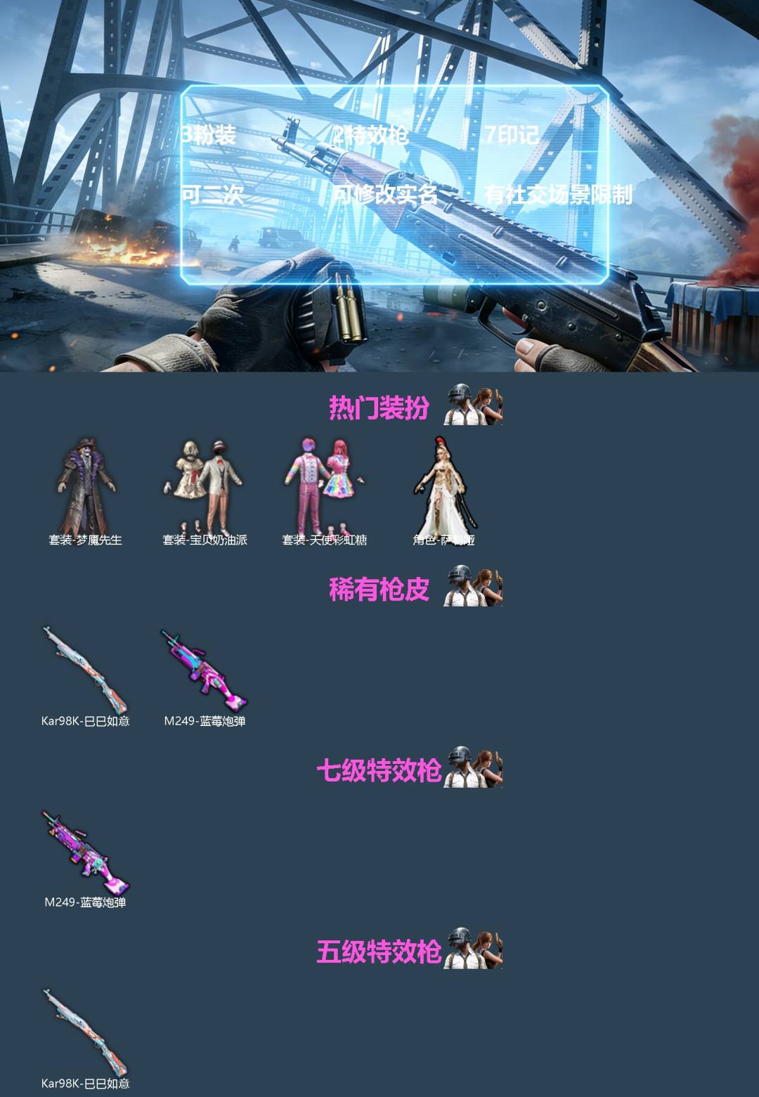 3粉装 2特效呛 7印记 可二次 可修改实名 有社交场景限制 【热门装扮】萨利娅天使彩虹糖宝贝奶油派梦魇先生 【稀有呛皮】kar98k-巳巳如意m249蓝莓炮弹 【七级特效呛】七级m249-蓝莓炮弹 【五级特效呛】五级kar98k-巳巳如意 【紫色装扮】游乐冷焰舞者冰川特警人气偶像s