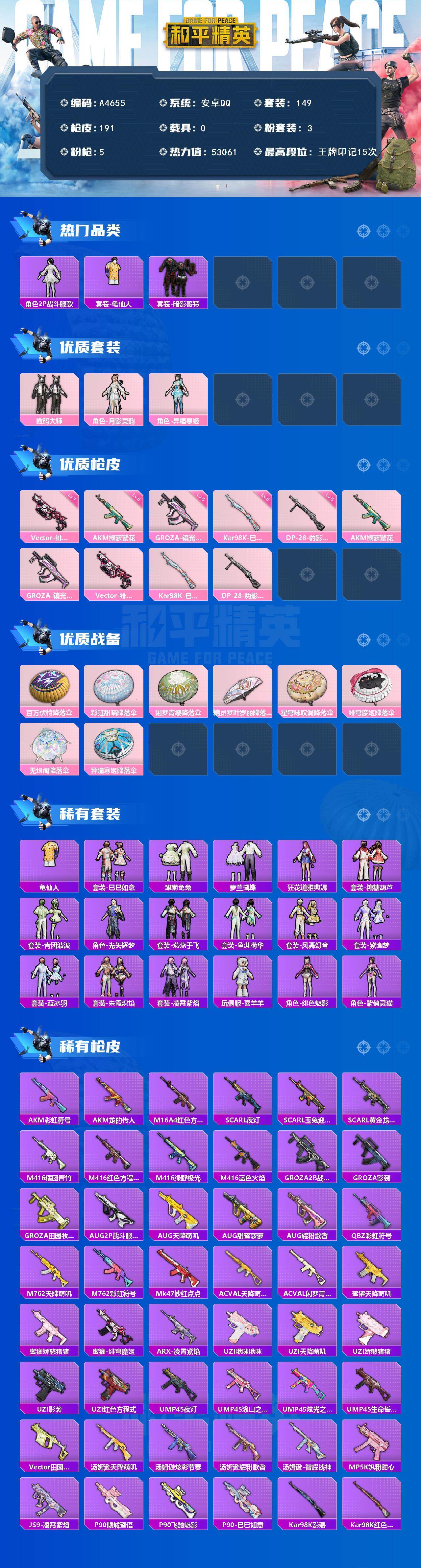 [16714608]安卓 【小号 2p战斗服 暗影哥特】手q-3粉装-5特效呛-0载具-1粉色飞行器-53061热力值-15王牌印记-149套装-191呛皮 【热门品类】:角色-2p战斗服款,套装-龟仙人,套装-暗影哥特 【粉色套装】:粉装-数码大师,角色-月影灵韵,角色-异瞳寒姬 【粉色呛皮等级】:akm-绿萝繁花五级,groza-镜光银凌五级,vect-绯穹魔姬七级,kar98k-巳巳如意五级,dp-28-豹影疾电五级 【粉色呛皮】:akm-绿萝繁花,groza-镜光银凌,vect-绯穹魔姬,kar98k-巳巳如意,dp-28-豹影疾电 【粉色降落伞】:百万伏特降落伞,彩虹甜喵降落伞,闲梦青缨降落伞,精灵梦叶罗丽降落伞,星穹咏叹调降落伞,绯穹魔姬降落伞,无垠阁降落伞,异瞳寒姬降落伞,炫彩糖果降落伞 【稀有套装】:套装-龟仙人,套装-巳巳如意,套装-炫彩糖果,套装-雏菊兔兔,套装-萝兰蝴蝶,角色-狂花道·雅典娜,套装-糖糖葫芦,套装-青团波波,角色-光矢逐梦,套装-燕燕于飞,套装-鱼渊荷华,套装-风舞幻音,套装-紫幽梦,套装-蓝冰羽,套装-朱霞炽焰,套装-凌霄紫焰,玩偶服-喜羊羊,角色-绯色魅影,角色-紫俏灵猫 【稀有呛皮】:aug-冰晶雪宝,akm-彩虹符号,akm-龙的传人,m16a4-红色方程式,scar-l-夜灯,scar-l-玉兔迎春,scar-l-黄金龙骨,m416-糯团青竹,m416-红色方程式,m416-绿野极光,m416-蓝色火焰,groza-2b战斗服款,groza-影袭,groza-田园牧歌,aug-2p战斗服款,aug-天降萌叽,aug-甜蜜菠萝,aug-耀粉歌者,q-彩虹符号,m762-天降萌叽,m762-彩虹符号,mk47-妙红点点,ac-val-天降萌叽,ac-val-闲梦青缨,蜜獾-天降萌叽,蜜獾-娇憨猪猪,蜜獾-绯穹魔姬,arx-凌霄紫焰,uzi-啾咪啾咪,uzi-天降萌叽,uzi-娇憨猪猪,uzi-影袭,uzi-红色方程式,ump45-夜灯,ump45-涂山之恋,ump45-炫光之旅,ump45-生命誓言,vect-田园牧歌,汤姆逊-天降萌叽,汤姆逊-炫彩节奏,汤姆逊-耀粉歌者,汤姆逊-智耀战神,mp5k-飒粉甜心,js9-凌霄紫焰,p90-倾城蜜语,p90-飞驰魅影,p90-巳巳如意,kar98k-影袭,ka