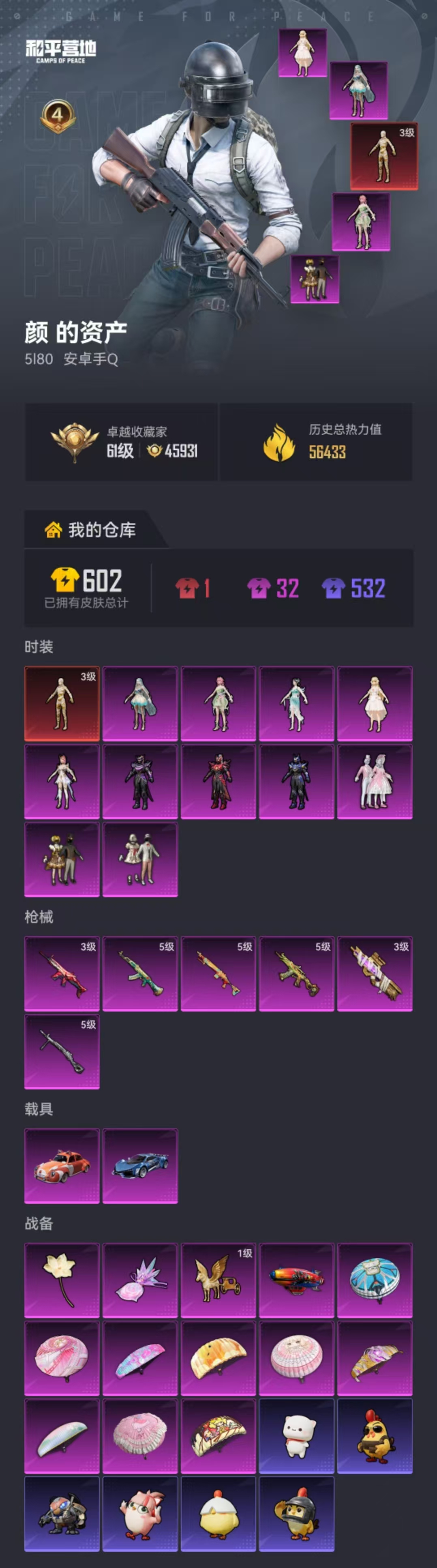 【图卡盟3级10粉装6特效呛2载具】 安卓q区-56469热力值-4印记-109套装-176呛皮 【1红装】 沙丘之主-图卡盟3级【3载具】 僚机-擎天重拳 幻影随行 俏皮小熊猫【10粉装】 宙之时溯 圣堂之誓 小叽联名款 星云暗核 万古烈焰 甜心巧克力 角色-花灵 角色-灵玺 甜蜜誓约 宝贝奶油派【5特效呛】 akm-绿萝繁花5级 p90-沙丘之主3级 aks-74u-森灵之息5级 dp-28-豹影疾电5级 scar-l-万古烈焰3级【8热门】 暗夜契约 纯白誓言 mg3-乌木金纹 m249-妙红点点 mini14-炫彩节奏 kar98k-彩虹符号 m416-糯团青竹 akm-彩虹符号【3飞行器】 炫彩糖果飞行器 沙丘之主天马 曦光华影飞行器【2背包】 甜心宝贝背包 甜蜜誓约背包 营地id:750474030