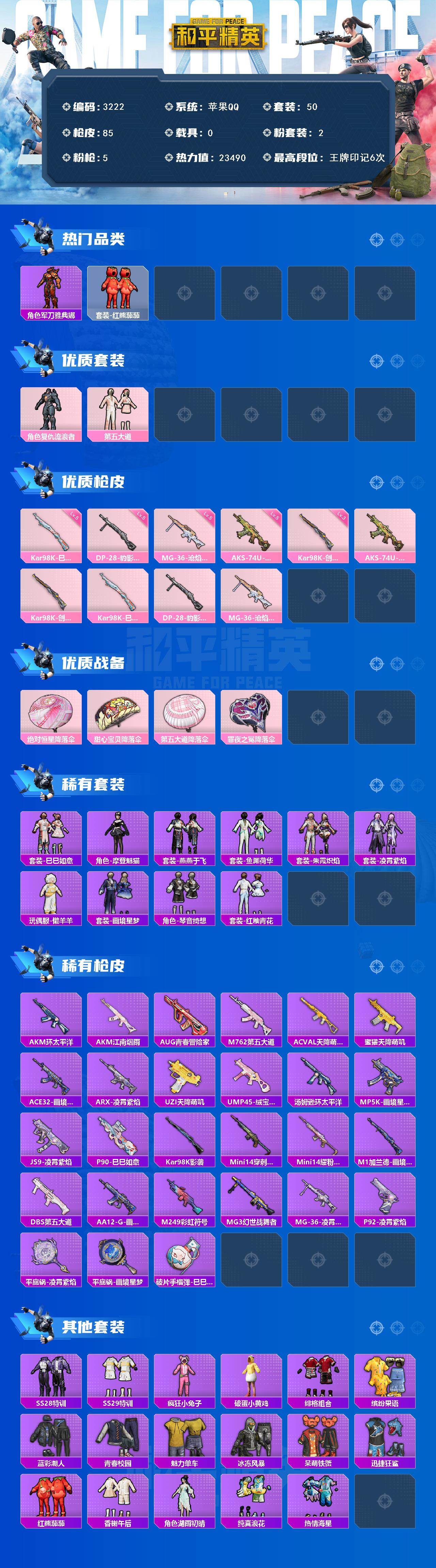 苹果 手q-2粉装-5特效呛-0载具-1粉色飞行器-23490热力值-6王牌印记-50套装-85呛皮 【热门品类】:角色-军刀雅典娜,套装-红熊茄茄 【粉色套装】:角色-复仇流浪者,粉装-第五大道 【粉色呛皮等级】:aks-74u-森灵之息五级,kar98k-创世·救赎三级,kar98k-巳巳如意五级,dp-28-豹影疾电五级,mg-36-沧焰双生五级 【粉色呛皮】:aks-74u-森灵之息,kar98k-创世·救赎,kar98k-巳巳如意,dp-28-豹影疾电,mg-36-沧焰双生 【粉色降落伞】:绝对恒星降落伞,甜心宝贝降落伞,第五大道降落伞,炫彩糖果降落伞,罪夜之冕降落伞 【稀有套装】:套装-巳巳如意,套装-雪国风尚,套装-炫彩糖果,角色-摩登魅猫,套装-燕燕于飞,套装-鱼渊荷华,套装-朱霞炽焰,套装-凌霄紫焰,玩偶服-懒羊羊,套装-画境星梦,套装-琴音绮想,套装-红釉青花 【稀有呛皮】:akm-江南烟雨,akm-环太平洋,aug-青春冒险家,m762-第五大道,ac-val-天降萌叽,蜜獾-天降萌叽,ace32-画境星梦,arx-凌霄紫焰,uzi-天降萌叽,ump45-绒宝小鹅,汤姆逊-环太平洋,mp5k-画境星梦,js9-凌霄紫焰,p90-巳巳如意,kar98k-影袭,mini14-穿刺龙虾,mini14-耀粉歌者,m1加兰德-画境星梦,dbs-第五大道,aa12-g-画境星梦,m249-彩虹符号,mg3-幻世战舞者,mg-36-凌霄紫焰,p92-凌霄紫焰,平底锅-凌霄紫焰,平底锅-画境星梦,破片手留单-巳巳如意 【其他套装】:套装-ss28特训,套装-ss29特训,套装-疯狂小兔子,套装-破蛋小黄鸡,套装-绯格组合,套装-缤纷果语,套装-蓝彩潮人,套装-青春校园,套装-魅力单车,套装-冰冻风暴,套装-呆萌铁蟹,套装-迅捷狂鲨,套装-红熊茄茄,套装-香榭午后,角色-湖雨初晴,套装-纯真浪花,套装-热情海星 【