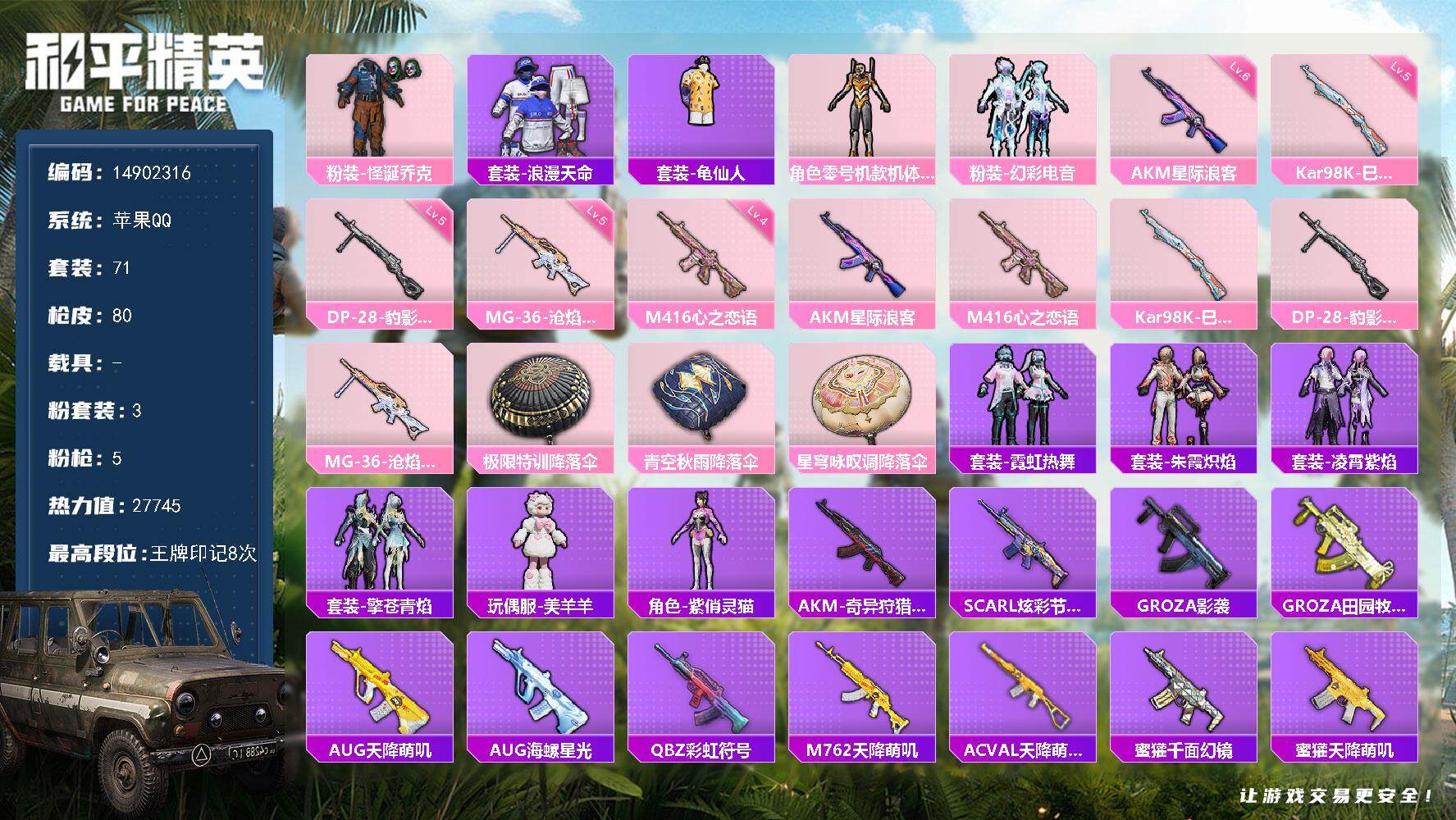 [16722274]"dfz385 有二次苹果q-1稀有3粉装5特效呛8热门71套装80呛皮 27745热力值 8印记 历史超级王牌27星 怪诞乔克 【1稀有】 浪漫天命 【3粉装】 黄螳螂 怪诞乔克 幻彩电音 【5特效呛】 m416-心之恋语 4级 kar98k-巳巳如意 5级 mg-36-沧焰双生 5级 dp-28-豹影疾电 5级 akm-星际浪客 6级 【8热门】 龟仙人 东方飞龙 鹰眼刺客 tianba战队服 破蛋小黄鸡 akm-奇异狩猎者 m24-奇异狩猎者 s686-奇异狩猎者"