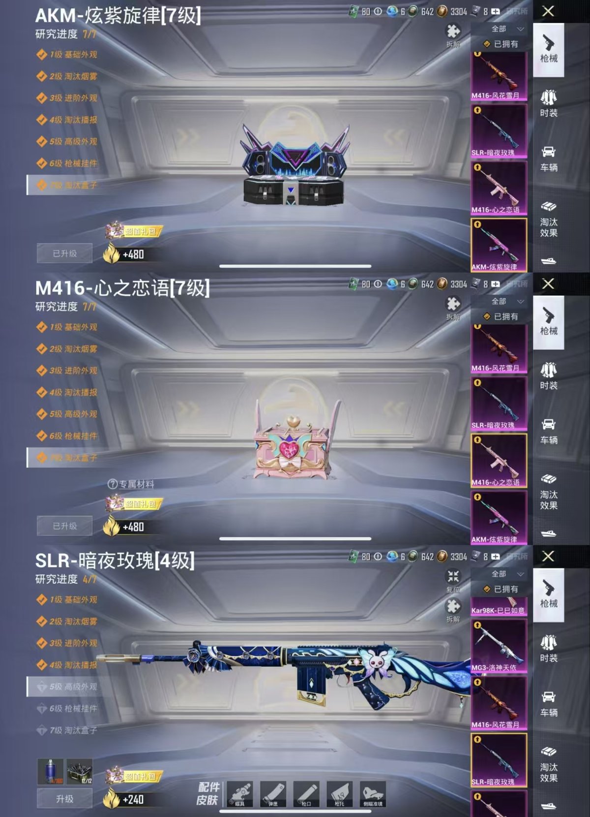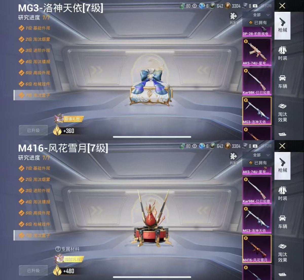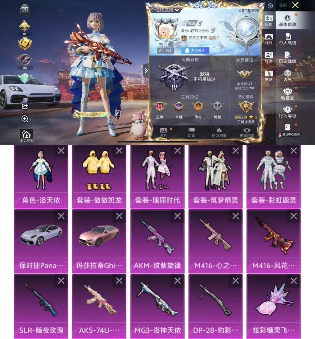 2449498-实名: 可修改 时装数: 716 载具数: 2 呛械数: 281 战备数: 197 热门装扮: 奇异狩猎者万圣娃娃迅捷狂鲨爱崽白熊彩虹鹿灵洛天依筑梦精灵暗夜鎏金瑰丽时代暗夜魅影闲梦青缨傲傲奶龙萨利娅 载具: 玛莎拉蒂ghibli粉保时捷panamera星辰紫 稀有呛皮: mg3洛神天依akm炫紫旋律m416心之恋语slr暗夜玫瑰m41