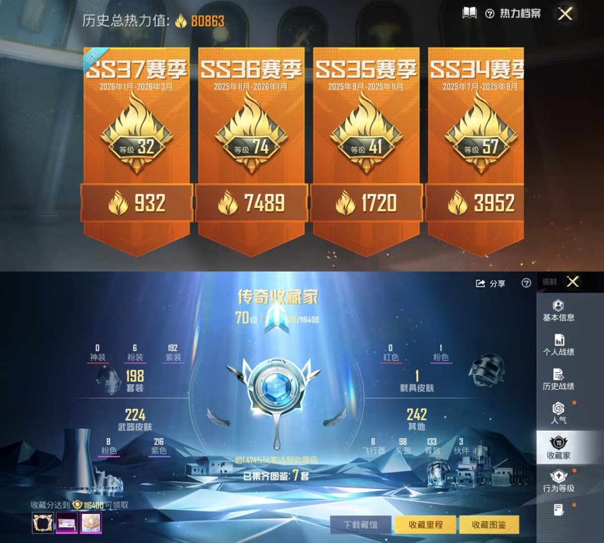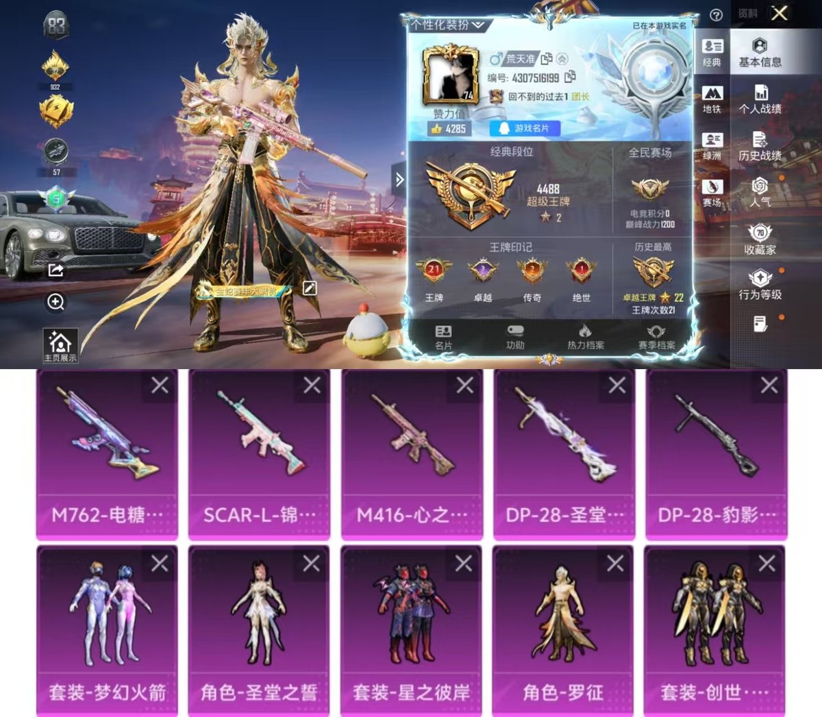 1载具-198套装-255呛皮-实名: 可修改 时装数: 791 载具数: 1 呛械数: 255 战备数: 175 热门装扮: 梦幻火箭新101梦魇先生鹰眼刺客星之彼岸暗夜魅影圣堂之誓创世·救赎罗征荧海星豚 载具: 宾利飞驰布罗德盖棕双色 稀有呛皮: m416心之恋语akm绿萝繁花dp-28圣堂之誓scar-l-锦绣绵绵m762-电糖天使kar98k-巳巳如意dp-28-豹影疾电aks-74