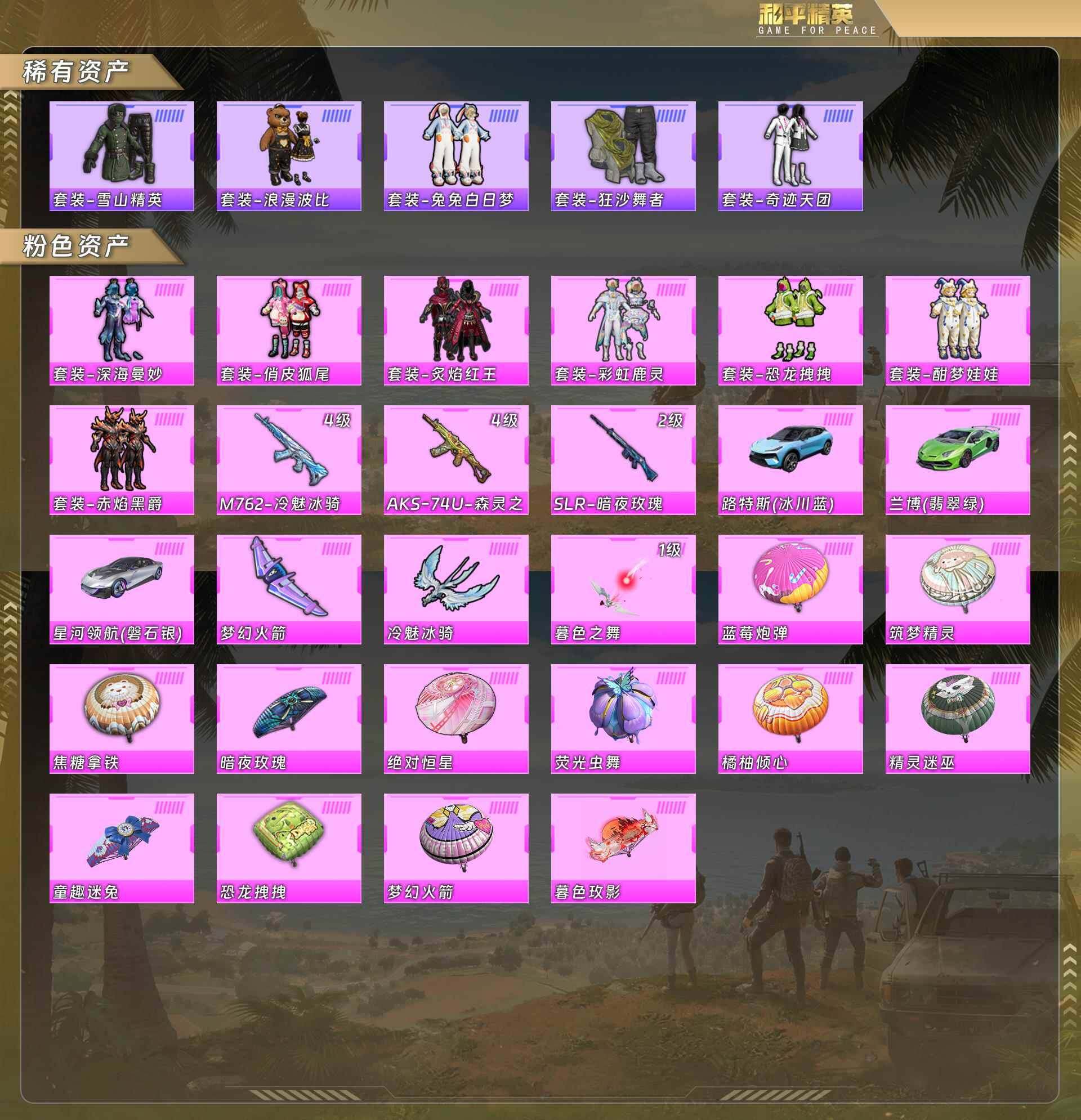 3载具-90套装-96呛皮-(7粉装-3粉呛-3载具)浪漫波比/兔兔白日梦/狂沙舞者/奇迹天团/深海曼妙/俏皮狐尾/炙焰红王/彩虹鹿灵/恐龙拽拽/酣梦娃娃/赤焰黑爵/m7冷魅冰骑4级/aks74u森灵之息4级/slr暗夜玫瑰2级/路特斯蓝/兰博基尼绿/星河领航银)没战神框 5748-3粉色飞行器-37338热力值-2王牌印记-90套装-96呛皮 【热门品类】:套装-浪漫波比 【粉色套装】:粉装-深海曼妙,粉