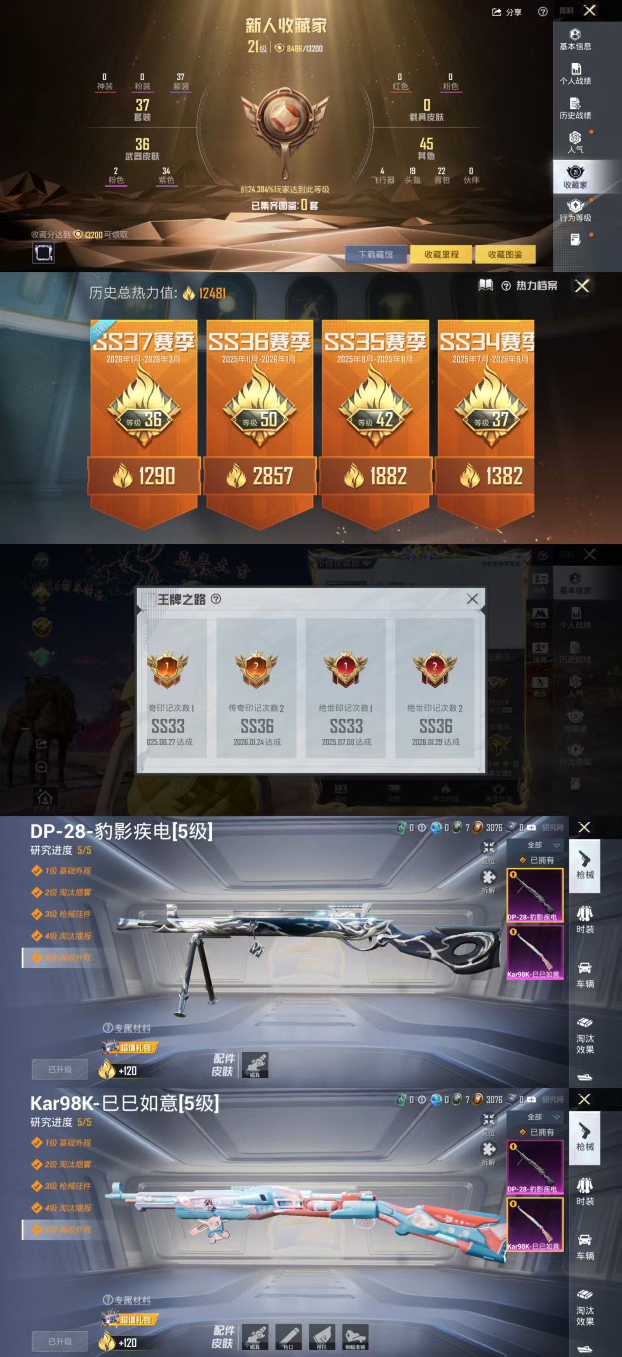 [16739345]h12633安卓q区-2特效呛-12481热力值-5王牌印记-37套装-43呛皮【特效呛等级】:kar98k-巳巳如意五级kar98k-巳巳如意【优质武器皮肤】: kar98k-巳巳如意【稀有武器皮肤】: dbs-乌木金纹 scar-l-海盐豹豹 kar98k-巳巳如意 蜜獾-乌木金纹 m416-蓝色火焰 akm-龙的传人 m16a4-幻世战舞者 aug-耀粉歌者 m762-天降萌叽 m24-炫彩节奏 uzi-啾咪啾咪 ump45-蓝色火焰 汤姆逊-天降萌叽 dbs-第五大道