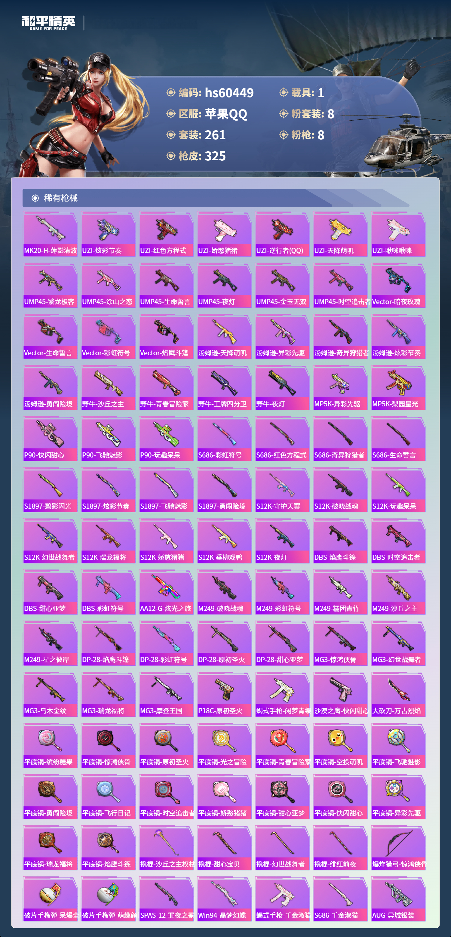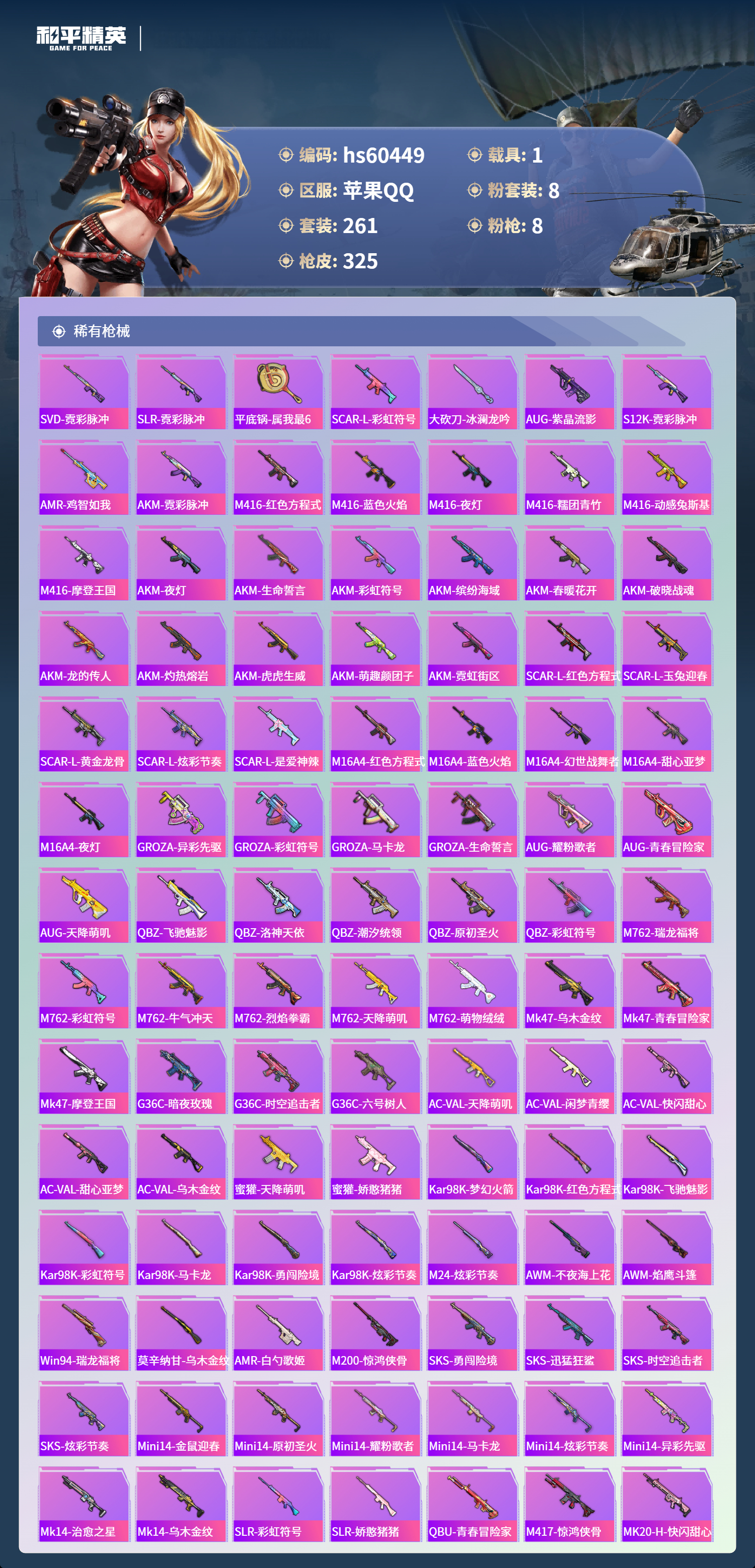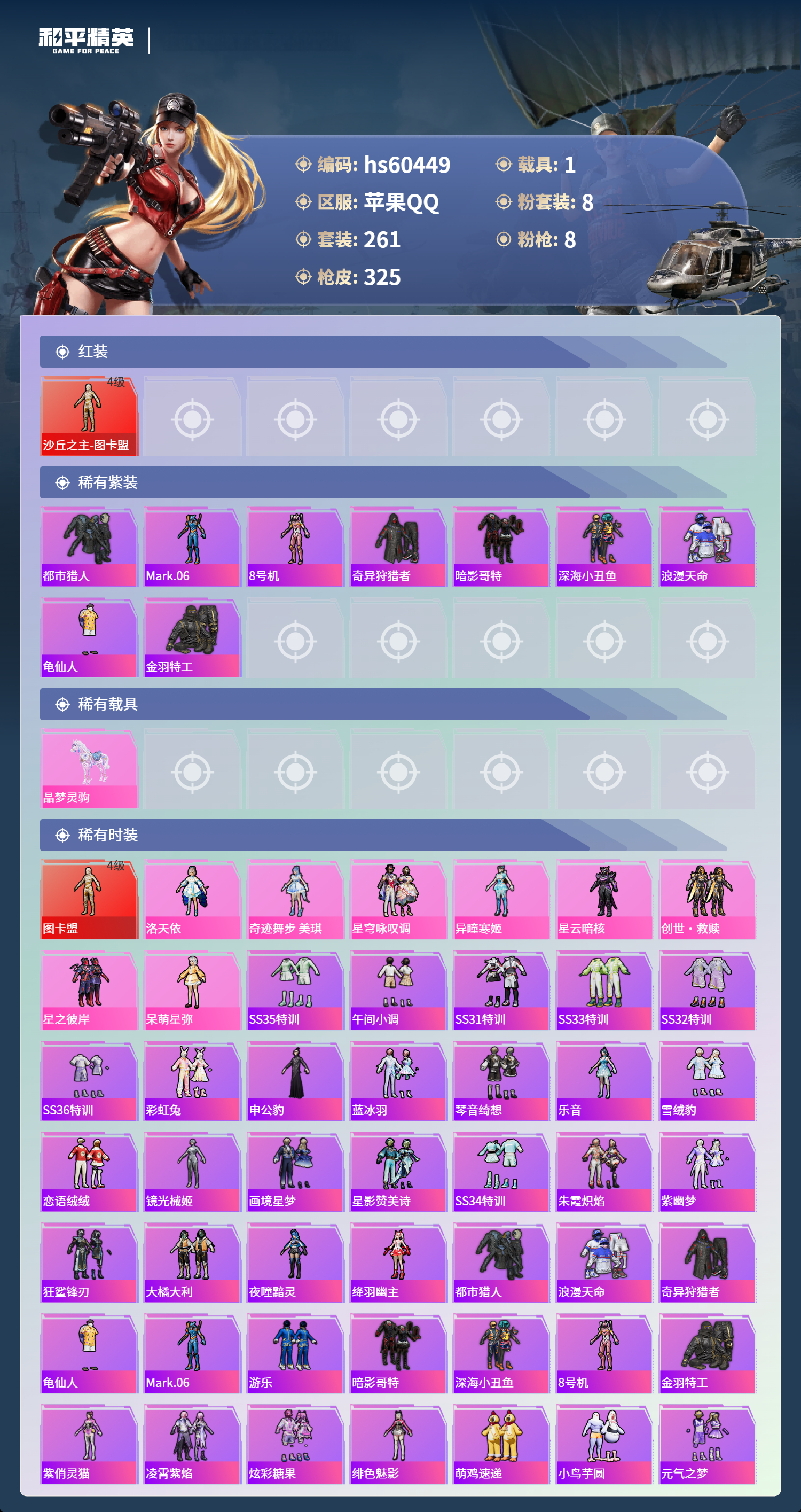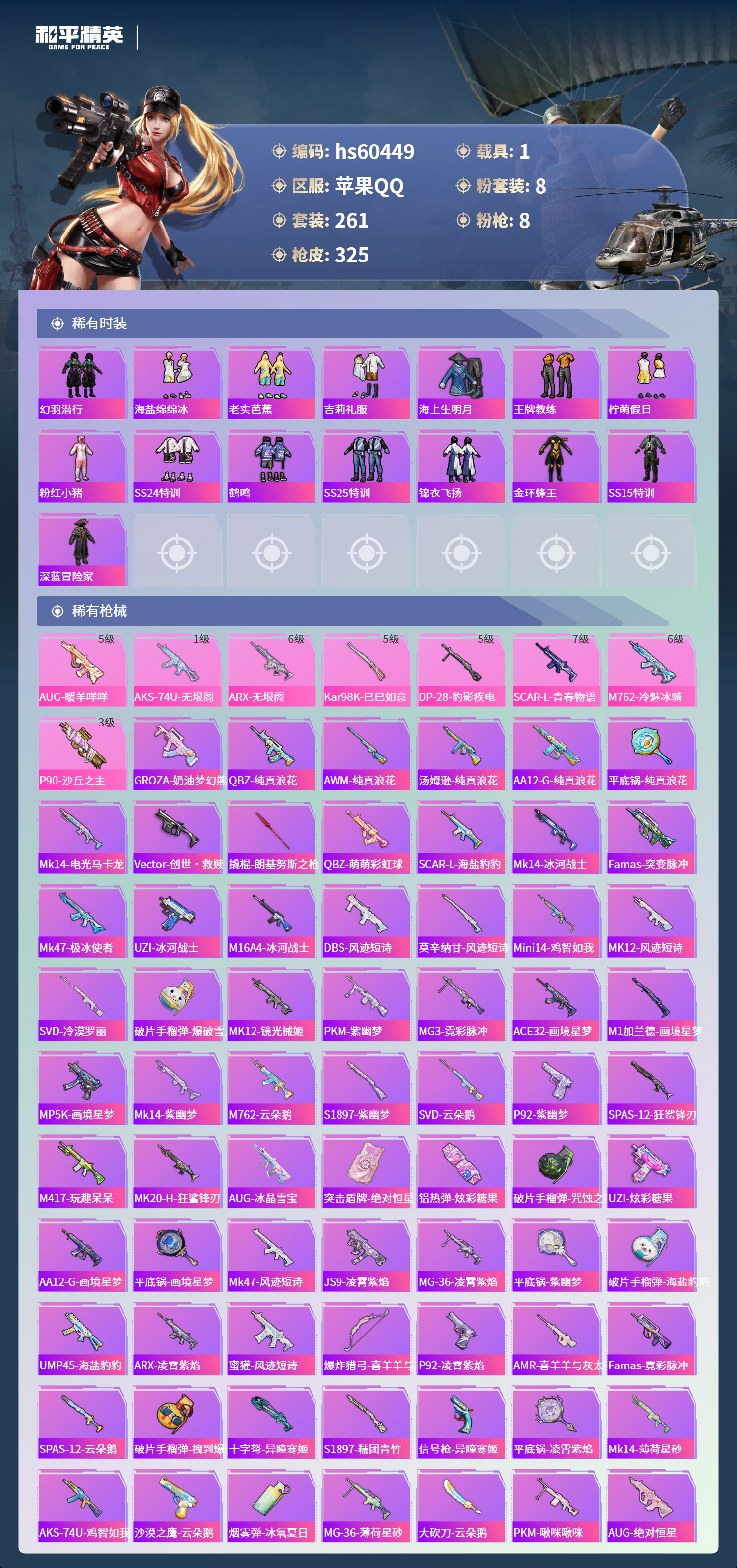 hs60449 苹果手q-19王牌印记-1红装-8粉装-8特效呛-1载具-热力值-261套装-325呛皮-4卓越印记【1红装】沙丘之主-图卡盟/4级【8粉装】角色-洛天依套装-创世·救赎角色-星云暗核套装-星穹咏叹调角色-呆萌星弥套装-星之彼岸角色-异瞳寒姬角色-奇迹舞步 美琪【8特效呛】aks-74u-无垠阁/1级scar-l-青春物语/7级kar98k-巳巳